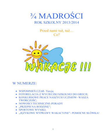 ¾ MADROŚCI ROK SZKOLNY 2013/2014 Przed nami tuż, tuż… Co? W NUMERZE: WSPOMNIEŃ CZAR- Turcja; FOTORELACJA Z WYCIECZKI SZKOLNEJ DO GRECJI; KONKURSOWE PRACE NASZYCH UCZNIÓW- WASZA TWÓRCZOŚĆ; NOWOŚCI TECHNICZNE-PORADY „PRZEPIS NA RODZINĘ”; SPORTOWE WYNIKI; „JĘZYKOWE WYPRAWY WAKACYJNE”- POMOCNE SŁÓWKA! 1 WSPOMNIEŃ CZAR- Turcja Wspomnienia z dalekiego wschodu, czyli Turcji do której udała się grupa nauczycieli i uczniów z Zespołu Szkół w Białce w ramach realizacji projektu Comenius. W podróży do egzotycznego kraju- Turcji na czwarte spotkanie krajów partnerskich projektu Comenius wzięli udział: dyrektor Zespołu Szkół w Białce Ewa Hutniczak, nauczyciel języka angielskiego w Zespole Szkół w Białce i koordynator projektu Comenius- Natalia Majchrzak, Beata Święch- Wieczorek- nauczyciel plastyki i muzyki w ZS w Białce oraz uczniowie Gimnazjum w Białce: Karolina Sala, Paulina Słowik, Martyna Tempka, Sabina Włoch, Paweł Kutek. Podróż do Turcji rozpoczęliśmy 3 maja 2014 r. z lotniska w Krakowie. Po długiej podróży samolotem w końcu dotarliśmy do stolicy Turcji Ankary, skąd udaliśmy się czekającym już na nas busem do miejscowości Kayseri, w której znajduje się szkoła partnerska. Do miejsca docelowego dotarliśmy dopiero 4 maja w niedzielę nad ranem, gdzie spod szkoły partnerskiej uczniowie zostali zabrani do domów rodzin goszczących. Tutaj właśnie o 4.30 rano w niedzielę pierwszy raz usłyszeliśmy śpiewaną modlitwę, która docierała do nas z centralnego meczetu w Kayseri przez kolejne dni naszego pobytu w Turcji. Poniedziałek był dniem pełnym wrażeń. Początkowo w szkole partnerskiej nastąpiło uroczyste powitanie gości przez władze lokalne i dyrektora szkoły. Następnie wspólnie z nauczycielami z Turcji, Rumunii i Hiszpanii (Katalonii) obejrzeliśmy występy artystyczne, przygotowane przez uczniów ze szkoły partnerskiej pod nadzorem nauczycieli . Występy te były bardzo atrakcyjne, a tancerze ubrani byli w niezwykłe, kolorowe tradycyjne stroje Tureckie. W późniejszej części dnia wzięliśmy udział w zajęciach artystycznych przygotowanych przez bardzo kreatywną i utalentowaną nauczycielkę sztuki. Podczas tych zajęć uczniowie i nauczyciele tworzyli tzw. „Marbling Art”, polegające na tworzeniu obrazów na wodzie specjalnymi farbami. Zajęcia te związane były z tematyką projektu, dlatego też zadaniem uczestników było tworzenie malowideł związanych z przyrodą. Warsztaty artystyczne były bardzo interesujące zarówno dla uczniów jak i nauczycieli. Po powrocie uczniów do domów rodzin goszczących, nauczyciele kontynuowali swoją pracę uczestnicząc w seminarium, na którym omówiono korzyści z prowadzenia zajęć projektowych w bibliotece i pracowni komputerowej, wymieniono się doświadczeniami i swoimi pomysłami odnośnie realizacji tych zadań. Wieczorem uczniowie uczestniczyli w kolacjach powitalnych przygotowanych przez swoje rodziny goszczące. 2 We wtorek 6 maja zwiedzaliśmy szkołę partnerską ADVIYE-AHMET EMINOGLU ILKOGRETIM OKULU w Kayseri. Wspólnie z uczniami obserwowaliśmy lekcje takie jak zajęcia komputerowe, język turecki, chemia, zajęcia w przedszkolu i inne. W tym dniu odbyły się również planowane konkursy : recytatorski i turniej sportowy oraz prezentacje power point na temat tradycyjnych uroczystości obchodzonych w każdym z krajów partnerskich. Wieczorem uczniowie mieli okazje podziwiać piękno miejscowości Kayseri wraz z ich rodzinami goszczącymi z Turcji, a nauczyciele z gospodarzami wizyty. W środę nauczyciele uczestniczyli w warsztatach i seminarium poświęconym tematyce projektu, wymianie doświadczeń , dobrych praktyk i metod pracy z uczniami oraz ich postępu. Omówiona została realizacja działań projektowych przez każdy z krajów partnerskich. Uczniowie podczas tego dnia uczestniczyli w zajęciach lekcyjnych wraz ze swoimi kolegami lub koleżankami, którzy ich gościli. Uczniowie ćwiczyli umiejętność komunikowania się w języku angielskim podczas rozmów polegających na dzieleniu się doświadczeniami i porównywaniu swoich systemów edukacji. W kolejnych dniach zwiedzaliśmy: Erciyes, malowniczą Kapadocję, Kozakli oraz miejscowość Yahyali. Podczas wycieczek nie tylko zwiedzaliśmy miejsca dziedzictwa kulturowego Turcji, lecz również w plenerze wspólnie czytaliśmy poezje z różnych krajów partnerskich, interpretowaliśmy wybrane wiersze anglojęzyczne i polskie związane z tematyką projektu. W niedzielę 11 maja o 6.30 rano pożegnaliśmy Kayseri i jak to bywa przy rozstaniach i tutaj nie obeszło się bez płaczu uczniów, którzy zawiązali nowe przyjaźnie z rodzinami goszczącymi i nie tylko. Po długich pożegnaniach polska grupa udała się na lotnisko w Ankarze. W niedzielę uczniowie i nauczyciele wylądowali w Krakowie szczęśliwi… pełni cudownych wspomnień… fotografii… wzbogaceni o wiedzę w zakresie dziedzictwa kulturowego Turcji…zauroczeni naturą i poezją w języku polskim i angielskim… same korzyści…! Autor tekstu: BEATA ŚWIĘCH- WIECZOREK, nauczyciel w Zespole Szkół w Białce (miałam tę przyjemność brać udział w realizacji projektu Comenius, i wyjeździe niezwykłego miejsca gdzie łączą się dwie kultury: Orient i Europa, Wschód i Zachód) 3 do Turcji, 4 FOTORELACJA Z WYCIECZKI SZKOLNEJ DO GRECJI Akropol Meteory 5 Skhiatos Pomnik Leonidasa w Termopilach 6 KONKURSOWE PRACE NASZYCH UCZNIÓW W RAMACH II EDYCJI POWIATOWEGO KONKURSU LITERACKIEGO "PO CO PISAĆ DO SZUFLADY..." pod patronatem stowarzyszenia Twórczego Artystyczno Literackiego z siedzibą w Krakowie powstało kilka interesujących prac. Pragniemy poinformować Was, ze tytuł wicemistrza prozy zdobył NIKODEM MROWIEC, uczeń klasy VI. Z przyjemnością prezentujemy jego pracę. „Legenda o złotym rycerzu co w podziemiach Tatr czeka.” Nikodem Mrowiec, kl. VI Młody chłopak, którego będzie dotyczyła ta opow