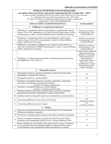 Załącznik nr 1 do uchwały nr 33/o/05/2013 WYKAZ PUNKTOWANYCH OSIĄGNIĘĆ do Ankiety Okresowej Oceny Nauczyciela Akademickiego PK w latach 2013 – 2014*) (w opracowaniach współautorskich liczbę punktów należy dzielić przez liczbę autorów) *) w odniesieniu do prof. tytularnych ankieta za okres 2011-2014 W wykazie dorobku są uwzględniane publikacje pracowników z afiliacją PK zamieszczone w bazie danych Biblioteki PK DZIAŁALNOŚĆ NAUKOWO-BADAWCZA 1. Liczba punktów Publikacje w czasopismach naukowych 1 Publikacja w czasopiśmie naukowym posiadającym współczynnik wpływu Impact Factor (IF), znajdującym się w bazie Journal Citation Reports (JCR), wymienionym w części A wykazu Ministra Nauki i Szkolnictwa Wyższego Punktacja wg wykazu A obowiązującego w roku wydania publikacji 2 Publikacja w czasopiśmie naukowym nieposiadającym współczynnika wpływu Impact Factor (IF), wymienionym w części B wykazu Ministra Nauki i Szkolnictwa Wyższego Punktacja wg wykazu B obowiązującego w roku wydania publikacji 3 Publikacja w czasopiśmie znajdującym się w bazie European Reference Index for the Humanities (ERIH), wymienionym w części C wykazu Ministra Nauki i Szkolnictwa Wyższego Punktacja wg wykazu C obowiązującego w roku wydania publikacji 4 Publikacja w recenzowanych materiałach z konferencji międzynarodowej, uwzględnionej w Web of Science 2. Liczba punktów odpowiada najwyżej punktowanej publikacji w czasopiśmie naukowym krajowym nieposiadającym współczynnika wpływu Impact Factor (IF), wymienionym w wykazie Ministra Nauki i Szkolnictwa Wyższego Monografie naukowe 5 Monografia naukowa w językach: angielskim, niemieckim, francuskim, hiszpańskim, rosyjskim lub włoskim 25 6 Monografia naukowa w języku polskim 20 7 Rozdział w monografii naukowej w językach: angielskim, niemieckim, francuskim, hiszpańskim, rosyjskim lub włoskim 5 (rozdział = 0,5 arkusza wydawniczego) 8 Rozdział w monografii naukowej w języku polskim (rozdział = 0,5 arkusza wydawniczego) 4 9 Redakcja naukowa monografii wieloautorskiej w językach: angielskim, niemieckim, francuskim, hiszpańskim, rosyjskim lub włoskim 5 10 Redakcja naukowa monografii naukowej wieloautorskiej w języku polskim 4 11 Cytowania publikacji (wg bazy Web of Knowledge) (za każde cytowanie) 12 Cytowania publikacji (wg bazy Scopus) (za każde cytowanie) 13 Patent na wynalazek udzielony przez Urząd Patentowy Rzeczypospolitej Polskiej lub udzielony za granicą 25 14 Wdrożenie wynalazku (punktowane jest tylko jedno wdrożenie wynalazku) 25 15 Patent na wynalazek udzielony za granicą lub udzielony przez Urząd Patentowy Rzeczypospolitej Polskiej na rzecz innego podmiotu niż PK 15 16 Prawa ochronne na wzór użytkowy lub znak towarowy, prawa z rejestracji wzoru przemysłowego lub topografii układu scalonego, udzielone przez Urząd Patentowy Rzeczypospolitej Polskiej lub udzielone za granicą 10 3. 0,2 0,1 Patenty 1 Załącznik nr 1 do uchwały nr 33/o/05/2013 17 18 19 Zastosowanie wzoru (punktowane jest tylko jedno zastosowanie wzoru) Wykorzystane autorskie prawa majątkowe do utworu z zakresu architektury i urbanistyki lub sztuk projektowych (brane jest pod uwagę jest tylko jedno zastosowanie) Zgłoszenie wynalazku w Urzędzie Patentowym Rzeczypospolitej Polskiej lub za granicą 4. 10 10 2 Dorobek artystyczny i projektowy (dot.: dyscyplin „architektura i urbanistyka” oraz „sztuki projektowe”) 20 21 22 23 Autorska realizacja dzieła plastycznego (realizacje w przestrzeni publicznej, realizacje multimedialne, cykle prac malarskich, rzeźbiarskich, dzieła konserwatorskie wraz z dokumentacją oraz projekty konserwatorskie) upublicznionego i rozpowszechnianego za granicą Autorska realizacja dzieła plastycznego (realizacje w przestrzeni publicznej, realizacje multimedialne, cykle prac malarskich, rzeźbiarskich, dzieła konserwatorskie wraz z dokumentacją oraz projekty konserwatorskie) upublicznionego i rozpowszechnianego w Polsce Autorstwo mniejszych dzieł plastycznych rozpowszechnianych za granicą (jak w pkt.18) Autorstwo mniejszych dzieł plastycznych rozpowszechnianych w Polsce (jak w pkt.19) 25 12 12 12 24 Indywidualna, premierowa wystawa plastyczna za granicą 20 25 Indywidualna, premierowa wystawa plastyczna w Polsce 10 26 27 28 29 30 Udział w zbiorowej wystawie plastycznej, udział w realizacji dzieła konserwatorskiego za granicą Udział w zbiorowej wystawie plastycznej, udział w realizacji dzieła konserwatorskiego w Polsce Realizacja autorskich projektów użytkowych z zakresu architektury i urbanistyki, konserwacji zabytków architektury i urbanistyki, architektury krajobrazu i sztuki ogrodowej) Kolejne realizacje wystaw dzieł plastycznych, projektów użytkowych w kraju lub za granicą Inne osiągnięcia projektowe, nagrody i wyróżnienia w konkursach, wystawach 4 2 15 5 5 0,2 31 Cytowania publikacji (wg bazy Web of Knowledge) (za każde cytowanie) 32 Cytowania publikacji (wg bazy Scopus) (za każde cytowanie) 5. 33 34 35 36 37 38 39 0,1 Rozwój kadry naukowej Uzyskanie stopnia naukowego doktora lub doktora sztuki (liczbę punktów zwiększa się 5 za stopień doktora uzyskany przed 30 rokiem życia) Uzyskanie stopnia naukowego doktora habilitowanego lub stopnia doktora habilitowanego sztuki (liczbę punktów zwiększa się o 5 za stopień doktora habilitowanego lub stopień doktora habilitowanego sztuki uzyskany przed ukończeniem 40 roku życia) Uzyskanie tytułu naukowego profesora lub tytułu profesora sztuki (liczbę punktów zwiększa się o 5 za tytuł naukowy profesora lub tytuł profesora sztuki uzyskany przed ukończeniem 45 roku życia) Promotor przewodu doktorskiego, zakończonego uchwałą w sprawie nadania stopnia naukowego doktora Recenzja pracy doktorskiej Recenzja pracy habilitacyjnej lub dorobku w przewodzie habilitacyjnym Opinia do tytułu naukowego profesora 15 (20) 25 (30) 40 (45) 6 3 5 5 2 Załącznik nr 1 do uchwały nr 33/o/05/2013 40 41 Inne opinie wyk