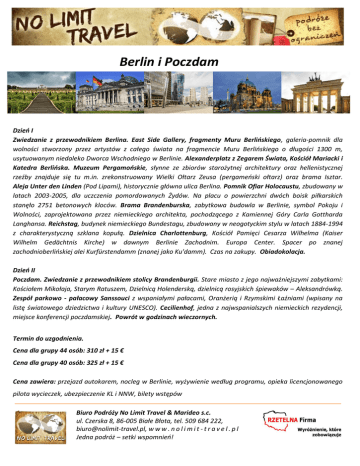 Berlin i Poczdam Dzień I Zwiedzanie z przewodnikiem Berlina. East Side Gallery, fragmenty Muru Berlińskiego, galeria-pomnik dla wolności stworzony przez artystów z całego świata na fragmencie Muru Berlińskiego o długości 1300 m, usytuowanym niedaleko Dworca Wschodniego w Berlinie. Alexanderplatz z Zegarem Świata, Kościół Mariacki i Katedra Berlińska. Muzeum Pergamońskie, słynne ze zbiorów starożytnej architektury oraz hellenistycznej rzeźby znajduje się tu m.in. zrekonstruowany Wielki Ołtarz Zeusa (pergameński ołtarz) oraz brama Isztar. Aleja Unter den Linden (Pod Lipami), historycznie główna ulica Berlina. Pomnik Ofiar Holocaustu, zbudowany w latach 2003-2005, dla uczczenia pomordowanych Żydów. Na placu o powierzchni dwóch boisk piłkarskich stanęło 2751 betonowych kloców. Brama Brandenburska, zabytkowa budowla w Berlinie, symbol Pokoju i Wolności, zaprojektowana przez niemieckiego architekta, pochodzącego z Kamiennej Góry Carla Gottharda Langhansa. Reichstag, budynek niemieckiego Bundestagu, zbudowany w neogotyckim stylu w latach 1884-1994 z charakterystyczną szklana kopułą. Dzielnica Charlottenburg, Kościół Pamięci Cesarza Wilhelma (Kaiser Wilhelm Gedächtnis Kirche) w dawnym Berlinie Zachodnim. Europa Center. Spacer po znanej zachodnioberlińskiej alei Kurfürstendamm (znanej jako Ku'damm). Czas na zakupy. Obiadokolacja. Dzień II Poczdam. Zwiedzanie z przewodnikiem stolicy Brandenburgii. Stare miasto z jego najważniejszymi zabytkami: Kościołem Mikołaja, Starym Ratuszem, Dzielnicą Holenderską, dzielnicą rosyjskich śpiewaków – Aleksandrówką. Zespół parkowo - pałacowy Sanssouci z wspaniałymi pałacami, Oranżerią i Rzymskimi Łaźniami (wpisany na listę światowego dziedzictwa i kultury UNESCO). Cecilienhof, jedna z najwspanialszych niemieckich rezydencji, miejsce konferencji poczdamskiej. Powrót w godzinach wieczornych. Termin do uzgodnienia. Cena dla grupy 44 osób: 310 zł + 15 € Cena dla grupy 40 osób: 325 zł + 15 € Cena zawiera: przejazd autokarem, nocleg w Berlinie, wyżywienie według programu, opieka licencjonowanego pilota wycieczek, ubezpieczenie KL i NNW, bilety wstępów Biuro Podróży No Limit Travel & Marideo s.c. ul. Czerska 8, 86-005 Białe Błota, tel. 509 684 222, [email protected], w w w . n o l i m i t - t r a v e l . p l Jedna podróż – setki wspomnień!