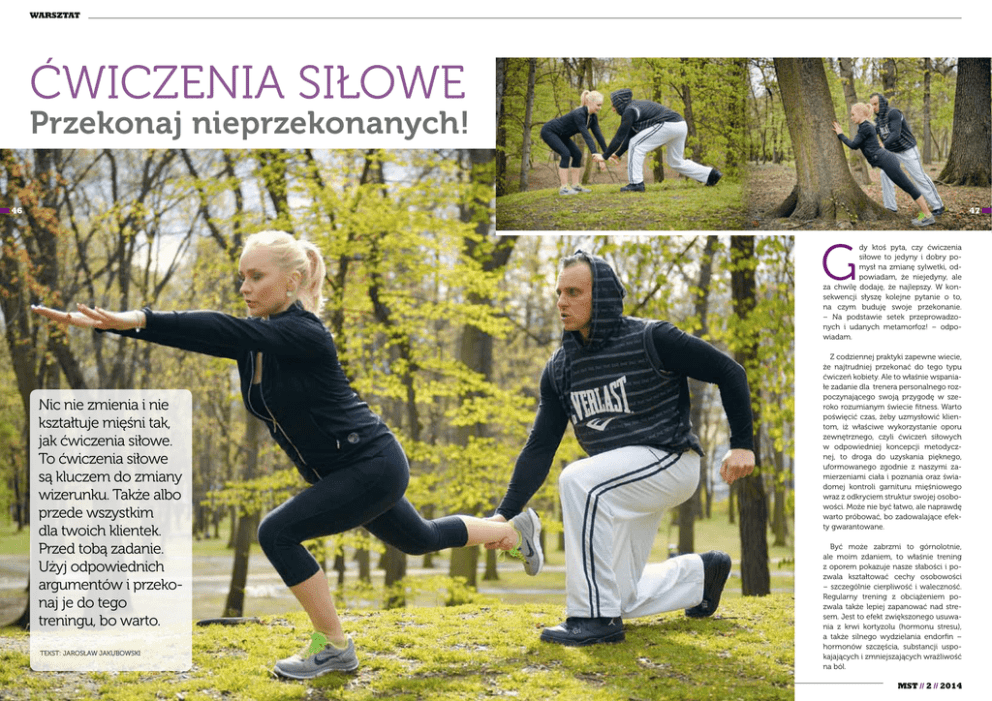 warsztat Ćwiczenia siłowe Przekonaj nieprzekonanych! 46 47 G dy ktoś pyta, czy ćwiczenia siłowe to jedyny i dobry pomysł na zmianę sylwetki, odpowiadam, że niejedyny, ale za chwilę dodaję, że najlepszy. W konsekwencji słyszę kolejne pytanie o to, na czym buduję swoje przekonanie. − Na podstawie setek przeprowadzonych i udanych metamorfoz! – odpowiadam. Nic nie zmienia i nie kształtuje mięśni tak, jak ćwiczenia siłowe. To ćwiczenia siłowe są kluczem do zmiany wizerunku. Także albo przede wszystkim dla twoich klientek. Przed tobą zadanie. Użyj odpowiednich argumentów i przekonaj je do tego treningu, bo warto. Tekst: Jarosław Jakubowski Z codziennej praktyki zapewne wiecie, że najtrudniej przekonać do tego typu ćwiczeń kobiety. Ale to właśnie wspaniałe zadanie dla trenera personalnego rozpoczynającego swoją przygodę w szeroko rozumianym świecie fitness. Warto poświęcić czas, żeby uzmysłowić klientom, iż właściwe wykorzystanie oporu zewnętrznego, czyli ćwiczeń siłowych w odpowiedniej koncepcji metodycznej, to droga do uzyskania pięknego, uformowanego zgodnie z naszymi zamierzeniami ciała i poznania oraz świadomej kontroli garnituru mięśniowego wraz z odkryciem struktur swojej osobowości. Może nie być łatwo, ale naprawdę warto próbować, bo zadowalające efekty gwarantowane. Być może zabrzmi to górnolotnie, ale moim zdaniem, to właśnie trening z oporem pokazuje nasze słabości i pozwala kształtować cechy osobowości – szczególnie cierpliwość i waleczność. Regularny trening z obciążeniem pozwala także lepiej zapanować nad stresem. Jest to efekt zwiększonego usuwania z krwi kortyzolu (hormonu stresu), a także silnego wydzielania endorfin – hormonów szczęścia, substancji uspokajających i zmniejszających wrażliwość na ból. MST // 2 // 2014 warsztat Etap I: Siła argumentów Etap II: Plan działania O ile większości mężczyzn nie trzeba przekonywać do ćwiczeń siłowych, o tyle wiele kobiet, szczególnie ze strachu, ale również w poszukiwaniu bezwysiłkowych metod poprawy własnego wizerunku, decyduje się raczej na wszelkiego typu zabiegi plastyczne, liftingi, masaże, stosowanie preparatów wyszczuplających, nie zaś na systematyczny trening z oporem. Kiedy już dostałeś szansę i możesz zacząć działać, przede wszystkim realnie oceń możliwości klientki na podstawie przeprowadzonego wywiadu oraz obserwacji podczas wejścia na salę lub w zajęć w terenie. Teraz jest moment na to, aby podjąć decyzję, jak w perspektywie czasu powinien wyglądać trening. Tymczasem nie na wiele się zdają metody powierzchownych zmian, ponieważ proces wszelkich przemian fizycz48 nych, umysłowych czy emocjonalnych rodzi się wewnątrz naszego ciała. Tak więc wbrew panującym obawom i często stereotypowym poglądom, regularny wysiłek siłowy jest jak dotąd jedną z najlepszych metod treningu, korygujących kształt kobiecego ciała. Oprócz tego służy także poprawie zdrowia, zwiększaniu sprawności fizycznej i psychicznej. Kobieta zdobywając to wszystko, zdobywa piękno, wdzięk i urodę. Świadoma zaś swej atrakcyjności wyrabia w sobie szacunek do samej siebie oraz zwiększa poczucie własnej wartości. Rozmawiając z klientkami w ten sposób, pokazując im, ile mogą zyskać, niczym nie ryzykując, możecie promować ćwiczenia siłowe wśród pań. Co powiedzieć, aby zyskać akceptację potencjalnej klientki i otrzymać szansę na wprowadzenie jej w świat ćwiczeń siłowych? Trener powinien najpierw wysłuchać, czego oczekuje i jakie marzenia ma klientka względem swojego ciała. Dokonując pomiarów składu ciała i obwodów jest w stanie odnieść się do oczekiwań, ponieważ uwarunkowania osobnicze dotyczące budowy ciała zdradzają predyspozycje do osiągania w łatwiejszy lub trudniejszy sposób oczekiwanych efektów. Następny krok to prezentacja kolejnych etapów treningu. Przez cały czas trener powinien odwoływać się do marzeń klientki, mówić o efektach, które zostaną osiągnięte, jeśli tylko wszystko będzie przebiegać tak, jak zaproponował. Musi to zabrzmieć na tyle obiecująco, żeby klientka chciała wejść na salę, by zrealizować pierwszy trening. Jeśli ci się uda doprowadzić do pierwszego treningu, pamiętaj, że klientka zapamięta cię z właśnie z niego. To trochę tak, jak z pierwszym wrażeniem – nie jesteś w stanie zrobić go dwukrotnie. Osobiście preferuję mocne akcenty. Często nie tylko zachwalam, ale wręcz przechwalam możliwości wykorzystania różnego rodzaju ćwiczeń siłowych. Pamiętaj również, że ty jesteś dla klientki autorytetem. Przekonuj własnym wyglądem i doświadczeniem, mów o wypróbowanych na sobie różnych metodach treningowych. Trzeba zaplanować go w postaci mikro-, makro- lub mezocyklu. Określ, w jakim czasie zamierzasz uzyskać pożądane efekty i później sam poddawaj się weryfikacji w tym zakresie. Pamiętaj, że musisz stale analizować przebieg treningu i obserwować zmienne w nim występujące związane z postępami lub regresem osoby trenującej. Istotne będzie również dokonywanie pomiarów lub robienie dokumentacji zdjęciowej i dzielenie się nimi z klientką. Chcąc efektywnie pracować z klientką, zwracaj uwagę na to, by być empatycznym i wspierającym. Twarde dowody Przypominam sobie jak 7 lat temu przekonywałem Asię, którą zaprosiłem na sesję zdjęciową do tego artykułu, że musi spróbować treningu siłowego i że to dla niej najlepsza droga do zadbania o siebie. Była oporna, nie wierzyła i wciąż powtarzała, że przytyje… Dziś patrzycie na czterdziestolatkę − specjalnie i oczywiście za zgodą Asi używam jej wieku − która przekonała się, że to właśnie opór zewnętrzny spowodował, że zmieniła się nie do poznania. Dziś wychodzimy w teren. Opór zewnętrzny będę przykładał moimi dłońmi. Nie potrzebuję hantli, sztang, ławeczek, maszyn, pow