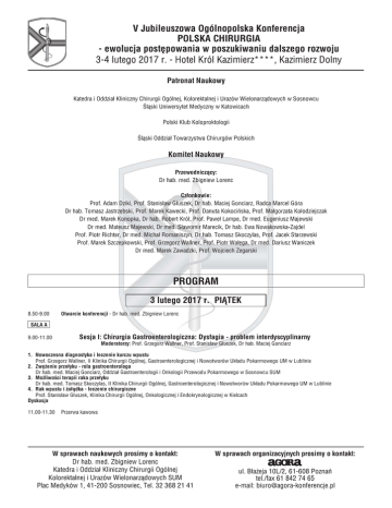 V Jubileuszowa Ogólnopolska Konferencja POLSKA CHIRURGIA - ewolucja postępowania w poszukiwaniu dalszego rozwoju 3-4 lutego 2017 r. - Hotel Król Kazimierz****, Kazimierz Dolny Patronat Naukowy Katedra i Oddział Kliniczny Chirurgii Ogólnej, Kolorektalnej i Urazów Wielonarządowych w Sosnowcu Śląski Uniwersytet Medyczny w Katowicach Polski Klub Koloproktologii Śląski Oddział Towarzystwa Chirurgów Polskich Komitet Naukowy Przewodniczący: Dr hab. med. Zbigniew Lorenc Członkowie: Prof. Adam Dziki, Prof. Stanisław Głuszek, Dr hab. Maciej Gonciarz, Radca Marcel Góra Dr hab. Tomasz Jastrzębski, Prof. Marek Kawecki, Prof. Danuta Kokocińska, Prof. Małgorzata Kołodziejczak Dr med. Marek Konopka, Dr hab. Robert Król, Prof. Paweł Lampe, Dr med. Eugeniusz Majewski Dr med. Mateusz Majewski, Dr med. Sławomir Marecik, Dr hab. Ewa Nowakowska-Zajdel Prof. Piotr Richter, Dr med. Michał Romaniszyn, Dr hab. Tomasz Skoczylas, Prof. Jacek Starzewski Prof. Marek Szczepkowski, Prof. Grzegorz Wallner, Prof. Piotr Wałęga, Dr med. Dariusz Waniczek Dr med. Marek Zawadzki, Prof. Wojciech Zegarski PROGRAM 3 lutego 2017 r. PIĄTEK 8.50-9.00 Otwarcie konferencji - Dr hab. med. Zbigniew Lorenc SALA A 9.00-11.00 Sesja I: Chirurgia Gastroenterologiczna: Dysfagia - problem interdyscyplinarny Moderatorzy: Prof. Grzegorz Wallner, Prof. Stanisław Głuszek, Dr hab. Maciej Gonciarz 1. Nowoczesna diagnostyka i leczenie kurczu wpustu Prof. Grzegorz Wallner, II Klinika Chirurgii Ogólnej, Gastroenterologicznej i Nowotworów Układu Pokarmowego UM w Lublinie 2. Zwężenie przełyku - rola gastroenterologa Dr hab. med. Maciej Gonciarz, Oddział Gastroenterologii i Onkologii Przewodu Pokarmowego w Sosnowcu SUM 3. Możliwości terapii raka przełyku Dr hab. med. Tomasz Skoczylas, II Klinika Chirurgii Ogólnej, Gastroenterologicznej i Nowotworów Układu Pokarmowego UM w Lublinie 4. Rak wpustu i żołądka - leczenie chirurgiczne Prof. Stanisław Głuszek, Klinika Chirurgii Ogólnej, Onkologicznej i Endokrynologicznej w Kielcach Dyskusja 11.00-11.30 Przerwa kawowa W sprawach naukowych prosimy o kontakt: Dr hab. med. Zbigniew Lorenc Katedra i Oddział Kliniczny Chirurgii Ogólnej Kolorektalnej i Urazów Wielonarządowych SUM Plac Medyków 1, 41-200 Sosnowiec, Tel. 32 368 21 41 W sprawach organizacyjnych prosimy o kontakt: ul. Błażeja 10L/2, 61-608 Poznań tel./fax 61 842 74 65 e-mail: [email protected] V Jubileuszowa Ogólnopolska Konferencja POLSKA CHIRURGIA - ewolucja postępowania w poszukiwaniu dalszego rozwoju 3-4 lutego 2017 r. - Hotel Król Kazimierz****, Kazimierz Dolny Sesja II: Chirurgia onkologiczna 1: Zaawansowany nowotwór w jamie brzusznej - co można zrobić? 11.30-13.30 Moderatorzy: Prof. Piotr Richter, Dr hab.Tomasz Jastrzębski, Dr hab. Robert Król 1. Znaczenie leczenia systemowego u chorych na nowotwory złośliwe z przerzutami do otrzewnej Dr hab. Ewa Nowakowska-Zajdel 2. Postępowanie chirurga w guzach nowotworowych wątroby Dr hab. Robert Król, Oddział Chirurgii Ogólnej, Naczyniowej i Transplantacyjnej Szpital Kliniczny SUM w Katowicach 3. Limfadenektomia w leczeniu nowotworów układu pokarmowego Prof. Piotr Richter, I Klinika Chirurgii Ogólnej, Onkologicznej i Gastroenterologicznej CM UJ w Krakowie 4. HIPEC - nowoczesne postępowanie w leczeniu chirurgicznym Dr hab. Tomasz Jastrzębski, Klinika Chirurgii Onkologicznej GUMed w Gdańsku Dyskusja 13.30-14.30 Przerwa lunchowa Sesja III: Niuanse leczenia operacyjnego: Jak ja to robię? 14.30-16.30 Moderatorzy: Prof. Paweł Lampe, Prof. Jacek Starzewski, Prof. Wojciech Zegarski 1. Zespolenia w obrębie układu pokarmowego - praktyczne wskazówki Prof. Paweł Lampe, Oddział Chirurgii Przewodu Pokarmowego Uniwersyteckie Centrum Kliniczne SUM w Katowicach 2. Czy przecięcie zwieraczy w operacyjnym leczeniu przetoki odbytu jest bezpieczne? Prof. Jacek Starzewski, Katedra i Oddział Kliniczny Chirurgii Ogólnej, Kolorektalnej i Urazów Wielonarządowych w Sosnowcu SUM w Katowicach 3. Całkowite wycięcie mesocolon w raku okrężnicy Prof. Adam Dziki, Klinika Chirurgii Ogólnej i Kolorektalnej UM w Łodzi 4. Skomplikowana przetoka odbytu-prezentacja przypadków Prof. Małgorzata Kołodziejczak, Warszawski Ośrodek Proktologii, Szpital Świętej Elżbiety w Warszawie 5. Przednia resekcja odbytnicy z dostępu laparoskopowego Prof. Wojciech Zegarski, Katedra Chirurgii Onkologicznej CM UMK w Bydgoszczy Dyskusja Sesja IV: Prawnicza Lekarz na rynku usług medycznych - aspekty prawne 16.30-17.00 Moderator: Radca prawny Marcel Góra 17.00-18.00 Zebranie Zarządu Polskiego Klubu Koloproktologii SALA B Sesja V: Karl Storz - warsztaty chirurgiczne: Przezodbytnicze operacje endoskopowe 10.00-13.00 Moderatorzy: Prof. Piotr Wałęga, Dr med. Michał Romaniszyn Sesja VI: Pielęgniarska 15.00-18.00 20.00 Spotkanie towarzyskie W sprawach naukowych prosimy o kontakt: Dr hab. med. Zbigniew Lorenc Katedra i Oddział Kliniczny Chirurgii Ogólnej Kolorektalnej i Urazów Wielonarządowych SUM Plac Medyków 1, 41-200 Sosnowiec, Tel. 32 368 21 41 W sprawach organizacyjnych prosimy o kontakt: ul. Błażeja 10L/2, 61-608 Poznań tel./fax 61 842 74 65 e-mail: [email protected] V Jubileuszowa Ogólnopolska Konferencja POLSKA CHIRURGIA - ewolucja postępowania w poszukiwaniu dalszego rozwoju 3-4 lutego 2017 r. - Hotel Król Kazimierz****, Kazimierz Dolny 4 lutego 2017 r. SOBOTA Sesja VII: Postępy w diagnostyce i leczeniu 9.00-11.00 Moderatorzy: Prof. Danuta Kokocińska, Prof. Piotr Wałęga, Prof. Marek Kawecki 1. Oczekiwania chirurga od radiologa w nowoczesnej diagnostyce obrazowej Dr med. Marek Konopka, SCANIX Katowice 2. Personalizacja leczenia onkologicznego Prof. Danuta Kokocińska, Katedra Anestezjologii, Intensywnej Terapii i Medycyny Ratunkowej Wydziału Lekarskiego z Oddziałem Lekarsko-Dentystycznym w Zabrzu SUM w Katowicach 3. Ocena aparatu zwieraczowego odbytnicy przed operacją proktologiczną Prof. Piotr Wałęsa, III Katedra Chirurgii CM UJ w Krakowie 4. 