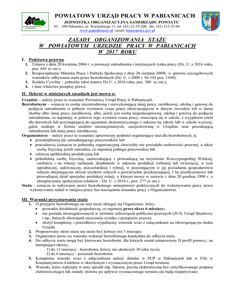 POWIATOWY URZĄD PRACY W PABIANICACH JEDNOSTKA ORGANIZACYJNA SAMORZĄDU POWIATU 95 – 200 Pabianice, ul. Waryńskiego 11, tel. (42) 22-54-200, fax. (42) 215-23-00 www.puppabianice.pl email: [email protected] ZASADY ORGANIZOWANIA STAŻU W POWIATOWYM URZĘDZIE PRACY W PABIANICACH W 2017 ROKU I. Podstawa prawna 1. Ustawa z dnia 20 kwietnia 2004 r. o promocji zatrudnienia i instytucjach rynku pracy (Dz. U. z 2016 roku, poz. 645 ze zm.); 2. Rozporządzenie Ministra Pracy i Polityki Społecznej z dnia 20 sierpnia 2009r. w sprawie szczegółowych warunków odbywania stażu przez bezrobotnych (Dz. U. z 2009 r. Nr 142 poz. 1160); 3. Kodeks Cywilny – jednolity tekst ustawy Dz.U. z 2016 roku, poz. 380 ze zm.); 4. i inne właściwe przepisy prawa. II. Ilekroć w niniejszych zasadach jest mowa o: Urzędzie – należy przez to rozumieć Powiatowy Urząd Pracy w Pabianicach. Bezrobotnym – oznacza to osobę niezatrudnioną i niewykonującą innej pracy zarobkowej, zdolną i gotową do podjęcia zatrudnienia w pełnym wymiarze czasu pracy obowiązującym w danym zawodzie lub w danej służbie albo innej pracy zarobkowej, albo, jeżeli jest osobą niepełnosprawną, zdolną i gotową do podjęcia zatrudnienia, co najmniej, w połowie tego wymiaru czasu pracy, nieuczącą się w szkole, z wyjątkiem szkół dla dorosłych lub przystępującej do egzaminu eksternistycznego z zakresu tej szkoły lub w szkole wyższej, gdzie studiuje w formie studiów niestacjonarnych, zarejestrowaną w Urzędzie oraz poszukującą zatrudnienia lub innej pracy zarobkowej. Organizatorze – należy przez to rozumieć uprawniony podmiot organizujący staż dla bezrobotnych, tj. przedsiębiorcę nie zatrudniającego pracowników lub pracodawcę (oznacza to jednostkę organizacyjną chociażby nie posiadała osobowości prawnej, a także osobę fizyczną, jeżeli zatrudnia, co najmniej jednego pracownika) lub rolniczą spółdzielnię produkcyjną lub pełnoletnią osobę fizyczną, zamieszkującą i prowadzącą na terytorium Rzeczypospolitej Polskiej, osobiście i na własny rachunek, działalność w zakresie produkcji roślinnej lub zwierzęcej, w tym ogrodniczej, sadowniczej, pszczelarskiej i rybnej, w pozostającym w jej posiadaniu gospodarstwie rolnym obejmującym obszar użytków rolnych o powierzchni przekraczającej 2 ha przeliczeniowe lub prowadzącej dział specjalny produkcji rolnej, o którym mowa w ustawie z dnia 20 grudnia 1990 r. o ubezpieczeniu społecznym rolników - Dz. U. z 2016 r., poz. 277 ze zm.). Stażu - oznacza to nabywanie przez bezrobotnego umiejętności praktycznych do wykonywania pracy przez wykonywanie zadań w miejscu pracy bez nawiązania stosunku pracy z Organizatorem. III. Warunki przyznawania stażu 1. O przyjęcie bezrobotnego na staż może ubiegać się Organizator, który: prowadzi działalność gospodarczą, co najmniej przez okres 6 miesięcy; nie posiada nieuregulowanych w terminie zobowiązań publiczno-prawnych (ZUS, Urząd Skarbowy i itp., których obowiązek uiszczenia wynika z przepisów prawa); złożył kompletny i prawidłowo wypełniony wniosek wraz z załącznikami na obowiązującym druku Urzędu. 2. Proponowany okres stażu nie może być krótszy niż 3 miesiące. 3. Organizator może we wniosku wskazać bezrobotnego kandydata do odbycia stażu. 4. Do odbycia stażu mogą być kierowani bezrobotni, dla których został ustanowiony II profil pomocy, na następujące okresy: 1) do 12 miesięcy - bezrobotni, którzy nie ukończyli 30 roku życia; 2) do 6 miesięcy - pozostali bezrobotni. 5. Kompletne wnioski wraz z załącznikami należy składać w PUP w Pabianicach lub w Filii w Konstantynowie Łódzkim w określonym i wyznaczonym przez Urząd terminie. 6. Wnioski, które wpłynęły w inny sposób (np. faksem, pocztą elektroniczną bez certyfikowanego podpisu elektronicznego) lub zostały złożone po upływie wyznaczonego terminu nie będą rozpatrywane. 7. Wnioski należy składać wyłącznie w formie pisemnej na obowiązującym w PUP w Pabianicach druku. Do wniosku dołącza się wymienione w nim załączniki, przy czym kserokopie muszą być poświadczone za zgodność z oryginałem przez organizatora stażu. 8. Wniosek powinien być wypełniony w sposób czytelny i kompletny. 9. Urząd najpóźniej w terminie miesiąca od dnia otrzymania wniosku informuje Organizatora pisemnie o sposobie jego rozpatrzenia. Złożenie wniosku niekompletnego lub wypełnionego nieczytelnie spowoduje wydłużenie jego rozpatrzenia bądź odmowę w przypadku braku uzupełnienia w wyznaczonym przez Urząd terminie. 10. Może nastąpić czasowe zaprzestanie przyznawania staży na określonych stanowiskach wynikające z aktualnej nadwyżki ofert pracy lub ograniczenia środków finansowych. 11. Nie przewiduje się organizacji stażu na stanowiska: sprzątaczka, szatniarz, kierowca, pracownik gospodarczy oraz w lokalach przeznaczonych na cele mieszkalne organizatora, osoby kierowanej na staż lub innych osób fizycznych, chyba że została zapewniona odrębność pomieszczenia przeznaczonego wyłącznie do odbywania stażu. 12. Do Organizatora nie może być skierowana na staż osoba bezrobotna: dla której nie został ustalony profil pomocy albo został ustalony I lub III profil pomocy, będąca współmałżonkiem Organizatora stażu lub współmałżonkiem wspólnika spółki prawa cywilnego, wspólnika spółki osobowej, wspólnika albo członka zarządu w spółce kapitałowej, która w ostatnim roku przerwała staż z przyczyn nieusprawiedliwionych, która - w okresie 1 roku przed dniem złożenia wniosku - była zatrudniona u Organizatora na podstawie umowy o pracę lub umowy cywilnoprawnej; spokrewniona w pierwszym stopniu pokrewieństwa w linii prostej z Organizatorem stażu lub wspólnikiem spółki prawa cywilnego, wspólnikiem spółki osobowej, wspólnikiem albo członkiem zarządu w spółce kapitałowej. 13. Przy rozpatrywaniu wniosku bierze się pod uwagę racjonalnoś