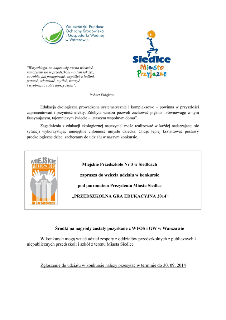 "Wszystkiego, co naprawdę trzeba wiedzieć, nauczyłem się w przedszkolu - o tym jak żyć, co robić, jak postępować, współżyć z ludźmi, patrzeć, odczuwać, myśleć, marzyć i wyobrażać sobie lepszy świat". Robert Fulghum Edukacja ekologiczna prowadzona systematycznie i kompleksowo – powinna w przyszłości zaprocentować i przynieść efekty. Zdobyta wiedza pozwoli zachować piękno i równowagę w tym fascynującym, tajemniczym świecie – „naszym wspólnym domu”. Zagadnienia z edukacji ekologicznej nauczyciel może realizować w każdej nadarzającej się sytuacji wykorzystując umiejętnie chłonność umysłu dziecka. Chcąc lepiej kształtować postawy proekologiczne dzieci zachęcamy do udziału w naszym konkursie. Miejskie Przedszkole Nr 3 w Siedlcach zaprasza do wzięcia udziału w konkursie pod patronatem Prezydenta Miasta Siedlce „PRZEDSZKOLNA GRA EDUKACYJNA 2014” Środki na nagrody zostały pozyskane z WFOŚ i GW w Warszawie W konkursie mogą wziąć udział zespoły z oddziałów przedszkolnych z publicznych i niepublicznych przedszkoli i szkół z terenu Miasta Siedlce Zgłoszenie do udziału w konkursie należy przesyłać w terminie do 30. 09. 2014 Tematem gry będzie ekologia Konkurs przebiegać będzie w dwóch etapach. I - wykonanie pracy plastycznej z surowców wtórnych nt. ,,Drugie życie plastikowej butelki”. Pracę opatrzoną metryczką należy dostarczyć do organizatora najpóźniej do 10.10.2014 r. II - quiz wiedzy ekologicznej, który odbędzie się w Miejskim Przedszkolu Nr 3 w Siedlcach dn. 17.10.2014 o godzi 14.00. Weźmie w nim udział 12 zespołów z placówek, które prace zostały ocenione najwyżej. Szczegóły konkursu znajdują się w regulaminie. Adres placówki : Miejskie Przedszkole Nr 3 w Siedlcach ul. Batorego 4 08-110 Siedlce Email: [email protected] tel 25 7943545, 25 7943446 Osoby odpowiedzialne za organizację: 1. Karolina Klimczyk 2. Monika Olędzka 3. Małgorzata Gil
