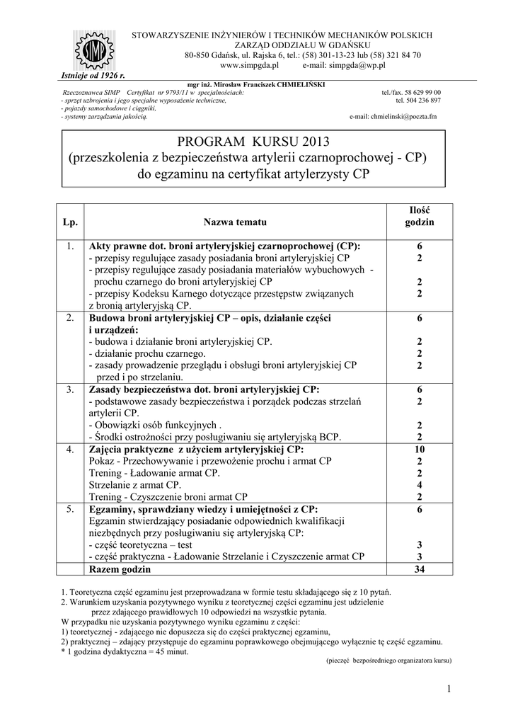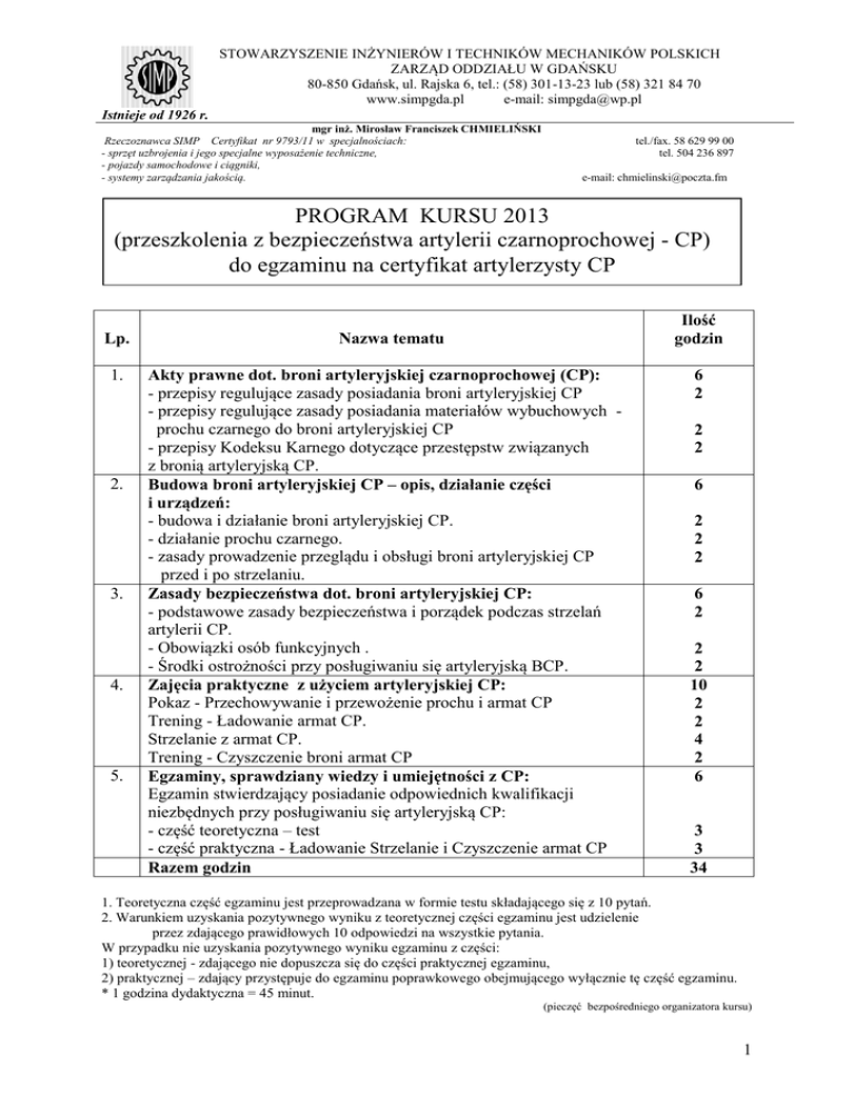 STOWARZYSZENIE INŻYNIERÓW I TECHNIKÓW MECHANIKÓW POLSKICH ZARZĄD ODDZIAŁU W GDAŃSKU 80-850 Gdańsk, ul. Rajska 6, tel.: (58) 301-13-23 lub (58) 321 84 70 www.simpgda.pl e-mail: [email protected] Istnieje od 1926 r. mgr inż. Mirosław Franciszek CHMIELIŃSKI Rzeczoznawca SIMP Certyfikat nr 9793/11 w specjalnościach: - sprzęt uzbrojenia i jego specjalne wyposażenie techniczne, - pojazdy samochodowe i ciągniki, - systemy zarządzania jakością. tel./fax. 58 629 99 00 tel. 504 236 897 e-mail: [email protected] PROGRAM KURSU 2013 (przeszkolenia z bezpieczeństwa artylerii czarnoprochowej - CP) do egzaminu na certyfikat artylerzysty CP Lp. 1. 2. 3. 4. 5. Ilość godzin Nazwa tematu Akty prawne dot. broni artyleryjskiej czarnoprochowej (CP): - przepisy regulujące zasady posiadania broni artyleryjskiej CP - przepisy regulujące zasady posiadania materiałów wybuchowych prochu czarnego do broni artyleryjskiej CP - przepisy Kodeksu Karnego dotyczące przestępstw związanych z bronią artyleryjską CP. Budowa broni artyleryjskiej CP – opis, działanie części i urządzeń: - budowa i działanie broni artyleryjskiej CP. - działanie prochu czarnego. - zasady prowadzenie przeglądu i obsługi broni artyleryjskiej CP przed i po strzelaniu. Zasady bezpieczeństwa dot. broni artyleryjskiej CP: - podstawowe zasady bezpieczeństwa i porządek podczas strzelań artylerii CP. - Obowiązki osób funkcyjnych . - Środki ostrożności przy posługiwaniu się artyleryjską BCP. Zajęcia praktyczne z użyciem artyleryjskiej CP: Pokaz - Przechowywanie i przewożenie prochu i armat CP Trening - Ładowanie armat CP. Strzelanie z armat CP. Trening - Czyszczenie broni armat CP Egzaminy, sprawdziany wiedzy i umiejętności z CP: Egzamin stwierdzający posiadanie odpowiednich kwalifikacji niezbędnych przy posługiwaniu się artyleryjską CP: - część teoretyczna – test - część praktyczna - Ładowanie Strzelanie i Czyszczenie armat CP Razem godzin 6 2 2 2 6 2 2 2 6 2 2 2 10 2 2 4 2 6 3 3 34 1. Teoretyczna część egzaminu jest przeprowadzana w formie testu składającego się z 10 pytań. 2. Warunkiem uzyskania pozytywnego wyniku z teoretycznej części egzaminu jest udzielenie przez zdającego prawidłowych 10 odpowiedzi na wszystkie pytania. W przypadku nie uzyskania pozytywnego wyniku egzaminu z części: 1) teoretycznej - zdającego nie dopuszcza się do części praktycznej egzaminu, 2) praktycznej – zdający przystępuje do egzaminu poprawkowego obejmującego wyłącznie tę część egzaminu. * 1 godzina dydaktyczna = 45 minut. (pieczęć bezpośredniego organizatora kursu) 1 STOWARZYSZENIE INŻYNIERÓW I TECHNIKÓW MECHANIKÓW POLSKICH ZARZĄD ODDZIAŁU W GDAŃSKU 80-850 Gdańsk, ul. Rajska 6, tel.: (58) 301-13-23 lub (58) 321 84 70 www.simpgda.pl e-mail: [email protected] Istnieje od 1926 r. mgr inż. Mirosław Franciszek CHMIELIŃSKI Rzeczoznawca SIMP Certyfikat nr 9793/11 w specjalnościach: - sprzęt uzbrojenia i jego specjalne wyposażenie techniczne, - pojazdy samochodowe i ciągniki, - systemy zarządzania jakością. tel./fax. 58 629 99 00 tel. 504 236 897 e-mail: [email protected] CEL KURSU ARTYLERII CP 2013 (przeszkolenia z bezpieczeństwa artylerii czarnoprochowej - CP) do egzaminu na patent artylerzysty CP CEL KURSU ARTYLERII CP Celem kursu artylerzysty CP jest wyposażenie uczestników-słuchaczy kursu w wiedzę i umiejętności z zakresu objętego egzaminem, a ponadto przeszkolenie w zakresie umiejętności i bezpieczeństwa strzelania z broni artyleryjskiej CP. UCZESTNICY KURSU ARTYLERII CP Uczestnikiem kursu może być każdy, spełniający wymagania stawiane osobom ubiegającym się o uzyskanie certyfikatu artylerzysty CP. Proszę ze sobą przynieść dowody osobiste. Każdy brat po ukończeniu kursu otrzyma: 1. Patent 2. Legitymację 3. Odznakę artylerzysty nadaną z patentem przez Zjednoczenie. 3. CD z materiałami ze szkolenia Każdy Brat, zostanie (po przeszkoleniu i złożeniu egzaminu) upoważniony do obsługi broni artyleryjskiej CP w całym jej zakresie. Uroczyste wręczenie powyższych dokumentów i odznaki nastąpi w czasie pokazu artylerii, po złożeniu ślubowania. PROGRAM KURSU ARTYLERII CP Program kursu obejmuje: obowiązujące elementy prawa dot. broni artyleryjskiej CP; zasady bezpieczeństwa przy obchodzeniu się z bronią artyleryjską CP; podział ogólna budowa, zasady działania broni artyleryjskiej CP; zasady bezpiecznego strzelania z broni artyleryjskiej CP; praktyczny egzamin z broni artyleryjskiej CP. Kurs kończy się egzaminem pisemnym (testy) zgodnie z przepisami szkoleń wojskowych. (dokumentacja kursu jest archiwizowana). CZAS TRWANIA KURSU - Ostrów Wlkp. Termin: od 28.09.2013 r. godz. 8.00-19.00 do 29.09.2013 r. godz. 8.00-15.00 MIEJSCE ORGANIZACJI KURSU – Ostrów Wlkp. Siedziba: 63-400 Ostrów Wlkp. ul. Limanowskiego 134 (restauracja „Borowianka”) 2 STOWARZYSZENIE INŻYNIERÓW I TECHNIKÓW MECHANIKÓW POLSKICH ZARZĄD ODDZIAŁU W GDAŃSKU 80-850 Gdańsk, ul. Rajska 6, tel.: (58) 301-13-23 lub (58) 321 84 70 www.simpgda.pl e-mail: [email protected] Istnieje od 1926 r. mgr inż. Mirosław Franciszek CHMIELIŃSKI Rzeczoznawca SIMP Certyfikat nr 9793/11 w specjalnościach: - sprzęt uzbrojenia i jego specjalne wyposażenie techniczne, - pojazdy samochodowe i ciągniki, - systemy zarządzania jakością. tel./fax. 58 629 99 00 tel. 504 236 897 e-mail: [email protected] CZAS TRWANIA KURSU KRAKÓW Termin: od 19.10.2013 r. godz. 8.00-19.00 do 20.10.2013 r. godz. 8.00-15.00 MIEJSCE ORGANIZACJI KURSU KRAKÓW Siedziba : Celestat Bractwa 31-512 Kraków, ul. Topolowa 3; tel. / fax 012 421 19 99 Polecane noclegi - Hotel Polonia (będą negocjowane ceny we wrześniu). 3