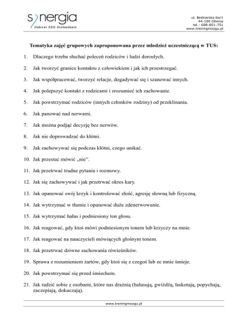 ul. Bednarska 6a/1 44-100 Gliwice tel.: 698-851-751 www:treningmozgu.pl Tematyka zajęć grupowych zaproponowana przez młodzież uczestniczącą w TUS: 1. Dlaczego trzeba słuchać poleceń rodziców i ludzi dorosłych. 2. Jak tworzyć granice kontaktu z człowiekiem i jak ich przestrzegać. 3. Jak współpracować, tworzyć relacje, dogadywać się i szanować innych. 4. Jak polepszyć kontakt z rodzicami i zrozumieć ich zachowanie. 5. Jak powstrzymać rodziców (innych członków rodziny) od przeklinania. 6. Jak panować nad nerwami. 7. Jak można podjąć decyzję bez nerwów. 8. Jak nie doprowadzać do kłótni. 9. Jak zachowywać się podczas kłótni, czego unikać. 10. Jak przestać mówić „nie”. 11. Jak przetrwać trudne pytania i rozmowy. 12. Jak się zachowywać i jak przetrwać okres kary. 13. Jak opanować swój krzyk i kontrolować złość, agresję słowną lub fizyczną. 14. Jak wytrzymać w tłumie i opanować duże zdenerwowanie. 15. Jak wytrzymać hałas i podniesiony ton głosu. 16. Jak reagować, gdy ktoś mówi podniesionym tonem lub krzyczy na mnie. 17. Jak reagować na nauczycieli mówiących głośnym tonem. 18. Jak przetrwać dziwne zachowania rówieśników. 19. Sprawa z rozumieniem żartów, gdy ktoś się z czegoś lub ze mnie śmieje. 20. Jak powstrzymać się przed śmiechem. 21. Jak radzić sobie z osobami, które nas drażnią (hałasują, gwiżdżą, łaskotają, popychają, zaczepiają, dokuczają). www.treningmozgu.pl ul. Bednarska 6a/1 44-100 Gliwice tel.: 698-851-751 www:treningmozgu.pl 22. Jak mówić o swoich uczuciach, emocjach, powodach zdenerwowania. 23. Czy można zgłaszać komunikaty za pomocą listów, gdy jest się zdenerwowanym. 24. Co to jest ignorancja. 25. W jaki sposób kogoś przeprosić za swoje złe zachowanie. 26. Jak podejść spokojnie do rozmowy z kolegami i z koleżankami. 27. Jak pomóc innym w nauce, kiedy są zdenerwowani. 28. Na jakie tematy można porozmawiać z rówieśnikami. 29. Jak zaprosić znajomego do siebie do domu. 30. Jak zaprosić kolegów na jakąś imprezę , jak organizować czas kolegom. 31. Jakie mogą być imprezy i jak je organizować (np. urodziny). 32. Jakie można dać prezenty (jakie gry, filmy można zaproponować ). 33. Jak porozmawiać z mniej znanymi osobami. 34. Jak podejść do kogoś kto Cię często obserwuje, czujesz, że Cię lubi, ale boi się podejść. 35. Czym zaimponować koleżance i jak to zrobić bez uczucia wstydu. 36. Jak zdobyć dziewczynę. 37. Jak powstrzymać się od picia słodkich napojów i jedzenia słodyczy. 38. Przyszły zawód – jak go wybrać i to osiągnąć. 39. Jak reagować i bronić się przed jedynkami. 40. Jak się uspokoić przed testem gimnazjalnym, sprawdzianem. 41. Ile czasu można spędzić przy komputerze, jak robić przerwy podczas pracy na komputerze. 42. Jak nie uzależnić się od komputera. 43. Co robić gdy nie ma się komputera, a nie chce robić się innych rzeczy. www.treningmozgu.pl ul. Bednarska 6a/1 44-100 Gliwice tel.: 698-851-751 www:treningmozgu.pl 44. Gdzie można jechać na obóz z osobami z zespołem Aspergera. 45. Jak przetrwać pierwszy raz bez rodziców na obozie i co robić, by o nich nie myśleć. 46. Jakie panują zasady na obozie. 47. Co robi się na obozie terapeutycznym. Czy jest fajnie? 48. Co zrobić, by nie bać się konia na obozie? 49. Jak udzielić I pomocy. 50. Jak się nie bać pobrania krwi. Jest to cykl spotkań po 120 minut, odbywających się raz w tygodniu. Prowadzenie (2 terapeutów na grupę): mgr Iwona Garcarz Psychologia Kliniczna, SWPS, Warszawa Psycholog, Pedagog-Terapeuta, Pedagog Specjalny, Logopeda Terapeuta Integracji Sensorycznej (SI) Terapeuta EEG-Biofeedback (BFB) 698-851-751 mgr Agnieszka Sadowska Psycholog, Uniwersytet Śląski, Katowice, Pedagog Psycholog Transportu, Uniwersytet Jagielloński, Kraków Terapeuta, Terapia Skoncentrowana na Rozwiązaniach 506-449-114 Barbara Kusto Psychologia Społeczna, Uniwersytet Opolski Psychologia Kliniczna, SWPS, Katowice (w trakcie) Dogoterapeuta, Terapeuta BFB, Terapeuta SI 667-289-145 www.treningmozgu.pl ul. Bednarska 6a/1 44-100 Gliwice tel.: 698-851-751 www:treningmozgu.pl Katarzyna Kulesza Licencjonowany Dietetyk Śląskiego Uniwersytetu Medycznego w Katowicach Specjalista ds. Psychologii Żywienia 519-730-630 Łukasz Żynda Fizjoterapeuta, Państwowa Wyższa Szkoła Zawodowa w Pile Zdrowie publiczne - studia magisterskie, Uniwersytet Medyczny w Poznaniu Fizjoterapia w kardiologii - studia podyplomowe, Uniwersytet Medyczny w Szczecinie, Instruktor Ultimate Frisbee, Terapeuta BFB, Terapeuta SI 796-337-052 Koszt spotkania: zgodnie z cennikiem ustalanym na dany rok szkolny (od września 2014r. do września 2015r.; od października 2015r. nowy cennik). Miejsce spotkań: Synergia. Gabinet EEG-Biofeedback. Diagnoza, Terapia, Konsultacje, Szkolenia. Iwona Garcarz, 44-100 Gliwice, ul. Bednarska 6a/1 Osoby zainteresowane proszę o kontakt: Iwona Garcarz, nr telefonu: 698-851-751 www.treningmozgu.pl