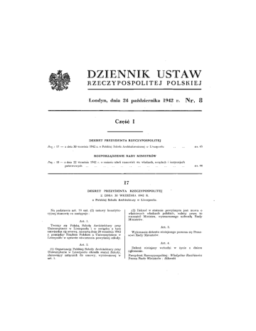 DZIENNIK USTAW RZECZYPOSPOLITEJ POLSKIEJ Londyn, dnia 24 października 1942 r. Nr. 8 Część I DEKRET PREZYDENTA Po: RZECZYPOSPOLITEJ 17 — z dnia 30 września 1942 r. o Polskiej Szkole Architektonicznej w L;vei*poolu ROZPORZĄDZENIE RADY str. 43 MINISTRÓW Po%. : 18 — z dnia 22 września 1942 r. o zmianie tabeli stanowisk we władzach, urzędach i instytucjach państwowych str. 44 17 DEKRET PREZYDENTA RZECZYPOSPOLITEJ Z DNIA 30 WRZEŚNIA 1942 R. o P o l s k i e j S z k o l e Architektury w L i v e r p o o l u . Na podstawie art. 70 ust. (2) ustawy konstytucyjnej stanowię co następuje : Art. 1. Tworzy się Polską Szkołę Architektury przy Uniwersytecie w Liverpoolu i w związku z tym zatwierdza się umowę, zawartą dnia 29 września 1942 r. pomiędzy Rządem Polskim a Uniwersytetem w Liverpoolu w sprawie utworzenia powyższej szkoły. Art. 2. (1) Organizację Polskiej Szkoły Architektury przy Uniwersytecie w Liverpoolu określa statut Szkoły, stanowiący załącznik do umowy, wymienionej w art, 1. (2) Ilekroć w statucie powyższym jest mowa o właściwych władzach polskich, należy przez to rozumieć Ministra, wyznaczonego uchwałą Rady Ministrów. Art. 3. Wykonanie dekretu niniejszego porucza się Prezesowi Rady Ministrów. Art. 4. Dekret niniejszy wchodzi ogłoszenia. w życie z dniem Prezydent Rzeczypospolitej : Władysław Raczkiewicz Prezes Rady Ministrów : Sikorski — 44 — 18 ROZPORZĄDZENIE RADY Z D N I A 22 W R Z E Ś N I A MINISTRÓW 1942 R. o z m i a n i e tabeli s t a n o w i s k w e w ł a d z a c h , urzędach, zakładach i instytucjach p a ń s t w o w y c h . Na podstawie art. 11 ust. (3) ustawy z dnia 17 lutego 1922 r. o państwowej służbie cywilnej (Dz.U.R.P. Nr. 21, poz. 1 64) zarządza się co następuje : § 1. W tabeli stanowisk dla władz, urzędów, zakładów i instytucyj państwowych, stanowiącej załącznik do rozporządzenia Rady Ministrów z dnia 19 grudnia 1933 r. (Dz.U.R.P. Nr 102, poz. 780) zmienionej rozporządzeniem Rady Ministrów z dnia 2 lipca 1936 r. (Dz.U.R.P. Nr 52, poz. 370), z dnia 21 stycznia 1937 r. (Dz.U.R.P. Nr 9, poz. 07), z dnia 12 lipca 1937 r. (Dz.U.R.P. Nr 55, poz. 431), z dnia 24 listopada 1937 r. (Dz.U.R.P. Nr 83, poz. 603), z dnia 16 lutego 1938 r. (Dz.U.R.P. Nr 13, poz. 91), z dnia 20 marca 1938 r. (Dz.U.R.P. Nr 22, poz. 195), z dnia 11 lutego 1939 r. (Dz.U.R.P. Nr. 14, poz. 79), z dnia 15 października 1941 r. (Dz.U.R.P. Nr 7, poz. 19) i z dnia 6 lipca 1942 r. (Dz.U.R.P. Nr 7, poz. 16) — wprowadza się zmianę następującą : W części dotyczącej Ministerstwa Spraw Zagrani" cznych, w rubryce „Władze i urzędy podległe" w kolejności stanowisk, oznaczonej liczbą „3" po wyrazach „Radca Ambasady" umieszcza się wyrazy „Radca Ekonomiczny" w kategorii I. Rozporządzenie dniem ogłoszenia. § 2. niniejsze wchodzi w życie z Prezes Rady Ministrów : Sikorski Część — 45 — II. Dziennik Ustaw Nr. 8 Część II DZIAŁ URZĘDOWY Zarządzenie Ministra Przemysłu, Handlu i Żeglugi z dnia 21 września 1942 r. w sprawie powołania Morskiej Komisji Wydawniczej str. 45 Komunikat o nadaniu Złotego Krzyża Zasługi str. 46 Komunikat o nadaniu Srebrnego Krzyża Zasługi str. 46 Komunikat o nadaniu Brązowego K r z y ż i Zasługi str. 47 Przemówienie Prezydenta Rzeczypospolitej wygłoszone przez radio londyńskie w dniu 1 września 1942 r. .. .. .. .. .. .. .. str. 48 Przemówienie Prezesa Rady Ministrów Gen. Sikorskiego wygłoszone przez radio londyńskie w dniu 1 września 1942 r. . . .. .. .. .. str. 50 Z Kancelarii P. Prezydenta Rzeczypospolitej str. 51 DZIAŁ NIEURZĘDOWY .. .. .. .. DZIAŁ URZĘDOWY Z A R Z Ą D Z E N I E MINISTRA PRZEMYSŁU, H A N D L U I ŻEGLUGI Z D N I A 21 W R Z E Ś N I A 1942 R w sprawie p o w o ł a n i a Morskiej Komisji W y d a w n i c z e j bierają Sekcji. 1) Przy Dziale Spraw Morskich Ministerstwa Przemysłu, Handlu i Żeglugi powołuję Morską Komisję Wydawniczą. 4) Każda Sekcja składa, się z trzech członków, fachowców danej dziedziny wiedzy, którzy wy- siebie Przewodniczącego 5) Przewodniczący Sekcji podlegają Przewodniczącemu Morskiej Komisji Wydawniczej. 2) Zadaniem Morskiej Komisji Wydawniczej jest przygotowywanie i wydawanie drukiem prac, materiałów i podręczników z zakresu wiedzy morskiej, a w szczególności wiedzy nawigacyjnej, mechanicznej oraz administracji, handlu i prawa morskiego. 3) Morska Komisja Wydawnicza składa się z trzech sekcji, a mianowicie : a) Sekcji nawigacyjnej, b) Sekcji mechanicznej, c) Sekcji administracji, handlu i prawa morskiego. z pomiędzy 6) Przewodniczącego Morskiej Komisji Wydawniczej oraz członków Sekcyj wyznacza Minister Przemysłu, Handlu i Żeglugi. 7) Stanowiska Przewodniczącego i członków Morskiej Komisji Wydawniczej są honorowe. Przysługują im jednak diety i zwrot kosztów przejazdu poniesionych w związku z pracami Komisji. i ; 8) Sposób i zakres działania Morskiej Komisji Wydawniczej określi osobny regulamin. 9) Zarządzenie niniejsze wchodzi w życie z dniem I października 1942 r. Minister Przemysłu, Handlu i Żeglugi : J. Kwapi ński Dziennik Ustaw Nr 11 — 192 — CzęśćI.Poz.23 KOMUNIKAT o nadaniu Z ł o t e g o Krzyża Zasługi Prezydent Rzeczypospolitej zarządzeniem z dnia 20 lipca 1942 r. nadał Złoty Krzyż Zasługi st. bosmanowi ś.p. Janowi Leszczyńskiemu ; | zarządzeniem z dnia 13 sierpnia 1942 r. — mjr. j pil. Stanisławowi Grodzickiemu, KOMUNIKAT o n a d a n i u Srebrnego Krzyża Z a s ł u g i Prezes Rady Ministrów zarządzeniami z dnia 17 czerwca 1941 r, nadał Srebrny Krzyż Zasługi plut. Zygmuntowi Gromkowi, kpr. Józefowi Nenko, kpr. Eugeniuszowi Lisickiemu, st.szer. Antoniemu Szczygłowi; zarządzeniem z dnia 4 .sierpnia 1941 r. — plut. Tadeuszowi Franczykowskiemu ; zarządzeniami z dnia 14 listopada 1941 r.—]>])or. Edwardowi Romanowskiemu, kpr. Tadeuszowi Borkowskiemu i kpr. Józefowi Wacławowi Wydrzyckiemu ; zarządzeniami z dnia 23 kwietnia 1942 r. —st.