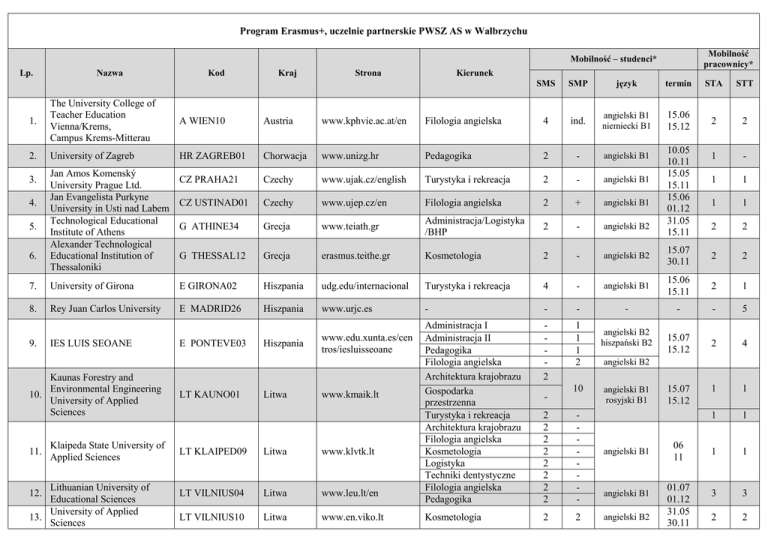 Program Erasmus+, uczelnie partnerskie PWSZ AS w Wałbrzychu Mobilność pracownicy* Mobilność – studenci* Lp. Nazwa Kod Kraj Strona Kierunek SMS SMP język termin STA STT 15.06 15.12 2 2 1 - 1 1 1 1 2 2 1. The University College of Teacher Education Vienna/Krems, Campus Krems-Mitterau A WIEN10 Austria www.kphvie.ac.at/en Filologia angielska 4 ind. angielski B1 niemiecki B1 2. University of Zagreb HR ZAGREB01 Chorwacja www.unizg.hr Pedagogika 2 - angielski B1 CZ PRAHA21 Czechy www.ujak.cz/english Turystyka i rekreacja 2 - angielski B1 CZ USTINAD01 Czechy www.ujep.cz/en Filologia angielska 2 + angielski B1 G ATHINE34 Grecja www.teiath.gr Administracja/Logistyka /BHP 2 - angielski B2 G THESSAL12 Grecja erasmus.teithe.gr Kosmetologia 2 - angielski B2 15.07 30.11 2 2 3. 4. 5. 6. Jan Amos Komenský University Prague Ltd. Jan Evangelista Purkyne University in Usti nad Labem Technological Educational Institute of Athens Alexander Technological Educational Institution of Thessaloniki 10.05 10.11 15.05 15.11 15.06 01.12 31.05 15.11 7. University of Girona E GIRONA02 Hiszpania udg.edu/internacional Turystyka i rekreacja 4 - angielski B1 15.06 15.11 2 1 8. Rey Juan Carlos University E MADRID26 Hiszpania www.urjc.es - - - - - - 5 Hiszpania www.edu.xunta.es/cen tros/iesluisseoane Administracja I Administracja II Pedagogika Filologia angielska Architektura krajobrazu Gospodarka przestrzenna Turystyka i rekreacja Architektura krajobrazu Filologia angielska Kosmetologia Logistyka Techniki dentystyczne Filologia angielska Pedagogika 2 1 1 1 2 15.07 15.12 2 4 1 1 2 2 2 2 2 2 2 2 - 1 1 1 1 3 3 Kosmetologia 2 2 2 2 9. IES LUIS SEOANE Kaunas Forestry and Environmental Engineering 10. University of Applied Sciences 11. Klaipeda State University of Applied Sciences Lithuanian University of Educational Sciences University of Applied 13. Sciences 12. E PONTEVE03 LT KAUNO01 Litwa www.kmaik.lt LT KLAIPED09 Litwa www.klvtk.lt LT VILNIUS04 Litwa www.leu.lt/en LT VILNIUS10 Litwa www.en.viko.lt - 10 angielski B2 hiszpański B2 angielski B2 angielski B1 rosyjski B1 angielski B1 angielski B1 angielski B2 15.07 15.12 06 11 01.07 01.12 31.05 30.11 International School of Law and Business Utena University of Applied 15. Sciences 14. 16. Rezekne Higher Educational Institution 17. Institute of Tourism Studies LT VILNIUS15 Litwa www.islb.eu LT UTENA01 Litwa www.utenoskolegija.lt LV REZEKNE02 Łotwa www.ru.lv/en/internati onal_office MT MALTA03 Malta www.its.edu.mt Administracja I Logistyka Logistyka Techniki dentystyczne Filologia Pedagogika Logistyka 2 2 4 4 2 2 2 - 01.06 01.12 30.06 15.12 2 2 1 1 2 2 1 1 angielski B1 31.05 30.11 2 2 Turystyka i rekreacja 1 - angielski B2 31.05 31.10 2 2 Architektura krajobrazu 2 - niemiecki B1 2 2 Logistyka 2 - angielski B1 niemiecki B1 2 2 Filologia angielska Administracja I Administracja II Filologia angielska Pedagogika Turystyka i rekreacja 2 4 4 4 4 4 + - 2 1 1 1 1 1 2 1 1 1 1 1 2 2 2 2 2 2 2 2 1 1 2 2 2 2 1 1 2 2 1 - 2 2 2 2 2 2 2 2 2 2 2 2 angielski B1 angielski B2 18. OTH Regensburg D-REGENSB02 Niemcy www.othregensburg.de 19. University of Vechta D VECHTA02 Niemcy www.uni-vechta.de/en P BRAGANC01 Portugalia www.ipb.pt P GUARDA01 Portugalia www.ipg.pt BHP 4 - portugalski A2 angielski B1 P SETUBAL 01 Portugalia www.ips.pt Logistyka 2 - angielski B1 2 2 20. Polytechnic Institute of Bragança Politechnic Institute of Guarda Polytechnic Institute of 22. Setúbal 21. angielski B1 angielski B1 RO ALBAIU01 Rumunia www.uab.ro Administracja I Architektura krajobrazu Filologia angielska Turystyka i rekreacja 24. Timisoara RO TIMISOA04 Rumunia www.upt.ro Logistyka I, II Administracja I, II 4 4 4 4 2 2 25. Slovak Medical University SK BRATISL11 Słowacja eng.szu.sk Kosmetologia 2 - angielski B1 2 - angielski B1/B2 2 2 2 - angielski B1 “1 Decembrie 1918” 23. University of Alba lulia Politehnica University angielski B1 26. Matej Bel University in Banska Bystrica SK BANSKA01 Słowacja www.umb.sk 27. Ibrahim Cecen University of Agri TR AGRI01 Turcja intooffice.agri.edu.tr TR ARTVIN01 Turcja artvin.edu.tr/eng Architektura krajobrazu 2 - angielski B1 TR IZMIR04 Turcja www.ieu.edu.tr Logistyka I, II 4 - angielski B2 TR KIRKLAR01 Turcja www.klu.edu.tr Administracja I BHP 2 2 - angielski B1 28. Artvin Coruh University 29. Izmir University of Economics 30. Kirklareli University Administracja I Administracja II Administracja I Filologia/Pedagogika Kosmetologia/ T.dent. angielski B1 30.06 31.12 15.07 15.07 15.12 05 11 30.06 30.11 30.06 15.12 15.06 15.12 31.05 31.10 15.07 15.11 15.06 15.12 31.07 15.12 30.06 15.12 01.06 01.12 31. Gaziosmanpasa University TR TOKAT01 Turcja erasmus.gop.edu.tr Filologia angielska 2 - 2 2 2 2 2 - 2 2 32. Ondokuz Mayis University TR SAMSUN01 Turcja erasmus-en.omu.edu.tr Filologia angielska Pedagogika Administracja II Turystyka i rekreacja 33. University of Foggia I FOGGIA03 Włochy www.en.unifg.it Administracja I, II 01.07 01.12 2 1 angielski B1 15.07 15.11 1 1 1 1 1 1 1 1 angielski B1 15.07 15.12 1 4 angielski C1 * SMS – wyjazdy studentów na studia, SMP – wyjazdy studentów na praktyki, STA – wyjazdy wykładowców w celu prowadzenia zajęć, STT – wyjazdy szkoleniowe pracowników