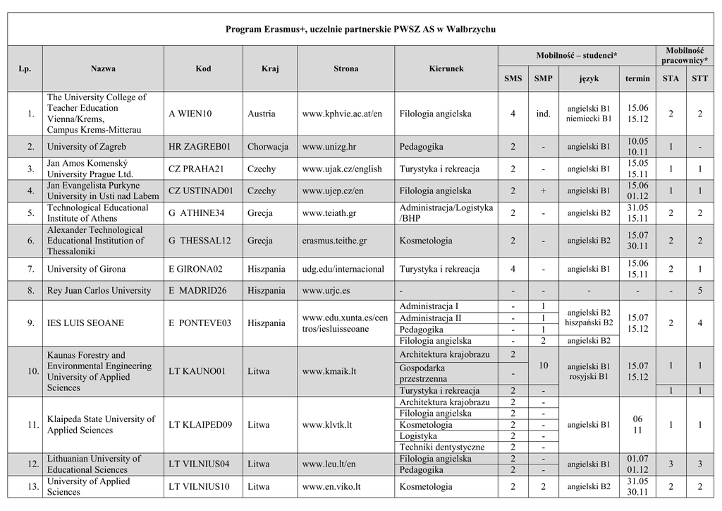ERASMUS+ uczelnie partnerskie 2016-2017