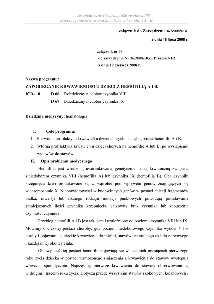 Terapeutyczne Programy Zdrowotne 2008 Zapobieganie krwawieniom u dzieci z hemofilią A i B. załącznik do Zarządzenia 47/2008/DGL z dnia 18 lipca 2008 r. załącznik nr 33 do zarządzenia Nr 36/2008/DGL Prezesa NFZ z dnia 19 czerwca 2008 r. Nazwa programu: ZAPOBIEGANIE KRWAWIENIOM U DZIECI Z HEMOFILIĄ A I B. ICD- 10 D 66 Dziedziczny niedobór czynnika VIII D 67 Dziedziczny niedobór czynnika IX Dziedzina medycyny: hematologia I. Cele programu: 1. Pierwotna profilaktyka krwawień u dzieci chorych na ciężką postać hemofilii A i B. 2. Wtórna profilaktyka krwawień u dzieci chorych na hemofilię A lub B, po wystąpieniu wylewów do stawów. II. Opis problemu medycznego Hemofilia jest wrodzoną uwarunkowaną genetycznie skazą krwotoczną związaną z niedoborem czynnika VIII (hemofilia A) lub czynnika IX (hemofilia B). Oba czynniki krzepnięcia krwi produkowane są w wątrobie pod wpływem genów znajdujących się w chromosomie X. Nieprawidłowości w budowie tych genów w postaci delecji fragmentów białka, inwersji lub różnego rodzaju mutacji punktowych powodują powstawanie zmniejszonych ilości czynnika krzepnięcia, całkowity brak czynnika lub zaburzenia czynności czynnika. Przebieg hemofilii A i B jest taki sam i uzależniony od poziomu czynnika VIII lub IX. Mówimy o ciężkiej postaci choroby, gdy poziom niedoborowego czynnika wynosi ≤ 1% normy i objawami są ciężkie krwawienia do mięśni, stawów, centralnego układu nerwowego i każdej innej okolicy ciała. Objawy ciężkiej postaci hemofilii pojawiają się w ostatnich miesiącach pierwszego roku życia dziecka w postaci wzmożonego siniaczenia a krwawienia do stawów występują wówczas sporadycznie. Najczęściej pierwsze krwawienia do stawów obserwowane są w drugim i trzecim roku życia. Dotyczą przede wszystkim stawów skokowych, kolanowych i 1 Terapeutyczne Programy Zdrowotne 2008 Zapobieganie krwawieniom u dzieci z hemofilią A i B. łokciowych. U nastolatków dołączają się krwawienia do stawów biodrowych i barkowych. Rozpoczęty proces niszczenia stawu wskutek pojawiających się wylewów krwi postępuje szybko po każdym kolejnym krwawieniu i jest nieodwracalny. Nierzadko już trzyczteroletnie dzieci po kilku przebytych krwawieniach do stawu mają klinicznie zmieniony staw, utykają, mają nieprawidłowy zakres ruchomości stawu. Artropatia hemofilowa rozwija się przede wszystkim u chorych na ciężką postać choroby. Sporadycznie jednak może wystąpić również w umiarkowanie ciężkiej postaci hemofilii. Leczenie hemofilii polega na dożylnym podawaniu preparatów zawierających czynnik VIII lub czynnik IX w odpowiedniej dawce dostosowanej do masy ciała chorego. Wczesne leczenie krwawień do stawów poprawia sprawność ruchową chorych na hemofilię, jednak powtarzające się wylewy krwi uszkadzają je i również doprowadzają do poważnych zmian nawet już u dzieci. Poprzez stosowanie wczesnej profilaktyki, można skutecznie zapobiec artropatii hemofilowej oraz innym poważnym krwawieniom. Jak dowiodła praktyka, dzieci które otrzymują profilaktycznie koncentraty czynników krzepnięcia w sposób ciągły, chodzą normalnie do szkoły, uczestniczą w grach i zabawach rówieśników, nie różnią się zewnętrznie niczym od swoich kolegów. W Polsce zarejestrowanych jest 2118 chorych na hemofilię A, w tym 1139 chorych na postać ciężką. Chorych na hemofilię B jest 363, wśród nich 179 ma ciężką postać choroby. Są to dane z rejestru prowadzonego przez Instytut Hematologii i Transfuzjologii w Warszawie. Według danych Katedry i Kliniki Pediatrii, Hematologii i Onkologii Warszawskiego Uniwersytetu Medycznego zarejestrowano 304 chorych na ciężką postać hemofilii A i 52 chorych na ciężką postać hemofilii B do 18 roku życia. Baza obejmuje także 34 pacjentów z inhibitorem. Dane te nie są pełne, niedoszacowanie wynosi około 10 – 15%. Profilaktyka u najmłodszych dzieci wiąże się często z koniecznością założenia dojścia do żyły centralnej, czyli vascuportu, ponieważ tak częste nakłuwanie żyły obwodowej może być niezwykle trudne lub wręcz niemożliwe. Zabieg ten wymaga podawania koncentratu czynnika VIII lub IX, aby zapewnić prawidłową hemostazę przez 6 dni i przy zdjęciu szwów. 2 Terapeutyczne Programy Zdrowotne 2008 Zapobieganie krwawieniom u dzieci z hemofilią A i B. III. Opis programu 1. Substancje czynne finansowane w ramach programu: Koncentraty czynników krzepnięcia VIII i IX. Opis działania leku Leczenie ma charakter substytucyjny. 2. Kryteria włączenia do programu. Profilaktyka pierwotna - dzieci od 1 dnia życia do ukończenia 18 roku życia z ciężką postacią hemofilii A lub B, o poziomie aktywności czynników krzepnięcia VIII lub IX równym lub poniżej 1% poziomu normalnego. Profilaktyka wtórna - dzieci od 1 dnia życia do ukończenia 18 roku, chore na hemofilię A lub B, po wystąpieniu wylewów do stawów. 3. Schemat podawania leku: Profilaktyka: 25 – 40 jednostek / kg mc. ⎯ Od 2 do 3 razy w tygodniu - czynnik VIII; ⎯ 2 razy w tygodniu - czynnik IX. Profilaktyka wtórna: 25 – 40 jednostek / kg mc. ⎯ Od 2 do 3 razy w tygodniu - czynnik VIII; ⎯ 2 razy w tygodniu - czynnik IX. U dzieci u których konieczne jest założenie centralnego dostępu żylnego, zapewnienie czynnika VIII lub IX do zabiegu, według schematu: ⎯ Pierwsza doba: 40 do 70 jednostek / kg mc co 8 godzin ⎯ Druga do piątej doby: 30 do 50 jednostek / kg mc co 12 godzin ⎯ Szósta doba jednorazowo: 30 do 50 jednostek / kg mc ⎯ Dziesiąta doba ( zdjęcie szwów) jednorazowo: 30 do 50 jednostek / kg mc 3 Terapeutyczne Programy Zdrowotne 2008 Zapobieganie krwawieniom u dzieci z hemofilią A i B. Kwalifikacja do leczenia w ramach programu W ramach kwalifikacji chorego do udziału w programie konieczne jest wykonanie następujących badań: Koagulogram, Oznaczenie czynników krzepnięcia, Test na antykoagulant, Oznaczenie miana antykoagulant