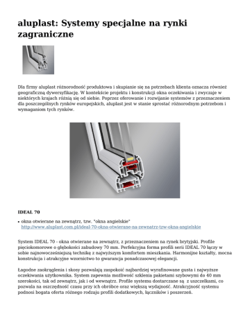 aluplast: Systemy specjalne na rynki zagraniczne Dla firmy aluplast różnorodność produktowa i skupianie się na potrzebach klienta oznacza również geograficzną dywersyfikację. W kontekście projektu i konstrukcji okna oczekiwania i zwyczaje w niektórych krajach różnią się od siebie. Poprzez oferowanie i rozwijanie systemów z przeznaczeniem dla poszczególnych rynków europejskich, aluplast jest w stanie sprostać różnorodnym potrzebom i wymaganiom tych rynków. IDEAL 70 ● okna otwierane na zewnątrz, tzw. "okna angielskie" http://www.aluplast.com.pl/ideal-70-okna-otwierane-na-zewnatrz-tzw-okna-angielskie System IDEAL 70 - okna otwierane na zewnątrz, z przeznaczeniem na rynek brytyjski. Profile pięciokomorowe o głębokości zabudowy 70 mm. Perfekcyjna forma profili serii IDEAL 70 łączy w sobie najnowocześniejszą technikę z najwyższym komfortem mieszkania. Harmonijne kształty, mocna konstrukcja i atrakcyjne wzornictwo to gwarancja ponadczasowej elegancji. Łagodne zaokrąglenia i skosy pozwalają zaspokoić najbardziej wyrafinowane gusta i najwyższe oczekiwania użytkownika. System zapewnia możliwość szklenia pakietami szybowymi do 40 mm szerokości, tak od zewnątrz, jak i od wewnątrz. Profile systemu dostarczane są z uszczelkami, co pozwala na oszczędność czasu przy ich obróbce oraz większą wydajność. Atrakcyjność systemu podnosi bogata oferta różnego rodzaju profili dodatkowych, łączników i poszerzeń. Systemy okienny IDEAL 70 posiada wszelkie niezbędne dokumenty dopuszczające go do stosowania i obrotu na terenie Wielkiej Brytanii, w tym niezwykle ceniony i popularny wśród Brytyjczyków certyfikat Kitemark, potwierdzający zgodność towaru z tamtejszymi normami. Wydawany jest on przez British Standards Institution. Blockprofile NL ● "okna holenderskie"http://www.aluplast.com.pl/blockprofile-nl-okna-holenderskie System zaprojektowany dla rynku holenderskiego o głębokości zabudowy 120 mm. System BLOCKPROFIL NL służy do budowy okien "holenderskich". Systemy Blockprofili wyróżniają się zastosowaniem ościeżnic o szerokości 120 mm, które mogą być łączone z różnymi wariantami skrzydeł (niezlicowanych, półzlicowanych i zlicowanych) o szerokości 70 mm. Zbrojenia stalowe o dużych gabarytach umożliwiają konstruowanie dużych okien, przy zachowaniu wymagań statycznych. Bardzo szerokie ościeżnice, zaopatrzone w zewnętrzne przylgi umożliwiają w łatwy i estetyczny sposób montaż okien w budynku wykonanym z cegły licowej (klinkieru) bez dodatkowej obróbki murarskiej. W skład systemu wchodzą również profile do konstruowania okien i drzwi otwieranych na zewnątrz, umieszczonych w jednej ramie z kwaterami stało szklonymi lub otwieranymi do środka. Dodatkowym elementem wyróżniającymi system Blockprofili NL jest kolorystyka. Profile tego pakietu poza standardowym białym kolorem (9016) oraz okleiną dekoracyjną występują w kolorze kremowym (9001) często wymaganym przez klientów. Nord-Line ● okna otwierane na zewnątrz, tzw. "okna skandynawskie" http://www.aluplast.com.pl/nord-line-okna-otwierane-na-zewnatrz-okna-skandynawskie System Nord-line służy do budowy tzw. "okien skandynawskich" otwieranych na zewnątrz. Charakterystyczną cechą systemu Nord-line opartego na profilach o wąskiej powierzchni czołowej jest sposób otwierania okien na zewnątrz. Jest to charakterystyczne szczególnie dla stylu budownictwa rynków skandynawskich, a napierający na skrzydła wiatr dociska je zapewniając zwiększenie szczelności. Dodatkowo sposób otwierania na zewnątrz pozwala na oszczędność miejsca w pomieszczeniu. Ościeżnica posiada szerokość zabudowy 120 mm, natomiast skrzydło 70mm. Słupki i poprzeczki charakteryzują się specjalnym, ozdobnym kształtem od strony pomieszczenia. System cechuje nowoczesna stylistyka z delikatnymi skosami i zaokrągleniami. System Nordline umożliwia stosowanie pakietów szybowych o grubości do 41 mm. Zbrojenie o dużym przekroju zwiększa stabilność okien. System profili Nord-line zapewnia możliwość wykonania konstrukcji okiennych o róznych typach otwierania skrzydeł, charakterystycznych dla rynku skandynawskiego : rozwierne (SIDE HUNG), wychylne (TOP HUNG),obracane w pionie (SIDE SWING ) oraz w poziomie (TOP SWING). System Monoblock ● tzw. "okna francuskie"http://www.aluplast.com.pl/system-monoblock-tzw-okna-francuskie Ramy typu Monoblock przeznaczone są do budowy okien, które montowane są w warstwie ocieplenia. Duża gama szerokości ram Monoblock pozwala na odpowiedni ich dobór w zależności od grubości ocieplenia.Ramy typu Monoblock przeznaczone są do budowy okien, które montowane są w warstwie ocieplenia. Duża gama szerokości ram Monoblock pozwala na odpowiedni ich dobór w zależności od grubości ocieplenia. Specjalna półka (parapet) znajdująca się od zewnętrznej strony ramy w sposób estetyczny maskuje ocieplenie na całym obwodzie okna unikając przy tym powstawania mostków termicznych. Wewnętrzna przylga ramy Monoblock zapewnia estetyczny montaż od wnętrza pomieszczenia bez konieczności stosowania obróbek gipsowych. Profile renowacyjne (rynek francuski, włoski) ● http://www.aluplast.com.pl/profile-renowacyjne-rynek-francuski-wloski System ram renowacyjnych wykorzystywany jest do montażu okien bez konieczności demontażu starych ościeżnic. Specyfika tego typu okien polega na wykorzystaniu specjalnych ram renowacyjnych z tzw. profilem maskującym, który obejmuje drewnianą ościeżnicę tworząc charakterystyczną opaskę od wewnątrz, a od zewnątrz możemy zastosować specjalne profile obudowujące. Profile maskujące w ramach posiadają różne szerokości, ale możliwe jest również docięcie ich pod konkretne potrzeby.Nie ma wówczas konieczności demontażu starych ościeżnic drewnianych (lub ewentualnie z innych materiałów). Ramy renowacyjne mają dodatkowo obniżoną wysokość, by ze względu na montaż 