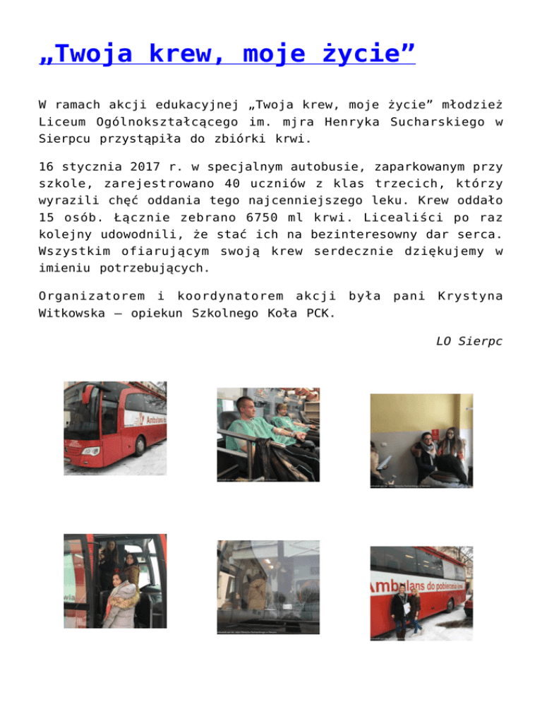 „Twoja krew, moje życie” W ramach akcji edukacyjnej „Twoja krew, moje życie” młodzież Liceum Ogólnokształcącego im. mjra Henryka Sucharskiego w Sierpcu przystąpiła do zbiórki krwi. 16 stycznia 2017 r. w specjalnym autobusie, zaparkowanym przy szkole, zarejestrowano 40 uczniów z klas trzecich, którzy wyrazili chęć oddania tego najcenniejszego leku. Krew oddało 15 osób. Łącznie zebrano 6750 ml krwi. Licealiści po raz kolejny udowodnili, że stać ich na bezinteresowny dar serca. Wszystkim ofiarującym swoją krew serdecznie dziękujemy w imieniu potrzebujących. Organizatorem i koordynatorem akcji Witkowska – opiekun Szkolnego Koła PCK. była pani Krystyna LO Sierpc