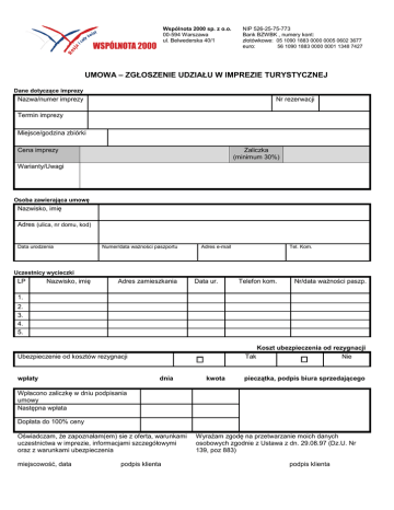 Wspólnota 2000 sp. z o.o. 00-594 Warszawa ul. Belwederska 40/1 NIP 526-25-75-773 Bank BZWBK , numery kont: złotówkowe: 05 1090 1883 0000 0005 0602 3677 euro: 56 1090 1883 0000 0001 1348 7427 UMOWA – ZGŁOSZENIE UDZIAŁU W IMPREZIE TURYSTYCZNEJ Dane dotyczące imprezy Nazwa/numer imprezy Nr rezerwacji Termin imprezy Miejsce/godzina zbiórki Cena imprezy Zaliczka (minimum 30%) Warianty/Uwagi Osoba zawierająca umowę Nazwisko, imię Adres (ulica, nr domu, kod) Data urodzenia Numer/data ważności paszportu Adres e-mail Tel. Kom. Uczestnicy wycieczki LP Nazwisko, imię Adres zamieszkania Data ur. Telefon kom. Nr/data ważności paszp. 1. 2. 3. 4. 5. Koszt ubezpieczenia od rezygnacji Tak Nie Ubezpieczenie od kosztów rezygnacji wpłaty dnia kwota pieczątka, podpis biura sprzedającego Wpłacono zaliczkę w dniu podpisania umowy Następna wpłata Dopłata do 100% ceny Oświadczam, że zapoznałam(em) sie z oferta, warunkami uczestnictwa w imprezie, informacjami szczegółowymi oraz z warunkami ubezpieczenia miejscowość, data podpis klienta Wyrażam zgodę na przetwarzanie moich danych osobowych zgodnie z Ustawa z dn. 29.08.97 (Dz.U. Nr 139, poz 883) podpis klienta