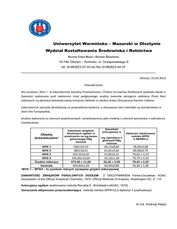 Uniwersytet Warmińsko – Mazurski w Olsztynie Wydział Kształtowania Środowiska i Rolnictwa KATEDRA CHEMII ROLNEJ I OCHRONY ŚRODOWISKA 10-744 Olsztyn – Kortowo, ul. Oczapowskiego 8 tel. (0-89)523-37-43 tel./fax (0-89)523-44-37 -----------------------------------------------------------------------------------------------Olsztyn, 23.03.2012 Oświadczenie We wrześniu 2011 r. w laboratorium Katedry Przetwórstwa i Chemii Surowców Roślinnych wydziału Nauki o Żywności wykonano pod nadzorem niżej podpisanego analizy owoców winogron odmiany Pinot Noir zebranych na plantacji doświadczalnej Instytutu Delinah w okolicy Arbaz (Szwajcaria) kanton Vallaise. Laboratorium posiada akredytację na prowadzone badania, a stosowane tam metodyki są standardowe w skali Unii Europejskiej. Analizy wykonano w czterech powtórzeniach i przedstawiono jako średnią z czterech pomiarów ± odchylenie standardowe. Obiekty doświadczalne* Zawartość związków fenolowych ogółem w przeliczeniu na mg kwasu galusowego/100g owoców MYK 1 MYK 2 MYK 3 MYK 4 Średnio mikoryza Kontrola 540,5±9,10 482±19,61 433,55±6,65 435,66±10,64 472,93 ± 11,60 424,83±2,34 Zawartość antocyjanów w mg cyjanidyno-3 glukozyd/100g owoców Zdolność redukowania rodnika DPPH• % INHIBICJI 64,15±8,80 61,81±3,64 55,82±0,31 43,33±1,58 56,28 ± 3,58 44,94±0,84 78,90±3,08 80,08±0,79 79,02 ± 3,19 79,79 ± 2,43 79,45 ± 2,35 76,30 ± 1,96 *MYK 1 – MYK4 – to symbole różnych szczepów grzybni mikoryzowej ZAWARTOŚĆ ZWIĄZKÓW FENOLOWYCH OGÓŁEM Z ODCZYNNIKIEM Folina-Ciocalteau AOAC (Assotiation of the Official Analytical Chemists), 1974. Official Methods of Analysis, Washington DC, 9. 110 Antocyjany ogółem analizowano metodą Ronalda E. Wrolstade’a [AOAC, 1974]. Oznaczanie aktywności przeciwutleniające metodą rodnika DPPH•(2,2-diphenyl-1-pirylhydrazyl) dr inż. Andrzej Klasa