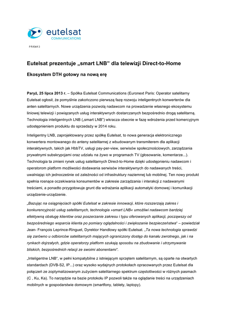 Eutelsat prezentuje „smart LNB” dla telewizji Direct-to-Home Ekosystem DTH gotowy na nową erę Paryż, 25 lipca 2013 r. – Spółka Eutelsat Communications (Euronext Paris: Operator satelitarny Eutelsat ogłosił, że pomyślnie zakończono pierwszą fazę rozwoju inteligentnych konwerterów dla anten satelitarnych. Nowe urządzenia pozwolą nadawcom na prowadzenie własnego ekosystemu liniowej telewizji i powiązanych usług interaktywnych dostarczanych bezpośrednio drogą satelitarną. Technologia inteligentnych LNB („smart LNB”) wkracza obecnie w fazę wdrożenia przed komercyjnym udostępnieniem produktu do sprzedaży w 2014 roku. Inteligentny LNB, zaprojektowany przez spółkę Eutelsat, to nowa generacja elektronicznego konwertera montowanego do anteny satelitarnej z wbudowanym transmiterem dla aplikacji interaktywnych, takich jak HbbTV, usługi pay-per-view, serwisów społecznościowych, zarządzania prywatnymi subskrypcjami oraz udziału na żywo w programach TV (głosowanie, komentarze...). Technologia ta zmieni rynek usług satelitarnych Direct-to-Home dzięki udostępnieniu nadawcom i operatorom platform możliwości dodawania serwisów interaktywnych do nadawanych treści, uwalniając ich jednocześnie od zależności od infrastruktury naziemnej lub mobilnej. Ten nowy produkt spełnia rosnące oczekiwania konsumentów w zakresie zarządzania i interakcji z nadawanymi treściami, a ponadto przygotowuje grunt dla wdrażania aplikacji automatyki domowej i komunikacji urządzenie-urządzenie. „Bazując na osiągnięciach spółki Eutelsat w zakresie innowacji, które rozszerzają zakres i konkurencyjność usług satelitarnych, technologia »smart LNB« umożliwi nadawcom bardziej efektywną obsługę klientów oraz poszerzanie zakresu i typu oferowanych aplikacji, począwszy od bezpośredniego wsparcia klienta po pomiary oglądalności i zwiększanie bezpieczeństwa“ – powiedział Jean- François Leprince-Ringuet, Dyrektor Handlowy spółki Eutelsat. „Ta nowa technologia sprawdzi się zarówno u odbiorców satelitarnych mających ograniczony dostęp do kanału zwrotnego, jak i na rynkach dojrzałych, gdzie operatorzy platform szukają sposobu na zbudowanie i utrzymywanie bliskich, bezpośrednich relacji ze swoimi abonentami“. „Inteligentne LNB“, w pełni kompatybilne z istniejącym sprzętem satelitarnym, są oparte na otwartych standardach (DVB-S2, IP...) oraz wysoko wydajnych protokołach opracowanych przez Eutelsat dla połączeń ze zoptymalizowanym zużyciem satelitarnego spektrum częstotliwości w różnych pasmach (C , Ku, Ka). To narzędzie na bazie protokołu IP pozwoli także na oglądanie treści na urządzeniach mobilnych w gospodarstwie domowym (smartfony, tablety, laptopy). Koncepcja i pierwsze prototypy zostały już przetestowane z wykorzystaniem sygnału z satelitów Eutelsatu i są gotowe do sprawdzenia przez operatorów platform i partnerów. Eutelsat uruchomił proces wdrażania urządzeń na rynek z pierwszymi producentami, licząc, że nowy produkt w przyszłości zostanie przyjęty przez kolejnych producentów sprzętu i stanie się filarem przyszłej infrastruktury telewizyjnej. Technologia inteligentnych konwerterów „smart LNB” spółki Eutelsat zostanie zaprezentowana na stoisku Eutelsatu (hala 1, stoisko 1.D59) na targach IBC w dniach 13-17 września. O Eutelsat Communications (www.eutelsat.com) Dysponując flotą 32 satelitów zapewniających zasięg na terenie Europy, Bliskiego Wschodu, Afryki, Azji, znacznej części obu Ameryk i Azji Pacyficznej, Eutelsat Communications (Euronext Paris: ETL, kod ISIN: FR0010221234) jest jednym z wiodących operatorów satelitarnych na świecie. Według stanu na dzień 31 marca 2013 roku satelity Eutelsat nadawały ponad 4600 kanałów telewizyjnych do ponad 200 milionów gospodarstw domowych wyposażonych w anteny satelitarne lub sieci kablowe na terenie Europy, na Bliskim Wschodzie i w Afryce. Satelity Grupy świadczą szeroki zakres usług w zakresie dosyłu sygnału telewizyjnego, sieci korporacyjnych oraz stacjonarnej i mobilnej komunikacji szerokopasmowej. Siedziba Eutelsat mieści się w Paryżu. Firma zatrudnia ponad 780 specjalistów handlowych, technicznych i operacyjnych z 30 krajów. Dodatkowe informacje n Prasa Vanessa O’Connor Tel.: + 33 1 53 98 37 91 [email protected] Frédérique Gautier Tel.: + 33 1 53 98 37 91 [email protected] Marie-Sophie Ecuer Tel.: + 33 1 53 98 37 91 [email protected] n Inwestorzy i analitycy Leonard Wapler Tel.: +33 1 53 98 31 07 [email protected]