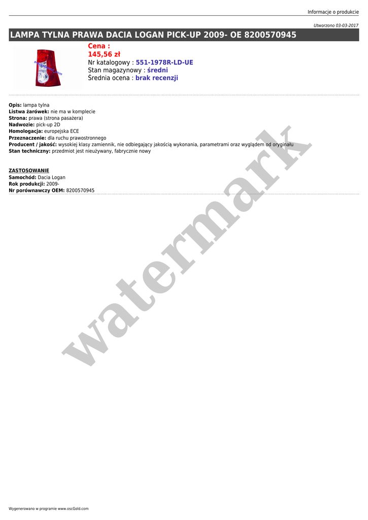 Informacje o produkcie Utworzono 03-03-2017 LAMPA TYLNA PRAWA DACIA LOGAN PICK-UP 2009- OE 8200570945 Cena : 145,56 zł Nr katalogowy : 551-1978R-LD-UE Stan magazynowy : średni Średnia ocena : brak recenzji w at ZASTOSOWANIE Samochód: Dacia Logan Rok produkcji: 2009Nr porównawczy OEM: 8200570945 er m ar k Opis: lampa tylna Listwa żarówek: nie ma w komplecie Strona: prawa (strona pasażera) Nadwozie: pick-up 2D Homologacja: europejska ECE Przeznaczenie: dla ruchu prawostronnego Producent / jakość: wysokiej klasy zamiennik, nie odbiegający jakością wykonania, parametrami oraz wyglądem od oryginału Stan techniczny: przedmiot jest nieużywany, fabrycznie nowy Wygenerowano w programie www.oscGold.com