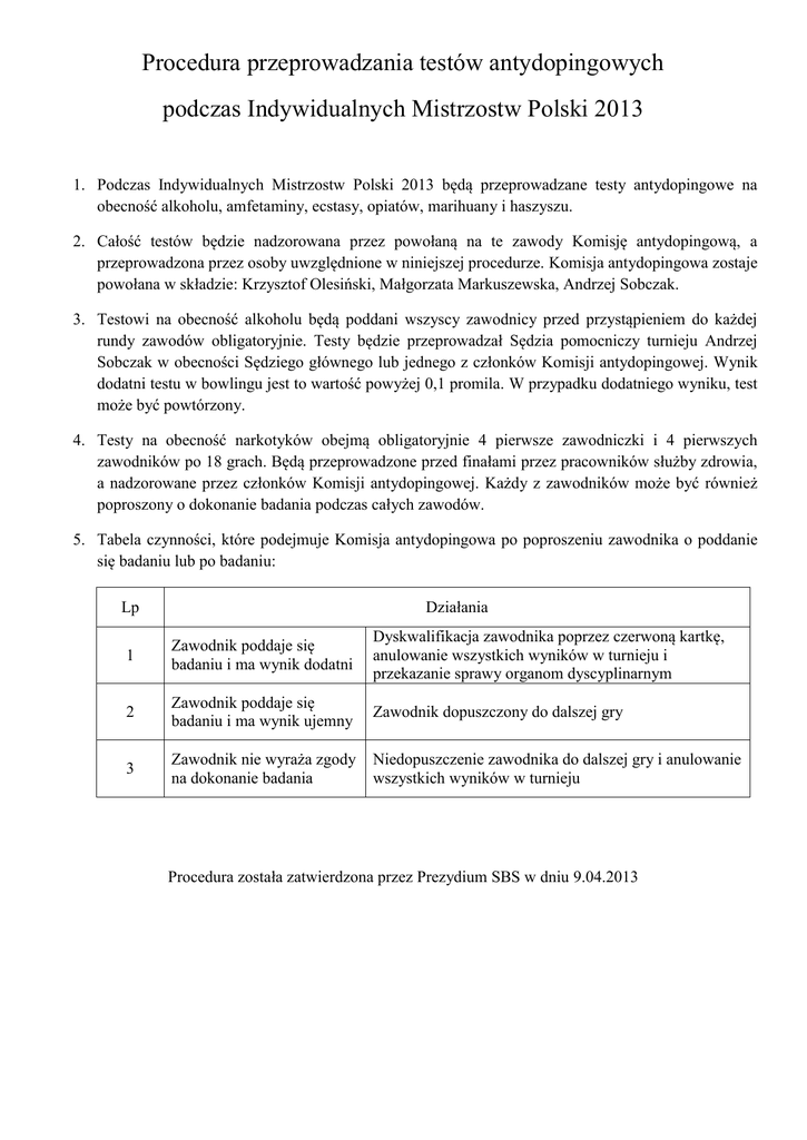 Procedura przeprowadzania testów antydopingowych podczas Indywidualnych Mistrzostw Polski 2013 1. Podczas Indywidualnych Mistrzostw Polski 2013 będą przeprowadzane testy antydopingowe na obecność alkoholu, amfetaminy, ecstasy, opiatów, marihuany i haszyszu. 2. Całość testów będzie nadzorowana przez powołaną na te zawody Komisję antydopingową, a przeprowadzona przez osoby uwzględnione w niniejszej procedurze. Komisja antydopingowa zostaje powołana w składzie: Krzysztof Olesiński, Małgorzata Markuszewska, Andrzej Sobczak. 3. Testowi na obecność alkoholu będą poddani wszyscy zawodnicy przed przystąpieniem do każdej rundy zawodów obligatoryjnie. Testy będzie przeprowadzał Sędzia pomocniczy turnieju Andrzej Sobczak w obecności Sędziego głównego lub jednego z członków Komisji antydopingowej. Wynik dodatni testu w bowlingu jest to wartość powyżej 0,1 promila. W przypadku dodatniego wyniku, test może być powtórzony. 4. Testy na obecność narkotyków obejmą obligatoryjnie 4 pierwsze zawodniczki i 4 pierwszych zawodników po 18 grach. Będą przeprowadzone przed finałami przez pracowników służby zdrowia, a nadzorowane przez członków Komisji antydopingowej. Każdy z zawodników może być również poproszony o dokonanie badania podczas całych zawodów. 5. Tabela czynności, które podejmuje Komisja antydopingowa po poproszeniu zawodnika o poddanie się badaniu lub po badaniu: Działania Lp 1 Zawodnik poddaje się badaniu i ma wynik dodatni Dyskwalifikacja zawodnika poprzez czerwoną kartkę, anulowanie wszystkich wyników w turnieju i przekazanie sprawy organom dyscyplinarnym 2 Zawodnik poddaje się badaniu i ma wynik ujemny Zawodnik dopuszczony do dalszej gry 3 Zawodnik nie wyraża zgody na dokonanie badania Niedopuszczenie zawodnika do dalszej gry i anulowanie wszystkich wyników w turnieju Procedura została zatwierdzona przez Prezydium SBS w dniu 9.04.2013