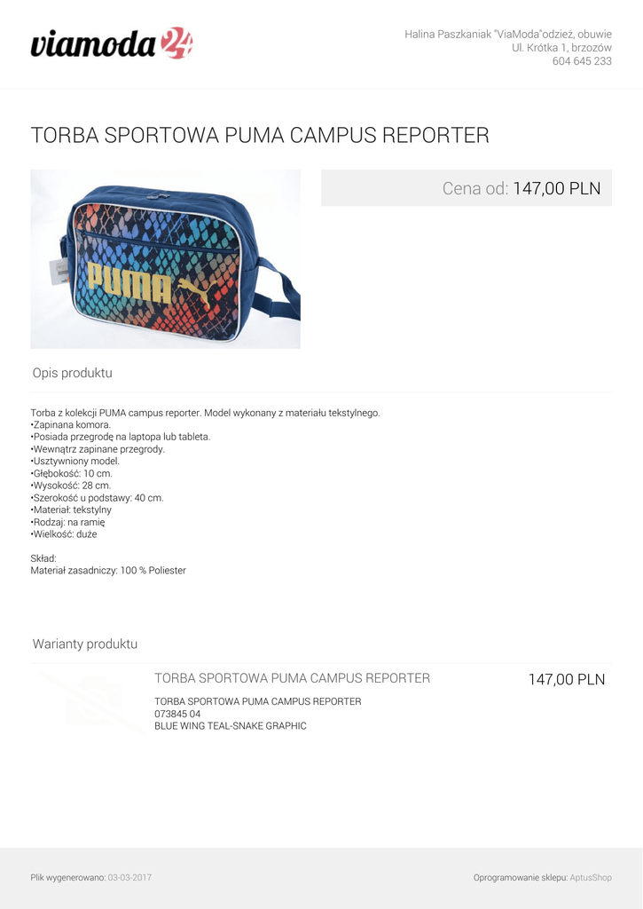 Halina Paszkaniak "ViaModa"odzież, obuwie Ul. Krótka 1, brzozów 604 645 233 TORBA SPORTOWA PUMA CAMPUS REPORTER Cena od: 147,00 PLN Opis produktu Torba z kolekcji PUMA campus reporter. Model wykonany z materiału tekstylnego. •Zapinana komora. •Posiada przegrodę na laptopa lub tableta. •Wewnątrz zapinane przegrody. •Usztywniony model. •Głębokość: 10 cm. •Wysokość: 28 cm. •Szerokość u podstawy: 40 cm. •Materiał: tekstylny •Rodzaj: na ramię •Wielkość: duże Skład: Materiał zasadniczy: 100 % Poliester Warianty produktu TORBA SPORTOWA PUMA CAMPUS REPORTER 147,00 PLN TORBA SPORTOWA PUMA CAMPUS REPORTER 073845 04 BLUE WING TEAL-SNAKE GRAPHIC Plik wygenerowano: 03-03-2017 Oprogramowanie sklepu: AptusShop Halina Paszkaniak "ViaModa"odzież, obuwie Ul. Krótka 1, brzozów 604 645 233 Galeria Plik wygenerowano: 03-03-2017 Powered by TCPDF (www.tcpdf.org) Oprogramowanie sklepu: AptusShop