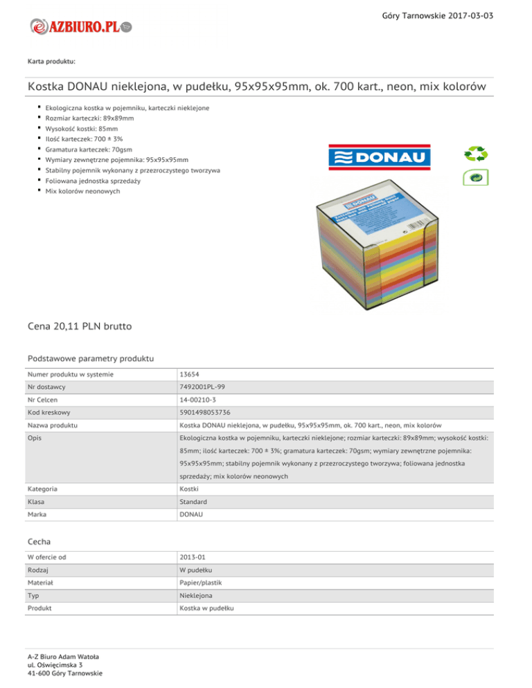 Góry Tarnowskie 2017-03-03 Karta produktu: Kostka DONAU nieklejona, w pudełku, 95x95x95mm, ok. 700 kart., neon, mix kolorów Ekologiczna kostka w pojemniku, karteczki nieklejone Rozmiar karteczki: 89x89mm Wysokość kostki: 85mm Ilość karteczek: 700 ± 3% Gramatura karteczek: 70gsm Wymiary zewnętrzne pojemnika: 95x95x95mm Stabilny pojemnik wykonany z przezroczystego tworzywa Foliowana jednostka sprzedaży Mix kolorów neonowych Cena 20,11 PLN brutto Podstawowe parametry produktu Numer produktu w systemie 13654 Nr dostawcy 7492001PL-99 Nr Celcen 14-00210-3 Kod kreskowy 5901498053736 Nazwa produktu Kostka DONAU nieklejona, w pudełku, 95x95x95mm, ok. 700 kart., neon, mix kolorów Opis Ekologiczna kostka w pojemniku, karteczki nieklejone; rozmiar karteczki: 89x89mm; wysokość kostki: 85mm; ilość karteczek: 700 ± 3%; gramatura karteczek: 70gsm; wymiary zewnętrzne pojemnika: 95x95x95mm; stabilny pojemnik wykonany z przezroczystego tworzywa; foliowana jednostka sprzedaży; mix kolorów neonowych Kategoria Kostki Klasa Standard Marka DONAU Cecha W ofercie od 2013-01 Rodzaj W pudełku Materiał Papier/plastik Typ Nieklejona Produkt Kostka w pudełku A-Z Biuro Adam Watoła ul. Oświęcimska 3 41-600 Góry Tarnowskie Góry Tarnowskie 2017-03-03 Karta katalogowa produktu cd. Kostka DONAU nieklejona, w pudełku, 95x95x95mm, ok. 700 kart., neon, mix kolorów Ilość Ilość kartek 700 ± 3% Wymiary Rozmiar 89x89mm Wysokość (mm) 95 Wymiary (mm) 95x95 Gramatura (g/m2) 70 Wspólny słownik zamówień CPV 22816100-4 Bloczki notatkowe Certyfikaty Nowy produkt w ofercie Standard Hit Standard Kolor Kolor Serdecznie zapraszamy do współpracy A-Z Biuro Adam Watoła zespół. A-Z Biuro Adam Watoła ul. Oświęcimska 3 41-600 Góry Tarnowskie Mix kolorów