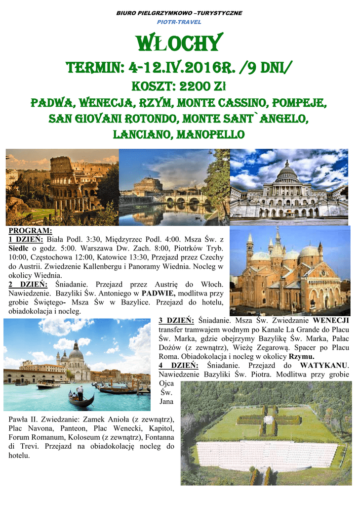 BIURO PIELGRZYMKOWO –TURYSTYCZNE PIOTR-TRAVEL WŁOCHY Termin: 4-12.IV.2016r. /9 dni/ Koszt: 2200 zł PADWA, WENECJA, RZYM, MONTE CASSINO, POMPEJE, SAN GIOVANI ROTONDO, MONTE SANT`ANGELO, LANCIANO, MANOPELLO PROGRAM: 1 DZIEŃ: Biała Podl. 3:30, Międzyrzec Podl. 4:00. Msza Św. z Siedlc o godz. 5:00. Warszawa Dw. Zach. 8:00, Piotrków Tryb. 10:00, Częstochowa 12:00, Katowice 13:30, Przejazd przez Czechy do Austrii. Zwiedzenie Kallenbergu i Panoramy Wiednia. Nocleg w okolicy Wiednia. 2 DZIEŃ: Śniadanie. Przejazd przez Austrię do Włoch. Nawiedzenie. Bazyliki Św. Antoniego w PADWIE, modlitwa przy grobie Świętego- Msza Św w Bazylice. Przejazd do hotelu, obiadokolacja i nocleg. 3 DZIEŃ: Śniadanie. Msza Św. Zwiedzanie WENECJI transfer tramwajem wodnym po Kanale La Grande do Placu Św. Marka, gdzie obejrzymy Bazylikę Św. Marka, Pałac Dożów (z zewnątrz), Wieżę Zegarową. Spacer po Placu Roma. Obiadokolacja i nocleg w okolicy Rzymu. 4 DZIEŃ: Śniadanie. Przejazd do WATYKANU. Nawiedzenie Bazyliki Św. Piotra. Modlitwa przy grobie Ojca Św. Jana Pawła II. Zwiedzanie: Zamek Anioła (z zewnątrz), Plac Navona, Panteon, Plac Wenecki, Kapitol, Forum Romanum, Koloseum (z zewnątrz), Fontanna di Trevi. Przejazd na obiadokolację nocleg do hotelu. 5 DZIEŃ: Śniadanie. Przejazd na MONTE CASSINO. Nawiedzenie Cmentarza oraz Zespołu Klasztornego Benedyktów. Msza Św. Przejazd do Sanktuarium Matki Bożej Pompejańskiej. Obiadokolacja i nocleg w San Giovani Rotondo. 6 DZIEŃ: Śniadanie. Msza Św. w Sanktuarium O. Pio w SAN GIOVANNI ROTONDO. Zwiedzanie miejsc związanych z życiem Ojca. Droga Krzyżowa, czas wolny. Po południu przejazd do MONTE SANT`ANGELO gdzie znajduje się Sanktuarium Świętego Michała Archanioła – jedynego Sanktuarium niepoświęconego ręką ludzką. Powrót na Obiadokolację. Wieczorem dla chętnych Różaniec przy grobie św. Ojca Pio. Nocleg. 7 DZIEŃ: Śniadanie. Przejazd do LANCIANO, gdzie w VIII w. Miał miejsce Cud Eucharystyczny. Msza Św. w sanktuarium Cudu Eucharystycznego. MANOPELLO. Następnie przejazd do LORETO Obiadokolacja i nocleg. 8 DZIEŃ: Śniadanie. Msza Św. Zwiedzanie LORETO, gdzie znajduje się Sanktuarium Santa Casa, miejsce kultu Maryjnego, z tzw. Świętym Domkiem, który jest nazaretańskim domem Maryi. Zwiedzanie Bazyliki. Oraz Cmentarza Żołnierzy Polskich, czas wolny na zakup pamiątek. Przejazd na. Obiadokolację i nocleg do TARVISIO. 9 DZIEŃ: Śniadanie. Msza Św. Powrót do Polski w godzinach wieczornych. NA TERENIE POLSKI WYŻWWIENIE WE WŁASNYM ZAKRESIE. ŚWIADCZENIA: - Autokar kl. Turystycznej - Pakiet ubezpieczeń - Noclegi w hotelach ( pokoje 2,3 os.) - Wyżywienie wg programu - Opieka pilota, opieka duchowa - Przewodnicy miejscowi Zabieramy ze sobą m.in.: ważny dowód osobisty lub paszport /proszę o sprawdzanie ważności dokumentów!/, lekarstwa - które przyjmujemy, wygodne obuwie, okulary, nakrycie głowy. Organizator zastrzega sobie prawo wprowadzenia zmian w programie w przypadku zaistnienia sytuacji od organizatora niezależnych. Szczegóły ustala pilot w porozumieniu z kierownikiem grupy. ZAPISUJĄC SIĘ NALEŻY PODAĆ: IMIĘ I NAZWISKO, ADRES ZAMELDOWANIA, PESEL, NR. DOWODU OSOBISTEGO, NR. TEJEFONU KONTAKTOWEGO Rezerwację potwierdza wpłata zaliczki. Pełną kwotę w złotówkach należy dokonać miesiąc przed wyjazdem. Opłaty w Euro dokonujemy dla pilota grupy – w autokarze lub na konto Biura. Przyjmujemy zamówienia na wyjazdy grupowe i organizowane przez parafie Miejsca zbiórek pielgrzymów: Lublin - Dworzec PKS (Podzamcze), Zamość, Rzeszów, Biała Podlaska, Siedlce, Warszawa -dw. Zach, Częstochowa, Katowice - dworzec PKP; Dęblin, Puławy, Radom, Kielce, Kraków- Łagiewniki, Bydgoszcz, Toruń, Łódź, Wrocław. Informacje i zapisy: Międzyrzec Podl. Tel./fax: 083/371-68-31 (9.00 –17.00) kom. 604464878 (8:00 - 22:00) E-mail: [email protected], www.piotrtravel.pl Nr. konta: P.H.U.”PIOTREX” Eksport-Import, Piotr Łosicki ul. Brzeska 23, 21-560 Międzyrzec Podl. PKO BP: PLN: 41 1020 1260 0000 0202 0053 9171 SERDECZNIE ZAPRASZAMY