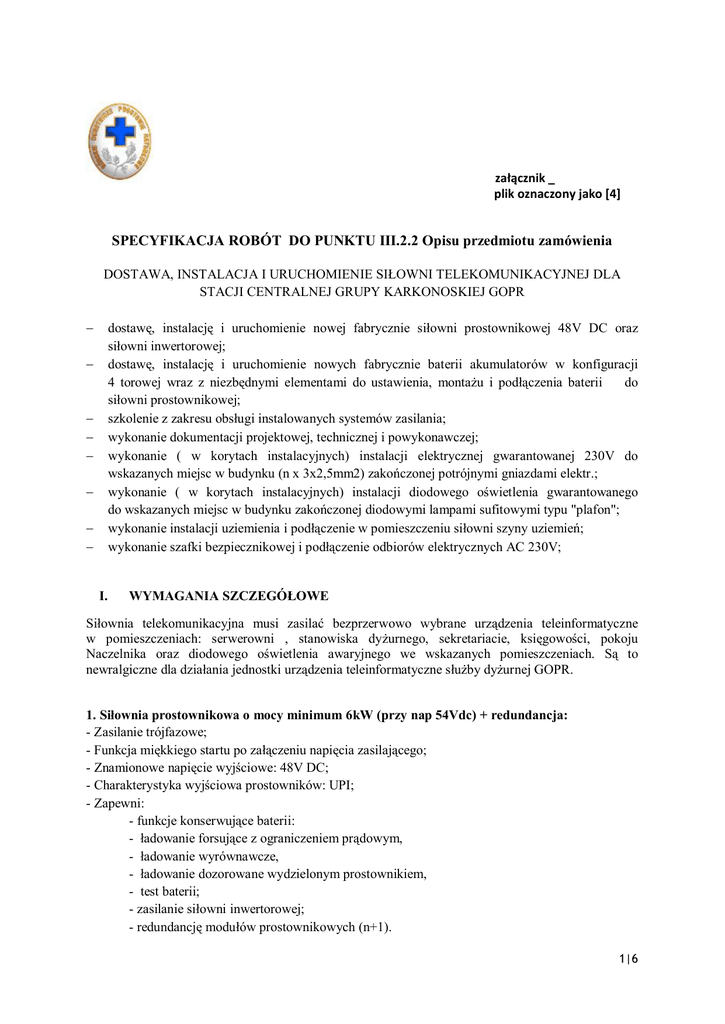 załącznik _ plik oznaczony jako [4] SPECYFIKACJA ROBÓT DO PUNKTU III.2.2 Opisu przedmiotu zamówienia DOSTAWA, INSTALACJA I URUCHOMIENIE SIŁOWNI TELEKOMUNIKACYJNEJ DLA STACJI CENTRALNEJ GRUPY KARKONOSKIEJ GOPR - dostawę, instalację i uruchomienie nowej fabrycznie siłowni prostownikowej 48V DC oraz siłowni inwertorowej; dostawę, instalację i uruchomienie nowych fabrycznie baterii akumulatorów w konfiguracji 4 torowej wraz z niezbędnymi elementami do ustawienia, montażu i podłączenia baterii do siłowni prostownikowej; szkolenie z zakresu obsługi instalowanych systemów zasilania; wykonanie dokumentacji projektowej, technicznej i powykonawczej; wykonanie ( w korytach instalacyjnych) instalacji elektrycznej gwarantowanej 230V do wskazanych miejsc w budynku (n x 3x2,5mm2) zakończonej potrójnymi gniazdami elektr.; wykonanie ( w korytach instalacyjnych) instalacji diodowego oświetlenia gwarantowanego do wskazanych miejsc w budynku zakończonej diodowymi lampami sufitowymi typu "plafon"; wykonanie instalacji uziemienia i podłączenie w pomieszczeniu siłowni szyny uziemień; wykonanie szafki bezpiecznikowej i podłączenie odbiorów elektrycznych AC 230V; - - I. WYMAGANIA SZCZEGÓŁOWE Siłownia telekomunikacyjna musi zasilać bezprzerwowo wybrane urządzenia teleinformatyczne w pomieszczeniach: serwerowni , stanowiska dyżurnego, sekretariacie, księgowości, pokoju Naczelnika oraz diodowego oświetlenia awaryjnego we wskazanych pomieszczeniach. Są to newralgiczne dla działania jednostki urządzenia teleinformatyczne służby dyżurnej GOPR. 1. Siłownia prostownikowa o mocy minimum 6kW (przy nap 54Vdc) + redundancja: - Zasilanie trójfazowe; - Funkcja miękkiego startu po załączeniu napięcia zasilającego; - Znamionowe napięcie wyjściowe: 48V DC; - Charakterystyka wyjściowa prostowników: UPI; - Zapewni: - funkcje konserwujące baterii: - ładowanie forsujące z ograniczeniem prądowym, - ładowanie wyrównawcze, - ładowanie dozorowane wydzielonym prostownikiem, - test baterii; - zasilanie siłowni inwertorowej; - redundancję modułów prostownikowych (n+1). 1|6 - Umożliwi rozbudowę o min. 50% jedynie poprzez dostawienie dodatkowych modułów prostownikowych; Moc siłowni musi zapewnić jednoczesne: -ładowanie baterii: min 0,1 całkowitej pojemności baterii – 0,1 C10), - zasilanie innych odbiorów 48V DC min. 1000W - Sprawność min 95%; - Psofometryczne napięcie tętnień nie większe niż 2mV; - Czujnik temperatury; - Współpraca z baterią 48V w konfiguracji 4 torowej, pojemności łącznej min.500Ah (ogniwa 12V FT montowane w jednej szafie wys. max 2000mm) - Pomiar asymetrii baterii (osobno dla każdej baterii); - Równoległa praca modułów prostownikowych; - Aktywny podział prądu obciążenia zespołów prostownikowych; - Konstrukcja powinna zapewniać równomierne obciążenie faz sieci niskiego napięcia AC; - Moduły prostownikowe o mocy maksymalnie 2kW spełniające warunki: znamionowe napięcie wejściowe 230 VAC napięcie wyjściowe 48V DC (minimalny zakres regulacji napięcia od 45V do 56V); zakres temperatury pracy od 0 do +600C lub szerszy; informowanie o stanie: praca/awaria na panelu frontowym; instalacja prostownika w siłowni typu hot–swap. - Sterownik mikroprocesorowy i wyposażenie umożliwiające co najmniej: · pomiar napięcia wyjściowego; · pomiar napięć i prądów baterii z archiwizacją wyników w sterowniku; · pomiar temperatury baterii; · · · · · · · · · · · · · · · pomiar napięcia i prądów wyjściowych poszczególnych prostowników; temperaturową kompensację napięcia wyjściowego prostowników; realizację funkcji ładowania forsującego z ograniczeniem prądowym; realizację funkcji ładowania wyrównawczego; realizację funkcji testu baterii; realizację funkcji pomiaru asymetrii baterii; ograniczanie prądu ładowania baterii; kontrolę i sygnalizację stanów pracy siłowni; sygnalizację stanu zabezpieczeń nad prądowych baterii i odbiorów; zmianę nastaw wybranych parametrów siłowni; dostęp do menu sterownika chroniony hasłem (z wyjątkiem dostępu do odczytu parametrów bieżących pracy siłowni i historii zdarzeń); lokalny monitoring przy pomocy mobilnego komputera PC, poprzez porty USB lub RS-232, dostawa ma zawierać oprogramowanie komunikacyjne współpracujące z systemem Windows XP. monitorowanie i kontrola systemu poprzez port Ethernet za pomocą protokołu TCP/IP lub poprzez SNMP; umożliwienie zdalnego logowania za pomocą dedykowanej aplikacji do zarządzania siłowni; monitorowanie i wykonanie testu baterii; 2|6 - RGR; - Pole dystrybucji DC: -zabezpieczenia baterii – 4 podstawy typu NH z wkładkami bezpiecznikowymi WT/NH wraz z czterema wkładkami zapasowymi; Ilość zabezpieczeń musi odpowiadać ilościom zainstalowanych baterii (dla każdej oddzielne zabezpieczenie); -zabezpieczenie siłowni inwertorowej; -pozostałe odbiory – pole na wyłączniki typu „S” o charakterystyce C – 10 wyłączników nadmiarowo – prądowych (1x63A, 2x32A, 2x25A, 3x16A,2x10A); -podstawy bezpiecznikowe NH00 – szt. 4 z wkładkami 2x32A, 2x20A; 2. Siłownia inwertorowa o parametrach – moc min 5kVA + redundancja: - Moc wyjściowa – min. 5000VA z możliwością rozbudowy o min. 25% jedynie poprzez dostawienie dodatkowych modułów inwertorowych; - Budowa modułowa; - Równoległa praca modułów; - Maksymalna moc modułów – 3000VA; - Napięcie wejściowe – 48V DC i 230 AC; - Napięcie wyjściowe jednofazowe 230V/50Hz; - zaawansowana konwersja mocy (EPC) min. 96%; - Sprawność on Line min. 91%; - zakres temperatury pracy od -100C do +400C lub szerszy; - Układ elektronicznego by-pass’u (konfiguracja on/off-line do wyboru) zintegrowany w modułach inwertorowych realizujący bezprzerwowe przełączenie zasilania z linii rezerwowej 48VDC. Nie dopuszcza się zastosowania odrębnego modułu elektronicznego by-pass’u; – siłownia podczas pracy on-line nie może obciąża