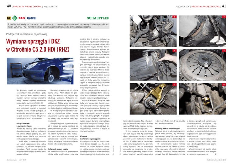 40 | PRAKTYKA WARSZTATOWA | MECHANIKA MECHANIKA | PRAKTYKA WARSZTATOWA | 41 1 2 3 4 5 6 Schaeffler jest wiodącym dostawcą części zamiennych i innowacyjnych rozwiązań naprawczych. Oferta produktowa marek LuK, INA, FAG i Ruville obejmuje systemy przeniesienia napędu, silnika oraz zawieszenia. Podręcznik mechaniki pojazdowej Oprzyrządowanie i czynności wstępne Podczas tej naprawy użyto podnośnika dwukolumnowego, belki do podwiesza nia silnika, długiej podpory osi, pod nośnika skrzyni biegów oraz narzędzia centrującego do tarczy sprzęgła. Jeżeli pojazd posiada felgi aluminio we, przed rozpoczęciem prac należy sprawdzić, czy założono nakrętki zabez pieczające. Przed naprawą należy dla bezpieczeństwa odłączyć przewód maso wy akumulatora. Autonaprawa | Luty 2017 Demontaż rozpoczyna się od zdjęcia osłony silnika. Potem odłącza się prze wody filtra powietrza oraz zdejmuje jego obudowę i podstawę. Rozłączenia wy magają też wielostykowe złącza instalacji elektrycznej. Należy wyjąć pomocniczą skrzynkę bezpiecznikową, co umożliwi lepszy dostęp do górnej części skrzyni biegów. W dalszej kolejności odłącza się cię gna od mechanizmu zmiany biegów usytuowane w górnej części skrzyni. Po tej operacji cały mechanizm należy wy montować. Następnie wyjmuje się siłownik sprzę gła i mocuje go opaską zaciskową po jednej stronie skrzyni (rys. 1). Odłączanie przewodu hydraulicznego nie jest koniecz ne. Potem wymontować trzeba rozrusz nik, górne śruby pokrywy sprzęgła oraz zamocowanie i wspornik skrzyni biegów. Należy też odłączyć złącza wielostykowe świateł cofania i prędkościomierza. Odłączenie skrzyni biegów Po zamocowaniu belki do podwieszenia silnika trzeba unieść pojazd, zdjąć oba Wymiana mechanizmu wysprzęglania Stare łożysko oporowe jest przymocowa ne do docisku sprzęgła (rys. 4). Jest to moment, w którym występuje najwię cej błędów podczas montażu, ponieważ nowe łożysko oporowe przed założeniem nowego sprzęgła jest niepotrzebnie wcis Fot. Schaeffler Ten konkretny model jest wyposażony w dwumasowe koło zamachowe i sprzę gło ciągnione, które podczas trwającej 6 godzin wymiany wymaga szczególnej uwagi. Podczas naprawy zastosowano zestaw LuK o numerze 623304100. Artykuł odnosi się również do niektó rych zastosowań znanych w modelach Peugeota i Fiata. Należy pamiętać, że przy każdej wymianie sprzęgła koniecz na jest również wymiana dźwigni wy sprzęglającej wraz z jej trzpieniem. Fot. Schaeffler Wymiana sprzęgła i DKZ w Citroënie C5 2.0 HDi (RHZ) przednie koła i ostrożnie odłączyć po obu stronach z gumowych końcówek za bezpieczających przewody układu ABS oraz czujniki zużycia klocków hamul cowych. Zdemontowania wymaga też nadkole po stronie kierowcy. Następnie należy zdjąć osłonę spodnią silnika oraz odłączyć i rozdzielić oba przeguby kulo we przedniego zawieszenia. Potem spuszcza się olej ze skrzyni bie gów, pamiętając, aby po zakończeniu tej czynności założyć korek spustowy. Od łącza się też przewody chłodnicy turbo sprężarki, a także ich wsporniki zamoco wane do skrzyni biegów. Należy również zdjąć pokrywę kontrolną skrzyni (rys. 2), wyjąć trzy śruby wspornika mocującego cięgna, a następnie odłączyć wsporniki przewodów klimatyzacji (rys. 3) i umie ścić je po jednej stronie. Później można ostrożnie wysunąć ze skrzyni biegów półoś po stronie kierowcy, odpiąć wspornik łożyska półosi po stronie pasażera oraz wyciągnąć ją ze skrzyni. W dalszej kolejności luzuje się dwie śruby ramy pomocniczej (sanek) wkrę cone po stronie kierowcy i wyjmuje dwie śruby po stronie pasażera. Skrzynię bie gów opiera się na odpowiednim podno śniku, a następnie wykręca pozostałe śruby z obudowy sprzęgła. W przypad ku skrzyni ze sprzęgłem ciągnionym po wyjęciu skrzyni dźwignia wysprzęglająca wysunie się z łożyska oporowego. Skrzy nię można następnie nieco obniżyć, lek ko ją obracając. Umożliwi to wyjęcie jej z ramy pomocniczej. kane w docisk sprzęgła. Taka sytuacja ni gdy nie powinna mieć miejsca. Łożysko oporowe MUSI zostać najpierw zamoco wane do dźwigni wysprzęglającej. W tym momencie trzeba też spraw dzić stan zużycia DKZ. Kąt swobodnego obrotu między masą pierwotną a wtórną powinien wynosić maksymalnie 20 stop ni (lub 8 zębów wieńca rozrusznika). Jeżeli jest większy lub nie ma go wcale, należy wymienić DKZ. W opisywanym przypadku luz poprzeczny nie przekra czał wartości granicznej, lecz luz krawę dziowy powinien wynosić maksymalnie 1,6 mm, a było 2,1 mm. Z tego powodu DKZ zostało wymienione. Ponowny montaż skrzyni biegów Wykonuje się go w kolejności odwrotnej, jednak trzeba pamiętać, aby nowe łoży sko oporowe założyć do nowej dźwigni wysprzęglającej (rys. 5). Łożyska tego nie wolno montować bezpośrednio w docisku. Po zamontowaniu skrzyni łożysko oporowe powinno się zakleszczyć w do cisku przy użyciu odpowiedniej dźwigni wsuniętej przez otwór roboczy siłownika sprzęgła (rys. 6). Zatrzaśnięcie łożyska w docisku sprzęgła jest sygnalizowane charakterystycznym „kliknięciem”. Aby upewnić się, że łożysko jest prawidłowo zamontowane, należy ostrożnie poruszać widełkami za pomocą dźwigni w kierun ku przeciwnym, czyli powodującym wci skanie sprzęgła. W tym modelu nie przewidziano otwo ru kontroli poziomu oleju. Należy zatem wlać 1,8 l oleju przekładniowego zgodnie ze specyfikacją. Więcej informacji, jak również tabele z momentami dokręcania śrub, dostępne są na stronie www.repxpert.pl n Autonaprawa | Luty 2017