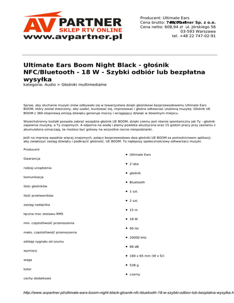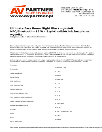 Producent: Ultimate Ears Cena brutto: 749,00 AV Partner zł Sp. z o.o. Cena netto: 608,94 zł ul. Jórskiego 56 03-593 Warszawa tel. +48 22 747-02-91 Ultimate Ears Boom Night Black - głośnik NFC/Bluetooth - 18 W - Szybki odbiór lub bezpłatna wysyłka kategoria: Audio > Głośniki multimedialne Spraw, aby słuchanie muzyki znów odbywało się w towarzystwie dzięki głośnikowi bezprzewodowemu Ultimate Ears BOOM, który został stworzony, aby szaleć, buntować się, imprezować i głośno odtwarzać ulubioną muzykę. Głośnik UE BOOM z 360-stopniową emisją dźwięku generuje mocny i wciągający dźwięk w dowolnym miejscu. Wszechstronny kształt pozwala zabrać wszędzie głośnik UE BOOM, dzięki czemu jest równie spontaniczny jak Ty - głośnik zapewnia muzykę, a Ty znajomych. A odporna na wodę i plamy powłoka akustyczna oraz 15 godzin pracy przy zasilaniu z akumulatora oznaczają, że możesz być gotowy na wszystkie nocne niespodzianki. Jeśli na imprezę wpadnie więcej znajomych, połącz bezprzewodowo dwa głośniki UE BOOM za pośrednictwem aplikacji, aby zwiększyć zasięg dźwięku i podkręcić głośność. UE BOOM. To najlepszy społecznościowy odtwarzacz muzyki. Producent Ultimate Ears Gwarancja 2 lata rodzaj urządzenia głośnik komunikacja Bluetooth ilośc głośników 1 szt. ilość przetwoników 2 szt. zasięg nadajnika 15 m łączna moc zestawu RMS 18 W min. częstotliwość przenoszenia 90 Hz maks. częstotliwość przenoszenia 20000 kHz odstęp sygnału od szumu 88 dB wymiary 180 x 65 mm (W x Śr) waga 538 g kolor czarny cechy dodatkowe http://www.avpartner.pl/ultimate-ears-boom-night-black-glosnik-nfc-bluetooth-18-w-szybki-odbior-lub-bezplatna-wysylka.ht wszechstronny kształt, który pozwala zabrać głośnik w dowolne miejsce | powłoka akustyczna odporna na wodę i plamy | łączność bezprzewodowa Bluetooth | akumulator ładowany z portu microUSB | 360-stopniowa emisja potężnego i wciągającego dźwięku | czas ładowania 3-4 godziny typ zasilania akumulator litowo-jonowy http://www.avpartner.pl/ultimate-ears-boom-night-black-glosnik-nfc-bluetooth-18-w-szybki-odbior-lub-bezplatna-wysylka.ht