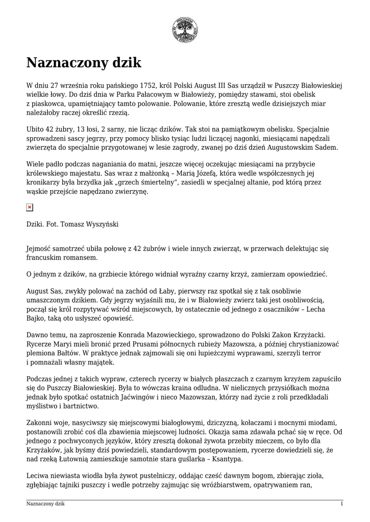 Naznaczony dzik W dniu 27 września roku pańskiego 1752, król Polski August III Sas urządził w Puszczy Białowieskiej wielkie łowy. Do dziś dnia w Parku Pałacowym w Białowieży, pomiędzy stawami, stoi obelisk z piaskowca, upamiętniający tamto polowanie. Polowanie, które zresztą wedle dzisiejszych miar należałoby raczej określić rzezią. Ubito 42 żubry, 13 łosi, 2 sarny, nie licząc dzików. Tak stoi na pamiątkowym obelisku. Specjalnie sprowadzeni sascy jegrzy, przy pomocy blisko tysiąc ludzi liczącej nagonki, miesiącami napędzali zwierzęta do specjalnie przygotowanej w lesie zagrody, zwanej po dziś dzień Augustowskim Sadem. Wiele padło podczas naganiania do matni, jeszcze więcej oczekując miesiącami na przybycie królewskiego majestatu. Sas wraz z małżonką – Marią Józefą, która wedle współczesnych jej kronikarzy była brzydka jak „grzech śmiertelny”, zasiedli w specjalnej altanie, pod którą przez wąskie przejście napędzano zwierzynę. Dziki. Fot. Tomasz Wyszyński Jejmość samotrzeć ubiła połowę z 42 żubrów i wiele innych zwierząt, w przerwach delektując się francuskim romansem. O jednym z dzików, na grzbiecie którego widniał wyraźny czarny krzyż, zamierzam opowiedzieć. August Sas, zwykły polować na zachód od Łaby, pierwszy raz spotkał się z tak osobliwie umaszczonym dzikiem. Gdy jegrzy wyjaśnili mu, że i w Białowieży zwierz taki jest osobliwością, począł się król rozpytywać wśród miejscowych, by ostatecznie od jednego z osaczników – Lecha Bajko, taką oto usłyszeć opowieść. Dawno temu, na zaproszenie Konrada Mazowieckiego, sprowadzono do Polski Zakon Krzyżacki. Rycerze Maryi mieli bronić przed Prusami północnych rubieży Mazowsza, a później chrystianizować plemiona Bałtów. W praktyce jednak zajmowali się oni łupieżczymi wyprawami, szerzyli terror i pomnażali własny majątek. Podczas jednej z takich wypraw, czterech rycerzy w białych płaszczach z czarnym krzyżem zapuściło się do Puszczy Białowieskiej. Była to wówczas kraina odludna. W nielicznych przysiółkach można jednak było spotkać ostatnich Jaćwingów i nieco Mazowszan, którzy nad życie z roli przedkładali myślistwo i bartnictwo. Zakonni woje, nasyciwszy się miejscowymi białogłowymi, dziczyzną, kołaczami i mocnymi miodami, postanowili zrobić coś dla zbawienia miejscowej ludności. Okazja sama zdawała pchać się w ręce. Od jednego z pochwyconych języków, który zresztą dokonał żywota przebity mieczem, co było dla Krzyżaków, jak byśmy dziś powiedzieli, standardowym postępowaniem, rycerze dowiedzieli się, że nad rzeką Łutownią zamieszkuje samotnie stara guślarka – Ksantypa. Leciwa niewiasta wiodła była żywot pustelniczy, oddając cześć dawnym bogom, zbierając zioła, zgłębiając tajniki puszczy i wedle potrzeby zajmując się wróżbiarstwem, opatrywaniem ran, Naznaczony dzik 1 zamawianiem chorób, czyli najogólniej mówiąc pełniła funkcje miejscowego lekarza. Krzyżacy ruszyli do oddalonego o kilka staj uroczyska pełni zapału, którego nie ostudziły nawet znaki, jakie spotkali po drodze. Ani martwa sójka, leżąca w poprzek leśnego duktu, ani wołanie puszczyka w samo południe, ani nawet widok świętego węża w złotej koronie nie ostudziły ich zapału. Przybyli nad Łutownię o zachodzie poprzedzającym magiczną noc Kupały, podczas której, zgodnie z prastarymi słowiańskimi wierzeniami, czary mają szczególną moc. Przybyli z obnażonymi mieczami, by niezwłocznie wysłać Ksantypę wprost do królestwa Peruna. Zanim zimne ostrza dosięgły jej piersi, zdążyła wypowiedzieć odpowiednie zaklęcia i przemieniła rycerzy w cztery dziki, które na pamiątkę tego wydarzenie naznaczone zostały czarnymi krzyżami. Najstarsi ludzie w Białowieży nie pamiętają, kiedy ostatnio ubito dzika z krzyżem na grzbiecie. Wieść gminna jednak niesie, że jeszcze co najmniej jeden taki zwierz przemierza białowieskie knieje. Widziano go kilka lat temu w pobliżu „miejsca mocy” w oddziale 495. Mówi się również, że gdy zostanie on ubity, powrócą dawne bogi, z Lasowidem na czele. Ile w tym prawdy trudno dociec, ale faktem jest, że dwa lata temu w osadzie Gruszki, naprzeciwko Nadleśnictwa Browsk, stanął drewniany posąg Lasowida. Tomasz Lippoman www.bialowieza.com.pl Naznaczony dzik 2