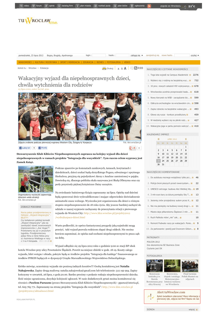 video forum poniedziałek, 23 lipca 2012 opinie katalog firm plan miasta Bogny, Brygidy, Apolinarego login : rozkład jazdy plan lotów ogłoszenia hasło : 21°c pogoda we Wrocławiu zarejestruj się nowe hasło WIADOMOŚCI | KULTURA I ROZRYWKA | SPORT I REKREACJA | EDUKACJA | BIZNES | FOTOGALERIA | VIDEO Jesteś tu : Wrocław Edukacja Drukuj NAJCZĘŚCIEJ CZYTANE WIADOMOŚCI Wakacyjny wyjazd dla niepełnosprawnych dzieci, chwila wytchnienia dla rodziców 1. Tego lata wyjedź na Campus Akademicki 2276 2. Wybierz się z rodziną na bezpłatną wyc... 732 3. 10 proc. nowych zakażeń HIV wykrywanyc... 678 4. Wrocławska uczelnia przeprowadzi bada... 618 5. Nowy kierunek na WSB - zarządzanie biz... 599 6. Odkrycia archeologów na wrocławskim cm... 598 7. Zapisz dziecko na bezpłatne wakacyjne ... 493 8. Głowa się rusza - konkurs przedłużony 459 9. W niedzielę wybierz się na piknik rodz... 427 23 lipca 2012, autor: bs/inf. pras. 10. Wakacyjna joga w parku pomoże walczyć ... 410 KALENDARZ IMPREZ LIPIEC 2012 Zdjęcie zrobione podczas pierwszej wyprawy Western City, Ścięgny k/ Karpacza Fot. kkn.wroclaw.pl Pn Wt Śr Cz Pt So 2 3 4 5 6 7 8 Stowarzyszenie Klub Kibiców Niepełnosprawnych zaprasza na kolejny wyjazd dla dzieci 9 10 11 12 13 14 15 niepełnosprawnych w ramach projektu "Integracja dla wszystkich". Tym razem celem wyprawy jest 16 17 18 19 20 21 22 Zamek Książ. 23 24 25 26 27 28 29 30 31 Lubię to! 9 Wyślij Nd 1 0 Podczas spacerów po komnatach zamkowych, tarasach, korytarzach i dziedzińcach, dzieci szukać będą skrzydlatego Pegaza, odważnego i sprytnego Herkulesa, przyjrzą się pojedynkowi Ateny z Arachne zamienionej w pająka. NAJCZĘŚCIEJ KOMENTOWANE 1. Do autobusu nocnego wsiądziesz tylko prz... 46 2. Policja broni pieszych przed rowerzystam... 22 3. UNESCO ostrzega: budowa Alei Wielkiej Wy... 19 4. 3 mln euro kary za dziurę pomiędzy Sky T... 13 animatorki czasu wolnego. Wycieczka jest organizowana dla dzieci o różnym 5. Jesienią znów przejedziesz autem przez K... 12 stopniu niepełnosprawności do 18 roku życia. Aby jeszcze bardziej zachęcić do 6. Nie ma pieniędzy na budowę nowej drogi i... 11 7. Miasto daje piłkarskiemu Śląskowi 2 mln ... 11 8. Ruch Palikota mówi „nie” zak... 10 Dowiedzą się, dlaczego pobliska skała nazywana jest Skałą Olbrzyma oraz czy perły przyniosły pięknej księżniczce Daisy szczęście. Organizatorzy wycieczki zapewniają dzieciom wiele atrakcji Fot. kkn.wroclaw.pl ZOBACZ PODOBNE Na zwiedzanie baśniowego Książa zapraszamy 29 lipca. Opiekę nad dziećmi będą sprawować dwie wykwalifikowane i mające odpowiednie doświadczenie udziału w naszej wyprawie zachęcamy do przeczytania relacji z pierwszego Nocny pokaz przedpremierowy w Heliosie: „Wyjazd integracyjny” BILETY! Czy bohaterom polskiej komedii „Wyjazd integracyjny” uda się zawstydzić nawet zwariowanych imprezowiczów z „Kac Vegas”? Przekonamy się już w przyszłym tygodniu. Przedpremierowy pokaz filmu w kinie Helios przy ul. Kazimierza Wielkiego w nocy z 3 na 4 listopada. 2011-10-28 wyjazdu do Western City: http://www.kkn.wroclaw.pl/projekty2012 /wyd02karpacz-dzieci.html 9. Remont Podwala ruszy po wakacjach. Ponie... 9 10. Za parkowanie i postój pod Dworcem Główn... 8 Warto podkreślić, że oprócz fantastycznej przygody jaką najmłodsi mogą przeżyć, taki wyjazd pozwala rodzicom złapać drugi oddech. Nie można bowiem zapominać, że opieka nad osobami niepełnosprawnymi to praca 24h na dobę. PATRONATY POLCON 2012 Wyjazd odbędzie się 29 lipca 2012 roku o godzinie 9:00 ze stacji BP obok hotelu Wrocław przy ulicy Powstańców Śląskich. Powrót na miejsce zbiórki w godz. 18-19. Koszty całego wyjazdu, bilet wstępu i obiadu, pokryte będą ze środków projektu "Integracja dla każdego" finansowanego ze Gra ekonomiczna BZ Business Zone Czytanie jest OK FOTOGALERIA środków PFRON będących w dyspozycji Urzędu Marszałkowskiego Województwa Dolnośląskiego. Krótko mówiąc, uczestniczy wyjazdu nie poniosą żadnych kosztów!!! Osobą kontaktową jest Natalia Nahajowska. Zapisy drogą mailową: [email protected] lub telefonicznie: 512 192 994. Zapisy kończymy w czwartek, 26 lipca, o godz.20.00. Bardzo prosimy o podanie rodzaju niepełnosprawności dziecka. Ilość miejsc ograniczona, decyduje kolejność zgłoszeń. W razie dodatkowych pytań można kontaktować się również z Pawłem Parusem (prezes Stowarzyszenia Klub Kibiców Niepełnosprawnych) - [email protected], Renowacja Kierownica, Finał turnieju kościoła p.w. drążek i sztaluga. Polish Masters na Karola Motoryzacyjnozdjęciach Boromeusza przy lotnicza wystawa ulicy Kruczej we Wrocławiu tel. 603 765 771. Zapraszamy na stronę projektu "Integracja dla wszystkich": http://www.kkn.wroclaw.pl /projekty2012/aktualnosci.html Alert tuWroclaw.com Byłeś świadkiem zdarzenia? Masz informację z pierwszej ręki, zdjęcia lub film? Napisz do nas ! REKLAMA PAYPER.PL SONDA więcej Co sądzisz o idei zakazu picia alkoholu, grillowania i palenia w parkach? Jestem absolutnie za - dość dewastowania zieleni To chore ograniczanie wolności mieszkańców miasta Pomysł dobry, ale nie do wyegzekwowania Wrocławscy urzędnicy powinni zająć się ważniejszymi sprawami głosuj TuWroclaw.com - życie miasta w internecie zobacz wyniki PREZENTUJEMY Lubię to! ATOM Nieruchomości Wrocław - Mieszkania dla każdego SKOK ZTP Radio Taxi Wrocław Liczba osób, które lubią TuWroclaw.com - życie miasta w internecie: 10,263. Hotele we Wrocławiu AP Edukacja Wrocław Design Institute Agnieszka Ada Dorota Tomek Mateusz Anna W ioletta Ewelina Kasia Karolina Daniel Medytacja Aquapark Wrocław Szkoła Rzemiosł Artystycznych tuWroclaw.com - puls Wrocławia w internecie w Restauracja Brasserie 27 WCT Spartan Jega Meble +138 dzieci niepełnosprawne wyjazd integracyjny wakacje dla dzieci niepełnosprawnych Stowarzyszenie Klub Kibiców Niepełnosprawnych Integracja dla wszystkich poleć zn