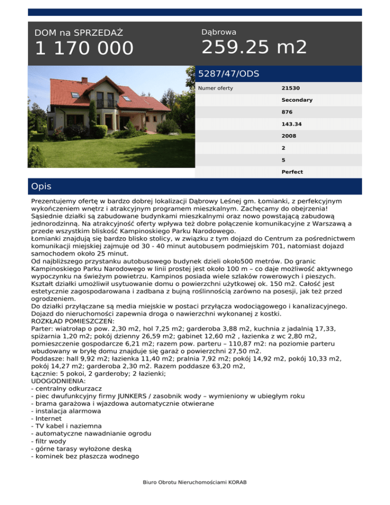 DOM na SPRZEDAŻ 1 170 000 Dąbrowa 259.25 m2 5287/47/ODS Numer oferty 21530 Secondary 876 143.34 2008 2 5 Perfect Opis Prezentujemy ofertę w bardzo dobrej lokalizacji Dąbrowy Leśnej gm. Łomianki, z perfekcyjnym wykończeniem wnętrz i atrakcyjnym programem mieszkalnym. Zachęcamy do obejrzenia! Sąsiednie działki są zabudowane budynkami mieszkalnymi oraz nowo powstającą zabudową jednorodzinną. Na atrakcyjność oferty wpływa też dobre połączenie komunikacyjne z Warszawą a przede wszystkim bliskość Kampinoskiego Parku Narodowego. Łomianki znajdują się bardzo blisko stolicy, w związku z tym dojazd do Centrum za pośrednictwem komunikacji miejskiej zajmuje od 30 - 40 minut autobusem podmiejskim 701, natomiast dojazd samochodem około 25 minut. Od najbliższego przystanku autobusowego budynek dzieli około500 metrów. Do granic Kampinoskiego Parku Narodowego w linii prostej jest około 100 m – co daje możliwość aktywnego wypoczynku na świeżym powietrzu. Kampinos posiada wiele szlaków rowerowych i pieszych. Kształt działki umożliwił usytuowanie domu o powierzchni użytkowej ok. 150 m2. Całość jest estetycznie zagospodarowana i zadbana z bujną roślinnością zarówno na posesji, jak też przed ogrodzeniem. Do działki przyłączane są media miejskie w postaci przyłącza wodociągowego i kanalizacyjnego. Dojazd do nieruchomości zapewnia droga o nawierzchni wykonanej z kostki. ROZKŁAD POMIESZCZEŃ: Parter: wiatrołap o pow. 2,30 m2, hol 7,25 m2; garderoba 3,88 m2, kuchnia z jadalnią 17,33, spiżarnia 1,20 m2; pokój dzienny 26,59 m2; gabinet 12,60 m2 , łazienka z wc 2,80 m2, pomieszczenie gospodarcze 6,21 m2; razem pow. parteru – 110,87 m2: na poziomie parteru wbudowany w bryłę domu znajduje się garaż o powierzchni 27,50 m2. Poddasze: hall 9,92 m2; łazienka 11,40 m2; pralnia 7,92 m2; pokój 14,92 m2, pokój 10,33 m2, pokój 14,27 m2; garderoba 2,30 m2. Razem poddasze 63,20 m2, Łącznie: 5 pokoi, 2 garderoby; 2 łazienki; UDOGODNIENIA: - centralny odkurzacz - piec dwufunkcyjny firmy JUNKERS / zasobnik wody – wymieniony w ubiegłym roku - brama garażowa i wjazdowa automatycznie otwierane - instalacja alarmowa - Internet - TV kabel i naziemna - automatyczne nawadnianie ogrodu - filtr wody - górne tarasy wyłożone deską - kominek bez płaszcza wodnego Biuro Obrotu Nieruchomościami KORAB - podłogi drewniane: a) dół – deska merbau; b) góra – deska jesion - ogrzewanie podłogowe: kuchnia, jadalnia, korytarze (wiatrołap), łazienki - rozprowadzona instalacja do kina domowego - domofon - markiza tarasowa wykonana w ubiegłym roku nad całym tarasem - okna PCV w kolorze złotego dębu - rolety w oknach i moskitiery - furtka do lasu (Kampinoski Park Narodowy) Istnieje możliwość podłączenia sauny Wszelkie informacje o nieruchomości oferowane przez Biuro Korab są aktualne i sprawdzone pod względem merytorycznym oraz prawnym przez jej Agentów działających w Systemie Wymiany Ofert. Maria Myślińska tel. 500 113 114 tel. (22) 751 44 22 email: [email protected] Biuro Obrotu Nieruchomościami KORAB Powered by TCPDF (www.tcpdf.org)