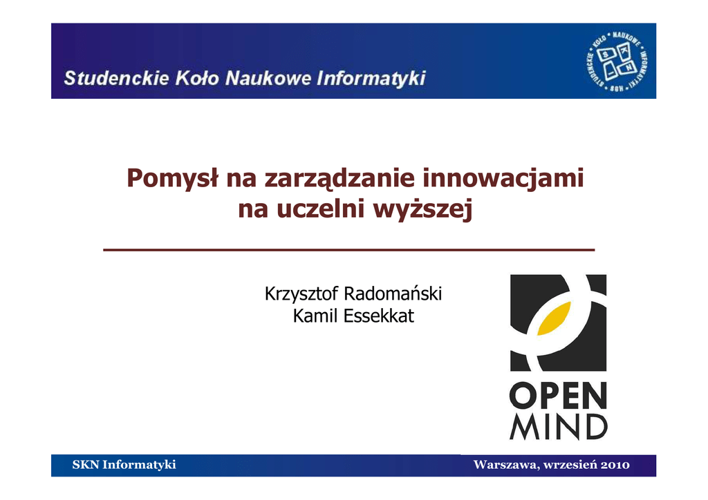 Pomysł na zarządzanie innowacjami na uczelni wyższej Krzysztof Radomański Kamil Essekkat SKN Informatyki Warszawa, wrzesień 2010 Moderacja Komunikacja Wyszukiwanie Trwałe odnotowanie SKN Informatyki Jedno miejsce zgłaszania Stała dostępność Warszawa, wrzesień 2010 IdeaTorrent na uczelni Nasza propozycja rozwiązania SKN Informatyki Warszawa, wrzesień 2010 SKN Informatyki Warszawa, wrzesień 2010 Czym jest IdeaTorrent? • Modułem dla CMS Drupal • Gotowym i działającym systemem zarządzania ideami • SKN Informatyki Na licencji GPL Warszawa, wrzesień 2010 … a czym nie jest? • Bugtrackerem • Systemem ticketów • Wiki SKN Informatyki Warszawa, wrzesień 2010 Funkcjonalności • Kanały RSS • Wyszukiwanie duplikatów • Kategorie pomysłów SKN Informatyki Warszawa, wrzesień 2010 Wdrożenie • 1-rdzeniowy procesor • 512 MB RAM • Tydzień czasu • Apache, Debian i PostgreSQL SKN Informatyki Warszawa, wrzesień 2010 Przyszłość • Dostęp mobilny • Kategoryzacja komentarzy i propozycji rozwiązań • Samodzielny system zamiast wtyczki SKN Informatyki Warszawa, wrzesień 2010 Dziękujemy za uwagę [email protected] [email protected] SKN Informatyki Warszawa, wrzesień 2010