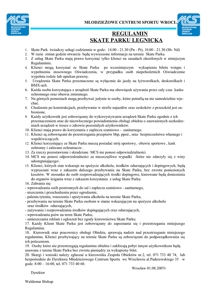 MŁODZIEŻOWE CENTRUM SPORTU WROCŁAW REGULAMIN SKATE PARKU LEGNICKA 1. Skate Park świadczy usługi codziennie w godz: 14.00 - 21.30 (Pn - Pt), 10.00 - 21.30 (Sb- Nd) 2. W razie zmian godzin otwarcia będą wywieszone informacje na terenie Skate Parku. 3. Z usług Skate Parku mają prawo korzystać tylko klienci na zasadach określonych w niniejszym Regulaminie. 4. Klienci mogą korzystać ze Skate Parku po wcześniejszym wykupieniu biletu wstępu i wypełnieniu stosownego Oświadczenia, w przypadku osób niepełnoletnich Oświadczenie wypełnia rodzic lub opiekun prawny. 5. Urządzenia Skate Parku przeznaczone są wyłącznie do jazdy na łyżworolkach, deskorolkach i BMX-ach. 6. Każda osoba korzystająca z urządzeń Skate Parku ma obowiązek używania przez cały czas kasku ochronnego oraz obuwia zmiennego. 7. Na górnych pomostach mogą przebywać jedynie te osoby, które potrafią na nie samodzielnie wjechać. 8. Chodzenie po konstrukcjach, przebywanie w strefie najazdów oraz zeskoków z przeszkód jest zabronione. 9. Każdy użytkownik jest zobowiązany do wykorzystywania urządzeń Skate Parku zgodnie z ich przeznaczeniem oraz do niezwłocznego powiadomienia obsługi obiektu o zauważonych uszkodzeniach urządzeń w trosce o zdrowie pozostałych użytkowników. 10. Klienci mają prawo do korzystania z zaplecza szatniowo - sanitarnego. 11. Klienci są zobowiązani do przestrzegania przepisów bhp, ppoż., oraz bezpieczeństwa własnego i współćwiczących. 12. Klienci korzystający ze Skate Parku muszą posiadać strój sportowy, obuwie sportowe , kask ochronny i zalecane ochraniacze . 13. Za rzeczy pozostawione i skradzione MCS nie ponosi odpowiedzialności. 14. MCS nie ponosi odpowiedzialności za nieszczęśliwe wypadki /które nie zdarzyły się z winy udostępniającego/. 15. Klienci, których stan wskazuje na spożycie alkoholu, środków odurzających i dopingowych, będą wypraszani wraz z zakazem dalszego przebywania na Skate Parku, bez zwrotu poniesionych kosztów. W stosunku do osób rozprowadzających środki dopingowe, kierowane będą doniesienia do organów ścigania wraz z zakazem korzystania z usług Skate Parku. 16. Zabrania się: - wprowadzania osób postronnych do sal i zaplecza szatniowo - sanitarnego, - niszczenia i przechodzenia przez ogrodzenie, - palenia tytoniu, wnoszenia i spożywania alkoholu na terenie Skate Parku, - przebywania na terenie Skate Parku osobom w stanie wskazującym na spożycie alkoholu oraz środków odurzających, - zażywania i rozprowadzania środków dopingujących oraz odurzających, - wprowadzania psów na teren Skate Parku, - umieszczania reklam i ogłoszeń bez zgody kierownictwa Skate Parku. 17. Każdy Klient Skate Parku jest zobowiązany do zapoznania się i przestrzegania niniejszego Regulaminu. 18. Kierownik oraz pracownicy obsługi Obiektu, sprawują nadzór nad przestrzeganie niniejszego regulaminu. Klienci przebywający na terenie Skate Parku są zobowiązani do podporządkowania się ich poleceniom. 19. Osoby które nie przestrzegają regulaminu obiektu i zakłócają pobyt innym użytkownikom będą usuwane z terenu Skate Parku bez zwrotu pieniędzy za wykupiony bilet. 20. Skargi i wnioski należy zgłaszać u kierownika Zespołu Obiektów nr.2, tel. 071 733 40 74, lub bezpośrednio do Dyrektora Młodzieżowego Centrum Sportu we Wrocławiu al.Paderewskiego 35 w godz. 8:00 – 16:00, tel. 071 733 40 60. Wrocław 01.08.2007r Dyrektor Waldemar Biskup