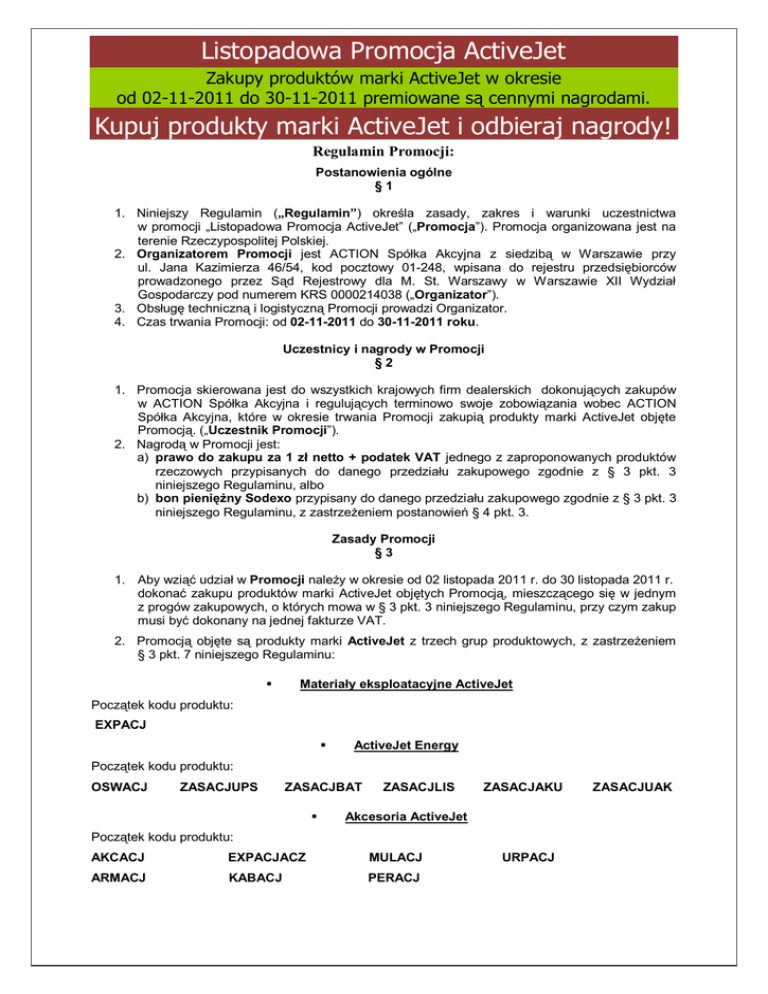 Listopadowa Promocja ActiveJet Zakupy produktów marki ActiveJet w okresie od 02-11-2011 do 30-11-2011 premiowane są cennymi nagrodami. Kupuj produkty marki ActiveJet i odbieraj nagrody! Regulamin Promocji: Postanowienia ogólne §1 1. Niniejszy Regulamin („Regulamin”) określa zasady, zakres i warunki uczestnictwa w promocji „Listopadowa Promocja ActiveJet” („Promocja”). Promocja organizowana jest na terenie Rzeczypospolitej Polskiej. 2. Organizatorem Promocji jest ACTION Spółka Akcyjna z siedzibą w Warszawie przy ul. Jana Kazimierza 46/54, kod pocztowy 01-248, wpisana do rejestru przedsiębiorców prowadzonego przez Sąd Rejestrowy dla M. St. Warszawy w Warszawie XII Wydział Gospodarczy pod numerem KRS 0000214038 („Organizator”). 3. Obsługę techniczną i logistyczną Promocji prowadzi Organizator. 4. Czas trwania Promocji: od 02-11-2011 do 30-11-2011 roku. Uczestnicy i nagrody w Promocji §2 1. Promocja skierowana jest do wszystkich krajowych firm dealerskich dokonujących zakupów w ACTION Spółka Akcyjna i regulujących terminowo swoje zobowiązania wobec ACTION Spółka Akcyjna, które w okresie trwania Promocji zakupią produkty marki ActiveJet objęte Promocją. („Uczestnik Promocji”). 2. Nagrodą w Promocji jest: a) prawo do zakupu za 1 zł netto + podatek VAT jednego z zaproponowanych produktów rzeczowych przypisanych do danego przedziału zakupowego zgodnie z § 3 pkt. 3 niniejszego Regulaminu, albo b) bon pieniężny Sodexo przypisany do danego przedziału zakupowego zgodnie z § 3 pkt. 3 niniejszego Regulaminu, z zastrzeżeniem postanowień § 4 pkt. 3. Zasady Promocji §3 1. Aby wziąć udział w Promocji należy w okresie od 02 listopada 2011 r. do 30 listopada 2011 r. dokonać zakupu produktów marki ActiveJet objętych Promocją, mieszczącego się w jednym z progów zakupowych, o których mowa w § 3 pkt. 3 niniejszego Regulaminu, przy czym zakup musi być dokonany na jednej fakturze VAT. 2. Promocją objęte są produkty marki ActiveJet z trzech grup produktowych, z zastrzeżeniem § 3 pkt. 7 niniejszego Regulaminu: Materiały eksploatacyjne ActiveJet Początek kodu produktu: EXPACJ ActiveJet Energy Początek kodu produktu: OSWACJ ZASACJUPS ZASACJBAT ZASACJLIS ZASACJAKU Akcesoria ActiveJet Początek kodu produktu: AKCACJ EXPACJACZ MULACJ ARMACJ KABACJ PERACJ URPACJ ZASACJUAK 3. Progi zakupowe, których realizacja uprawnia do udziału w Promocji podane są w wartościach netto w złotych polskich. Przy zamówieniu promocyjnym w każdym przedziale zakupowym do wyboru jest jedna z zaproponowanych nagród, zgodnie z poniższą tabelą: NAGRODA DO WYBORU: ZESTAW WKRĘTAKÓW STANLEY 0-63-022 ALBO CZAJNIK ELEKTRYCZNY PHILIPS HD 4646/70 ALBO BON SODEXO O WARTOŚCI 50 PLN ZESTAW SZTUDCÓW FISKARS FUNCTIONAL FORM 856116 16 SZT. ALBO PORTFEL DAMSKI WITTCHEN ITALY 21-1-362 ALBO PORTFEL MĘSKI WITTCHEN ITALY 21-1-040-1 ALBO BON SODEXO O WARTOŚCI 80 PLN ZESTAW WIELOFUNKCYJNY DREMEL 7700-20 WHITE EDITION ALBO KUCHENKA MIKROFALOWA ZELMER 29Z017 ALBO BON SODEXO O WARTOŚCI 140 PLN ZESTAW GARNKÓW TEFAL 8 CZĘŚCI VOLUPTY C806S854 ALBO NAWIGACJA TOMTOM XL IQ ROUTES EDITION 2 POLAND ALBO BON SODEXO O WARTOŚCI 200 PLN ODŚNIEŻARKA ELEKTRYCZNA HECHT 9161 ALBO MONITOR SAMSUNG LED 22" S22A300B CZARNY ASAP ALBO BON SODEXO O WARTOŚCI 300 PLN MINI WIEŻA JVC UX-F4VBE ALBO APPLE IPOD NANO 16GB 6TH GENERATION ALBO PILARKA SPALINOWA MAKITA DCS4610-35 ALBO BON SODEXO O WARTOŚCI 450 PLN NOTEBOOK LENOVO IDEA PAD S100 N455 1GB 10 250 W7S ALBO TECZKA SKÓRZANA WITTCHEN ITALY 21-3-145-1 ALBO BON SODEXO O WARTOŚCI 650 PLN KONSOLA XBOX 360 S 250GB + KINECT + KINECT ADVENTURE ALBO TABLET SAMSUNG GALAXY TAB P1000 WIFI+3G ALBO BON SODEXO O WARTOŚCI 850 PLN NOTEBOOK ASUS 1215N-BLK189M D525 2GB 12,1 500 ION2 W7H ALBO TELEWIZOR 43" PLAZMOWY SAMSUNG PS43D490 (PLASMA 3D) ALBO BON SODEXO O WARTOŚCI 1050 PLN TELEFON SAMSUNG I9100 GALAXY S II 16GB ALBO TELEWIZOR 37" LCD LG 37LV375S (LED) ALBO BON SODEXO O WARTOŚCI 1300 PLN NOTEBOOK DELL VOSTRO 3550 I5-2520M 4GB 15,6 LED HD AMD6630 W7P ALBO WYBRANY PRODUKT Z OFERTY ACTION W CENIE DO 2400 PLN NETTO ALBO BON SODEXO O WARTOŚCI 2000 PLN CANON EOS 60D+EF 18-55IS+EF 55-250IS+KINGSTON SD6G2/32GB ALBO WYBRANY PRODUKT Z OFERTY ACTION W CENIE DO 4500 PLN NETTO ALBO BON SODEXO O WARTOŚCI 4000 PLN TELEWIZOR 55" LCD SONY KDL-55HX820BAEP (LED 3D) ALBO WYBRANY PRODUKT Z OFERTY ACTION W CENIE DO 6300 ZŁ NETTO ALBO BON SODEXO O WARTOŚCI 5800 PLN ZAKUP Z PRZEDZIAŁU (PLN NETTO) 699 999,99 1 000 1 499,99 1 500 1 999,99 2 000 2 999,99 3 000 3 999,99 4 000 5 499,99 5 500 6 999,99 7 000 8 499,99 8 500 9 999,99 10 000 13 499,99 13 500 24 999,99 25 000 34 999,99 35 000 …. 4. Jeśli suma zamówienia promocyjnego przekracza wartość 8 000 zł netto, po ustaleniu z Handlowcem lub Regionalnym Doradcą Handlowym możliwe jest zrealizowanie go na maksymalnie 3 fakturach VAT. Maksymalny czas realizacji dzielonych zamówień promocyjnych wynosi 3 dni robocze. 5. Zakup produktów marki ActiveJet objętych Promocją o wartości mieszczącej się w jednym z wymienionych w § 3 pkt. 3 Regulaminu progów zakupowych uprawnia Uczestnika Promocji do zakupu za 1 zł netto + podatek VAT nagrody rzeczowej przypisanej do wymienionego progu albo odbioru bonu pieniężnego Sodexo. Nagroda przekazana będzie przy realizacji zamówienia promocyjnego lub zgodnie z § 4 pkt. 2 i 3. Zamówienie promocyjne może być zrealizowane wyłącznie u handlowca lub u Regionalnego Doradcy Handlowego (RDH). Wolę otrzymania nagrody w postaci prawa do promocyjnego zakupu albo bonu pieniężnego Sodexo należy zgłosić telefonicznie bądź mailem handlowcowi lub RDH przed realizacją zamówienia promocyjnego. 6. W czasie trwania Promocji każda firma może dwukrotnie dokonać zakupu promocyjnego. Na zamówieniu promocyjnym mogą znajdować się produkty z różnych grup produktowych marki ActiveJet, przy czym do obliczenia progu uprawniającego do promocyjnego zakupu będą brane tylko