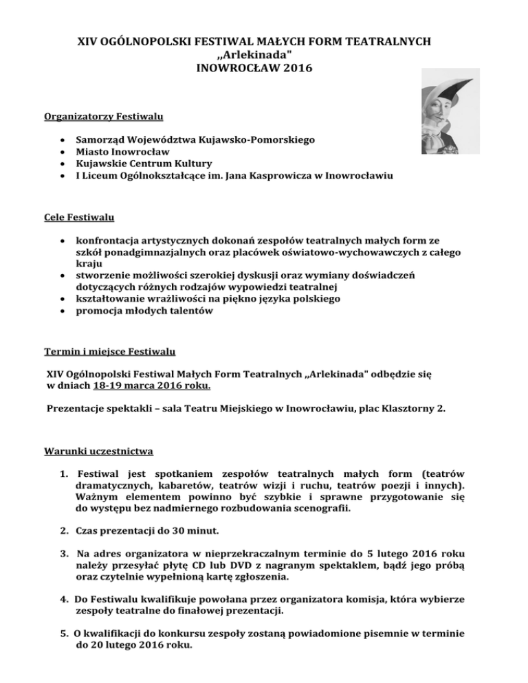 XIV OGÓLNOPOLSKI FESTIWAL MAŁYCH FORM TEATRALNYCH ,,Arlekinada" INOWROCŁAW 2016 Organizatorzy Festiwalu Samorząd Województwa Kujawsko-Pomorskiego Miasto Inowrocław Kujawskie Centrum Kultury I Liceum Ogólnokształcące im. Jana Kasprowicza w Inowrocławiu Cele Festiwalu konfrontacja artystycznych dokonań zespołów teatralnych małych form ze szkół ponadgimnazjalnych oraz placówek oświatowo-wychowawczych z całego kraju stworzenie możliwości szerokiej dyskusji oraz wymiany doświadczeń dotyczących różnych rodzajów wypowiedzi teatralnej kształtowanie wrażliwości na piękno języka polskiego promocja młodych talentów Termin i miejsce Festiwalu XIV Ogólnopolski Festiwal Małych Form Teatralnych ,,Arlekinada" odbędzie się w dniach 18-19 marca 2016 roku. Prezentacje spektakli – sala Teatru Miejskiego w Inowrocławiu, plac Klasztorny 2. Warunki uczestnictwa 1. Festiwal jest spotkaniem zespołów teatralnych małych form (teatrów dramatycznych, kabaretów, teatrów wizji i ruchu, teatrów poezji i innych). Ważnym elementem powinno być szybkie i sprawne przygotowanie się do występu bez nadmiernego rozbudowania scenografii. 2. Czas prezentacji do 30 minut. 3. Na adres organizatora w nieprzekraczalnym terminie do 5 lutego 2016 roku należy przesyłać płytę CD lub DVD z nagranym spektaklem, bądź jego próbą oraz czytelnie wypełnioną kartę zgłoszenia. 4. Do Festiwalu kwalifikuje powołana przez organizatora komisja, która wybierze zespoły teatralne do finałowej prezentacji. 5. O kwalifikacji do konkursu zespoły zostaną powiadomione pisemnie w terminie do 20 lutego 2016 roku. 6. Warunkiem uczestnictwa jest ponadto dokonanie wpłaty w wysokości 60 zł od osoby, w terminie do 26 lutego 2016 roku na konto: Bank Handlowy City 67 1030 1090 0000 0000 9012 4005 z dopiskiem ,,Arlekinada" Ocena i nagrody 1. Profesjonalne Jury przyzna I, II, III nagrodę pieniężną dla zespołów teatralnych oraz nagrody specjalne za indywidualne dokonania twórcze (dla reżyserów, aktorów, scenografów). * jury zastrzega sobie możliwość innego podziału nagród 2. Każdy zespół otrzymuje dyplom uczestnictwa, statuetkę i pamiątkowe zdjęcie. 3. Ponadto swoje nagrody indywidualne i zespołowe przyzna Młodzieżowe Jury. 4. Nagrody zostaną wręczone podczas uroczystej gali. Obecność laureatów jest obowiązkowa, a nieobecność – równoznaczna z rezygnacją z nagrody. Organizatorzy zapewniają wejściówki na koncert Gali Laureatów – Krzysztof Kiljański i The New Warsaw Trio (album „Przybora") Postanowienia końcowe 1. Uczestnikom Festiwalu zapewniamy nocleg z 18 na 19 marca (w wyjątkowych sytuacjach jest możliwość rezerwacji wyżywienia i noclegu z 17 na 18 marca oraz z 19 na 20 marca; należy o tym powiadomić organizatorów do dnia 6 lutego 2016 r.) oraz wyżywienie (suchy prowiant podczas przesłuchań, kolacje – 18 i 19 marca, śniadanie – 19 marca, obiad – 19 marca). 2. Organizatorzy zastrzegają sobie prawo do ustalania kolejności prezentacji konkursowych. 3. Koszty podróży pokrywają jednostki delegujące. Biuro Organizacyjne XIV Ogólnopolskiego Festiwalu Małych Form Teatralnych ,,Arlekinada": Kujawskie Centrum Kultury ul. Jana Kilińskiego 16 88-100 Inowrocław tel./fax 52 357 52 13, tel. 52 357 58 67 e-mail: [email protected] adresy internetowe: www.kck.inowroclaw.pl www.facebook.com/arlekinada.ofmft