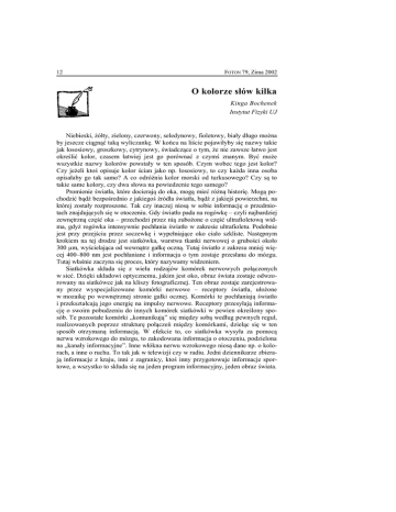 12 FOTON 79, Zima 2002 O kolorze słów kilka Kinga Bochenek Instytut Fizyki UJ Niebieski, żółty, zielony, czerwony, seledynowy, fioletowy, biały długo można by jeszcze ciągnąć taką wyliczankę. W końcu na liście pojawiłyby się nazwy takie jak łososiowy, groszkowy, cytrynowy, świadczące o tym, że nie zawsze łatwo jest określić kolor, czasem łatwiej jest go porównać z czymś znanym. Być może wszystkie nazwy kolorów powstały w ten sposób. Czym wobec tego jest kolor? Czy jeżeli ktoś opisuje kolor ścian jako np. łososiowy, to czy każda inna osoba opisałaby go tak samo? A co odróżnia kolor morski od turkusowego? Czy są to takie same kolory, czy dwa słowa na powiedzenie tego samego? Promienie światła, które docierają do oka, mogą mieć różną historię. Mogą pochodzić bądź bezpośrednio z jakiegoś źródła światła, bądź z jakiejś powierzchni, na której zostały rozproszone. Tak czy inaczej niosą w sobie informację o przedmiotach znajdujących się w otoczeniu. Gdy światło pada na rogówkę – czyli najbardziej zewnętrzną część oka – przechodzi przez nią zubożone o część ultrafioletową widma, gdyż rogówka intensywnie pochłania światło w zakresie ultrafioletu. Podobnie jest przy przejściu przez soczewkę i wypełniające oko ciało szkliste. Następnym krokiem na tej drodze jest siatkówka, warstwa tkanki nerwowej o grubości około 300 µm, wyścielająca od wewnątrz gałkę oczną. Tutaj światło z zakresu mniej więcej 400–800 nm jest pochłaniane i informacja o tym zostaje przesłana do mózgu. Tutaj właśnie zaczyna się proces, który nazywamy widzeniem. Siatkówka składa się z wielu rodzajów komórek nerwowych połączonych w sieć. Dzięki układowi optycznemu, jakim jest oko, obraz świata zostaje odwzorowany na siatkówce jak na kliszy fotograficznej. Ten obraz zostaje zarejestrowany przez wyspecjalizowane komórki nerwowe – receptory światła, ułożone w mozaikę po wewnętrznej stronie gałki ocznej. Komórki te pochłaniają światło i przekształcają jego energię na impulsy nerwowe. Receptory przesyłają informację o swoim pobudzeniu do innych komórek siatkówki w pewien określony sposób. Te pozostałe komórki „komunikują” się między sobą według pewnych reguł, realizowanych poprzez strukturę połączeń między komórkami, dzieląc się w ten sposób otrzymaną informacją. W efekcie to, co siatkówka wysyła za pomocą nerwu wzrokowego do mózgu, to zakodowana informacja o otoczeniu, podzielona na „kanały informacyjne”. Inne włókna nerwu wzrokowego niosą dane np. o kolorach, a inne o ruchu. To tak jak w telewizji czy w radiu. Jedni dziennikarze zbierają informacje z kraju, inni z zagranicy, ktoś inny przygotowuje informacje sportowe, a wszystko to składa się na jeden program informacyjny, jeden obraz świata. FOTON 79, Zima 2002 13 Obróbka i analiza informacji wizualnej nie kończy się na siatkówce. W całym procesie biorą udział jeszcze liczne struktury mózgowe, a wiele aspektów tego zagadnienia jest jeszcze wciąż okrytych tajemnicą. Wróćmy jednak do miejsca, gdzie zostaje odebrana informacja ze środowiska. Receptorów światła jest w oku kilka rodzajów. Przede wszystkim wyróżnia się dwa – czopki i pręciki. Nazwy pochodzą od charakterystycznego kształtu tych komórek. Pręciki są bardzo czułymi receptorami. Pozwalają widzieć przy skąpym oświetleniu. Czopki, mniej więcej 1000 razy mniej czułe, służą widzeniu za dnia. Pojedynczy receptor pochłania światło z różnym prawdopodobieństwem, w zależności od długości fali padającego światła. Jednak kiedy już pochłonie kwant światła, informacja o długości fali zostaje utracona. W odpowiedzi na pochłonięcie jednego kwantu światła czopek generuje zawsze taki sam sygnał. Pojedynczy czopek jest tak samo ślepy na kolory jak pręcik – pozwala tylko odróżnić jasne od ciemnego. Można się o tym przekonać, oglądając małą kolorową kropkę (o średnicy około 0,5 mm). Jeśli powoli odsuwamy obrazek od oczu, w pewnym momencie kropka zrobi się czarna (przy odległości od oczu około 1 m). W takich warunkach kropki tej wielkości są odwzorowywane na obszarze siatkówki porównywalnym z rozmiarami pojedynczego czopka. Ludzkie oko posiada jednak więcej niż jeden rodzaj czopków. Różnią się one widmami absorpcji. Rozróżnia się czopki wrażliwe głównie na fale krótkie typ S, środkowe – typ M i długie – typ L. Nazwy długie – krótkie odnoszą się do zakresu widzialnego widma. Czasem używa się nazw: czopki niebieskie, zielone i czerwone, jednak te określenia mogą być mylące. Maksima absorpcji różnych rodzajów czopków są przesunięte względem siebie, ale te trzy widma razem pokrywają cały zakres widma widzialnego, w taki sposób, że każdy fragment (poza brzegami) jest „obsługiwany” przez dwa typy czopków. Tym samym prawie każda wiązka światła, w tym monochromatyczna, pobudzi przynajmniej dwa różne typy czopków. Wrażenie koloru powstaje, gdy informacja o pobudzeniach różnych receptorów zostaje porównana. Porównanie względnych pobudzeń receptorów pozwala na powstanie nowej jakości – wrażenia koloru. Na rysunku przedstawiono krzywe absorpcji dla czopków ludzkich na tle widma widzianych przez nas barw. Wyobraźmy sobie eksperyment, w którym prezentuje się komuś światło monochromatyczne i że zmieniamy powoli długość fali, zaczynając od 350 nm i posuwając się ku czerwieni. Początkowo badany nie widzi nic. Przy około 400 nm zaczyna dostrzegać światło ciemnoniebieskie – zostały pobudzone tylko czopki typu S, w końcu są też pobudzane czopki typu M, kolor zmienia się na błękit. Stopniowo czopki S są coraz mniej, a czopki M coraz mocniej pobudzane kolor przechodzi w zielony. Równocześnie zaczynają pracować czopki typu L. W momencie, gdy czopki S są już nieaktywne, a pobudzenia cz