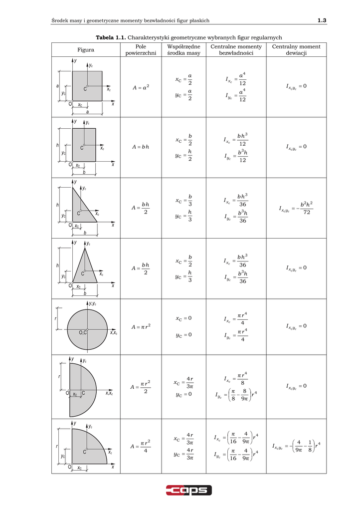 1.3 Środek masy i geometryczne momenty bezwładności figur płaskich Tabela 1.1. Charakterystyki geometryczne wybranych figur regularnych Figura Pole powierzchni Współrzędne środka masy A = a2 a 2 a yC = 2 Centralne momenty bezwładności xC = A = bh A= A= I xc = I yc b 2 h yC = 2 xC = bh 2 b 3 h yC = 3 bh 2 b 2 h yC = 3 A= A= πr 2 πr 4 2 bh3 12 b 3h = 12 I xc = xC = bh3 36 3 I yc = b h 36 I xc = bh3 36 I yc = b 3h 36 xC = 0 I xc = πr4 4 yC = 0 I yc = πr4 4 4r xC = 3π yC = 0 I xc = πr4 8 xC = A =πr2 2 a4 = 12 I xc = I yc a4 12 4r 3π 4r yC = 3π xC = I yc 8 ⎞ 4 ⎛π =⎜ − ⎟r ⎝ 8 9π ⎠ 4 ⎞ 4 ⎛π − I xc = ⎜ ⎟r 16 9 π⎠ ⎝ I yc 4 ⎞ 4 ⎛π =⎜ − ⎟r ⎝ 16 9π ⎠ Centralny moment dewiacji I xc yc = 0 I xc yc = 0 I xc yc = − b 2h 2 72 I xc yc = 0 I xc yc = 0 I xc yc = 0 ⎛ 4 1⎞ 4 I xc yc = −⎜ − ⎟r ⎝ 9π 8 ⎠