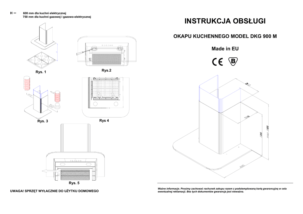 H – 600 mm dla kuchni elektrycznej 750 mm dla kuchni gazowej i gazowo-elektrycznej INSTRUKCJA OBSŁUGI OKAPU KUCHENNEGO MODEL DKG 900 M Made in EU Rys.2 Rys. 1 Rys 4 Rys. 3 Rys. 5 UWAGA! SPRZĘT WYŁACZNIE DO UŻYTKU DOMOWEGO Ważne informacje. Prosimy zachować rachunek zakupu razem z podstemplowaną kartą gwarancyjną w celu ewentualnej reklamacji. Bez tych dokumentów gwarancja jest nieważna. Przepisy instalacyjne, konserwacja i obsługa okapu nadkuchennego Przed montażem proszę się upewnić, czy napięcie zasilania (V) i częstotliwość (Hz) zgodne są z parametrami umieszczonymi na tabliczce znamionowej okapu. Tabliczka znamionowa umieszczona jest wewnątrz okapu. Parametry techniczne Wydajność 520 m3/h Napięcie znamionowe 230V – 50Hz Moc ogólna 160 W Moc silnika 120 W Moc żarówek 2 x 20 W Masa ok. 10 – 12 kg Poziom hałasu – dB(A) min.-41,8; max- 55,8 Okapy wykonane są z najwyższej jakości blachy stalowej nierdzewnej (INOX) Instalacja Okap kuchenny w celu zapewnienia prawidłowej pracy powinien być umieszczony min 60 cm ponad płytą kuchni elektrycznej i min 75 cm w wypadku kuchni gazowej lub wykorzystującej obydwa sposoby ogrzewania (Rys. 1). Okap kuchenny jest przeznaczony do wyprowadzania zapachów i oparów z pomieszczeń kuchennych, a gdy działa w obiegu zamkniętym, do filtracji powietrza i odprowadzania go z powrotem do tego samego pomieszczenia (pochłaniacz). Instalacja musi być dostosowana do sposobu użytkowania okapu. Wykorzystanie okapu jako pochłaniacza jest najlepszym rozwiązaniem w przypadku, gdy nie ma możliwości zainstalowania rur wyprowadzających powietrze na zewnątrz pomieszczenia, oraz gdy przepisy nie pozwalają na podłączenie okapu do kanałów wentylacyjnych. Oświetlenie W oprawach zainstalowane są dwie żarówki halogenowe o mocy 20 W (Rys. 2). Nie wolno używać żarówek o mocy wyższej niż 20 W ponieważ może to doprowadzić do miejscowego przegrzania elementów okapu. Obieg zamknięty powietrza Okap może być wyposażony w filtry węglowe (zapachowe), które są sprzedawane oddzielnie. Filtry należy umieść, w dolnej części okapu, ponad filtrem aluminiowym (Rys. 4). W tym wypadku powietrze jest z powrotem odprowadzane do pomieszczenia. Okap nie powinien być wówczas podłączony do kanałów wentylacyjnych. W celu zapewnienia prawidłowej pracy okapu i skutecznego pochłaniania zapachów należy regularnie wymieniać filtry węglowe (co 3 do 6 miesięcy w zależności od intensywności użytkowania okapu. Wyprowadzenie powietrza na zewnątrz. (Rys. 3) Okap kuchenny może być podłączony do wylotu powietrza rurami o średnicy 150 mm lub 120 mm z redukcją 150/120. Rurę należy umieścić na plastikowym kołnierzu wylotu powietrza z okapu. Należy unikać stosowania długich rur i kolan. Rury poziome muszą być ustawione pod niewielkim nachyleniem w kierunku wypływu powietrza. Do osłonięcia wylotu powietrza i rur odprowadzających powietrze służy teleskopowa rura osłonowa, stanowiąca element okapu. Po instalacji rurę osłonową należy przymocować do ściany. Używanie spiralnych rur aluminiowych ogranicza wydajność okapu. Powietrze wyprowadzane na zewnątrz nie może być kierowane do kanałów wentylacyjnych służących do wyciągania dymu z urządzeń używających gaz lub inne paliwa. Należy również przestrzegać ogólnie obowiązujących przepisów dotyczących odprowadzania powietrza z pomieszczenia. Instalacja elektryczna Należy upewnić się, że sieć elektryczna posiada takie samo napięcie jak określone na tabliczce znamionowej we wnętrzu okapu. Instalacja elektryczna może być montowana jedynie przez osobę z uprawnieniami.Urządzenie musi być umieszczone w sposób pozwalający na łatwy dostęp do kontaktu i łatwe odłączenie od sieci. Działanie Aby umożliwić prawidłowe działanie okapu, musi on być włączony natychmiast po włączeniu kuchenki. Po zakończeniu gotowania, należy odczekać 10 minut i dopiero wtedy wyłączyć okap. W czasie gotowania należy unikać przeciągów ponieważ powstające prądy powietrza mieszają się z parą powstałą podczas gotowania i powodują jej rozchodzenie się po całym pomieszczeniu. Sterowanie elektroniczne z pilotem Na panelu sterującym umieszczonym po prawej stronie na froncie okapu znajdują się następujące elementy. Osłona czujnika podczerwieni umożliwiająca sterowanie pilotem Osłona diody – zmiana natężenia światła od zielonego do intensywnego czerwonego oznacza kolejne stopnie prędkości pracy turbiny okapu, regulacja 7-stopniowa. Przyciski posiadają następujące funkcje: Światło - włącza / wyłącza oświetlenie okapu, I/O - włącza / wyłącza pracę turbiny okapu, + - zwiększa prędkość pracy turbiny, - zmniejsza prędkość pracy turbiny. Przyciski reaguję przy naciśnięciu z niewielką siłą. Ustawienie prędkości pracy turbiny: Zwiększenie prędkości pracy turbiny powoduje zwiększenie przepływu powietrza i szybsze oczyszczanie pomieszczenia. Sterowanie prędkością pracy turbiny umożliwia ustawienie 7 stopni pracy turbiny. Turbina rozpoczyna pracę po naciśnięciu jednego z przycisków: I/O - turbina rozpoczyna pracę z prędkością przy jakiej pracowała przed ostatnim wyłączeniem, (gdy turbina jest włączana po raz pierwszy lub gdy jest włączona po przerwie w dopływie prądu rozpoczyna pracę ze średnią prędkością) + - silnik rozpoczyna pracę z maksymalną prędkością, - silnik rozpoczyna pracę z minimalną prędkością. Praca turbiny zostaje zatrzymana po wciśnięciu przycisku I/O. Szybkość pracy turbiny wzrasta po naciśnięciu przycisku (+). Jednokrotne przyciśniecie powoduje wzrost prędkości pracy turbiny o 1 stopień. Szybkość pracy turbiny zmniejsza się po naciśnięciu przycisku (-). Jednokrotne przyciśniecie powoduje wzrost prędkości pracy turbiny o 1 stopień. Wyłącznik czasowy (timer) – praca turbiny zostaje automatycznie zatrzyman
