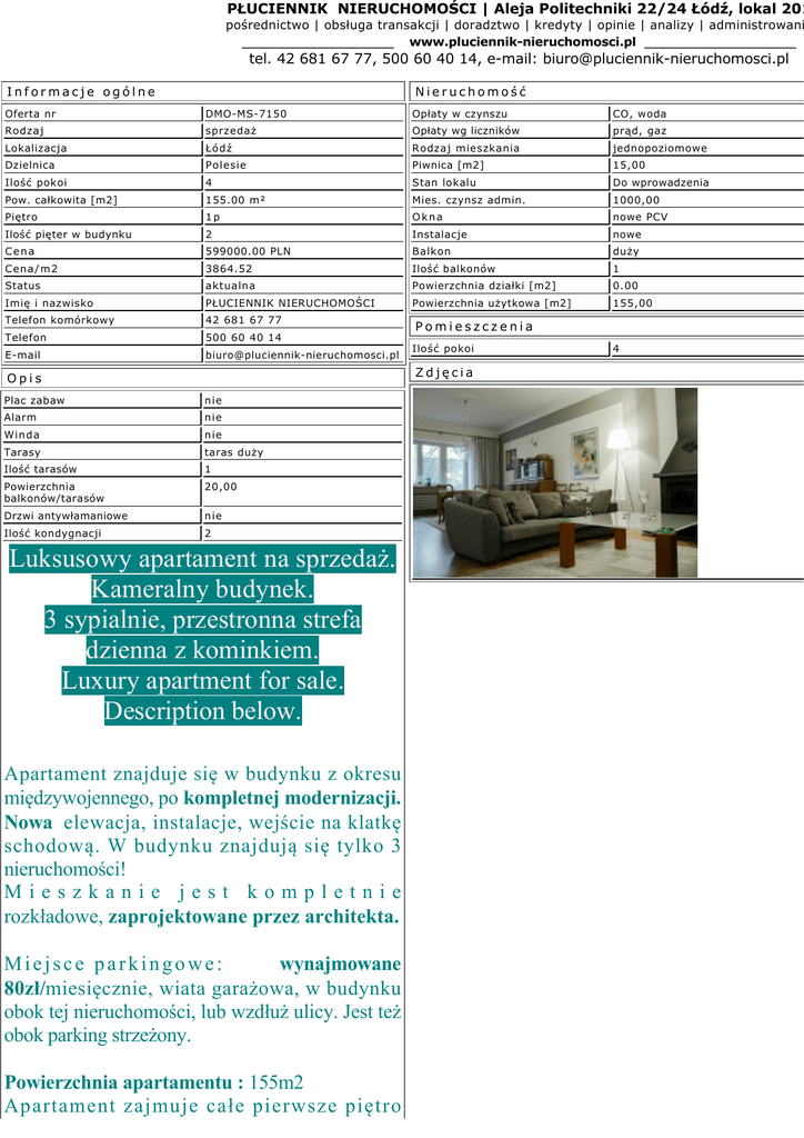 PŁUCIENNIK NIERUCHOMOŚCI | Aleja Politechniki 22/24 Łódź, lokal 201 pośrednictwo | obsługa transakcji | doradztwo | kredyty | opinie | analizy | administrowani _______________ www.pluciennik-nieruchomosci.pl _______________ tel. 42 681 67 77, 500 60 40 14, e-mail: [email protected] Informacje ogólne Nieruchomość Oferta nr DMO-MS-7150 Opłaty w czynszu CO, woda Rodzaj sprzedaż Opłaty wg liczników prąd, gaz Lokalizacja Łódź Rodzaj mieszkania jednopoziomowe Dzielnica Polesie Piwnica [m2] 15,00 Ilość pokoi 4 Stan lokalu Do wprowadzenia Pow. całkowita [m2] 155.00 m² Mies. czynsz admin. 1000,00 Piętro 1p Okna nowe PCV Ilość pięter w budynku 2 Instalacje nowe Cena 599000.00 PLN Balkon duży Cena/m2 3864.52 Ilość balkonów 1 Status aktualna Powierzchnia działki [m2] 0.00 Imię i nazwisko PŁUCIENNIK NIERUCHOMOŚCI Powierzchnia użytkowa [m2] 155,00 Telefon komórkowy 42 681 67 77 Telefon 500 60 40 14 E-mail [email protected] Pomieszczenia Ilość pokoi Zdjęcia Opis Plac zabaw nie Alarm nie Winda nie Tarasy taras duży Ilość tarasów 1 Powierzchnia balkonów/tarasów 20,00 Drzwi antywłamaniowe nie Ilość kondygnacji 2 Luksusowy apartament na sprzedaż. Kameralny budynek. 3 sypialnie, przestronna strefa dzienna z kominkiem. Luxury apartment for sale. Description below. Apartament znajduje się w budynku z okresu międzywojennego, po kompletnej modernizacji. Nowa elewacja, instalacje, wejście na klatkę schodową. W budynku znajdują się tylko 3 nieruchomości! Mieszkanie jest kompletnie rozkładowe, zaprojektowane przez architekta. Miejsce parkingowe: wynajmowane 80zł/miesięcznie, wiata garażowa, w budynku obok tej nieruchomości, lub wzdłuż ulicy. Jest też obok parking strzeżony. Powierzchnia apartamentu : 155m2 Apartament zajmuje całe pierwsze piętro 4 budynku. W budynku znajdują się tylko 3 mieszkania. Mieszkanie jest wysokie. Czuć w nim przestrzeń, która daje olbrzymi komfort aranżacyjny. Cena ofertowa : 660.000zł 599.000zł czyli 3860zł/m2. NOWA CENA Czynsz dla wspólnoty: 1000zł. Na powierzchnię mieszkania składa się przestronny hall (ok 20m2). Na podłodze terakota, na ścianach gładzie. Podwieszany sufit z półokrągłym sklepieniem. Po prawej stronie hallu znajduje się mały przedpokój z szafą w zabudowie, oraz wejście do dwóch, przestronnych (ok 16m2 i 18m2) sypialni. W tym jedna z balkonem, druga z garderobą typu "walk-in". W obydwu sypialniach na podłodze piękny, zabytkowy,oryginalny parkiet z o k r e s u międzywojennego. Cichy, po kompletnej renowacji.Na ścianach gładzie. Po lewe stronie hallu znajduje się pomieszczenie gospodarcze z oknem (niegdyś służbówka), ok 6 m2. Również po tej stronie (południowej) mieszkania znajduje się sypialnia. Przestronna łazienka z oknem i świetlikiem. W nowoczesnej glazurze i terakocie. Garderoba. Aby nie zabierać powierzchni głównej sypialni. Od lewej do prawej strony szczytów budynku rozciąga się w kształcie litery L strefa dzienna czyli kuchnia otwarta na jadalnie, z wyjściem na przestronny taras. Z tarasu rozciąga się widok na ogród (budynek nie posiada podwórza). Teren zagospodarowany na zielono. Taras obrośnięty winoroślą. Budynek graniczący z tą posesją (ściana bez okien), obrośnięty bluszczem. Piękny widok o każdej porze roku. Obok jadalni znajduje się salon z kominkiem. W tej części na podłodze również oryginalny parkiet. Apartament jest na tak duży, iż swobodnie może zastępować dom. Wygodna przestrzeń dla rodziny z dwójką dzieci. Świetnie zaprojektowana i w doskonałej lokalizacji. Mimo bliskości do centrum (Piotrkowska 10 minut spacerkiem), znajduje się także blisko terenów zielonych- Park Zdrowie ok. 5 minut samochodem, a także blisko arterii Włókniarzy- szybki wyjazd z miasta. Cicha, spokojna ulica. Oferta dla konesera i wymagającego Klienta. Zapraszam na prezentację. ENGLISH DESCRIPTION If You are looking for apartment that will be located close to city center, and as well to park (Park Zdrowie). The offer is perfect for You! 155 metres square, 3 bedrooms, huge kitchen, dining and living room area. Representative hall. Apartment also have walk in wardrobe in of the bedroom, wardrobe, extra small room (utility) that in the past has beed intended for service worker. Apartment is located at Sklodowska Curie street, on first floor, small, completely renovated building. It is originally from Intwerwar period of time. But has been renovated. Apartment is taking whole floor, so You have only neighbour above, and below. It has a fire place, original wooden floor. Feel free to contact me if You have any other questions. Numer licencji pośrednika prowadzącego 3575; "UWAGA dane o ofercie mogą odbiegać od stanu faktycznego biuro nie odpowiada za niezgodność danych z rzeczywistością. Oferta może być w danym momencie nieaktualna. Prosimy o telefon." Powyższa oferta ma charakter informacyjny i nie stanowi oferty handlowej w rozumieniu art.66 §1 kodeksu cywilnego. Klientom chcemy poświęcać odpowiednią ilość czasu, prosimy o umawianie spotkań. PŁUCIENNIK NIERUCHOMOŚCI | Aleja Politechniki 22/24 Łódź, lokal 201 pośrednictwo | obsługa transakcji | doradztwo | kredyty | opinie | analizy | administrowani _______________ www.pluciennik-nieruchomosci.pl _______________ tel. 42 681 67 77, 500 60 40 14, [email protected]