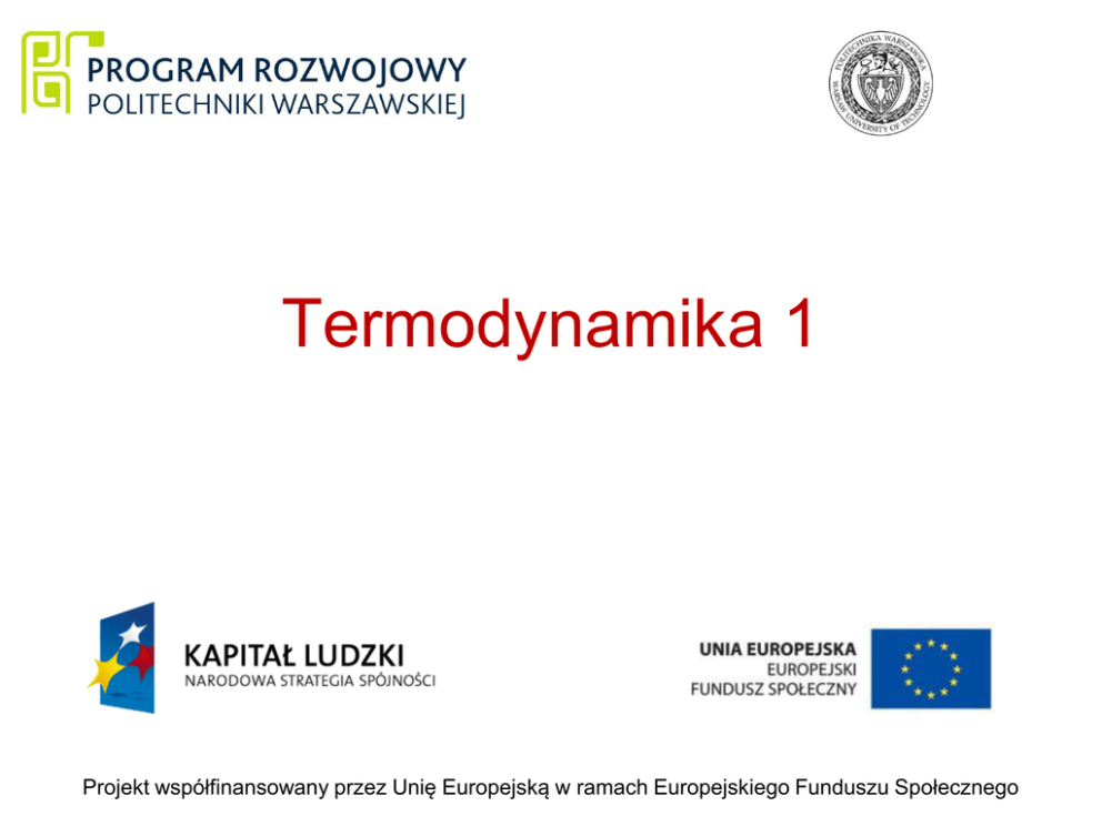 Termodynamika 1 Projekt współfinansowany przez Unię Europejską w ramach Europejskiego Funduszu Społecznego Układ termodynamiczny Układ termodynamiczny – to ciało lub zbiór rozważanych ciał, w którym obok innych zjawisk (mechanicznych, elektrycznych, magnetycznych itd.) uwzględniamy zjawiska cieplne. Stan układu – charakteryzuje własności układu, określony jest przez wartości parametrów stanu. Stan równowagi – to taki stan układu, w którym parametry stanu mają stałe, określone wartości. W stanie równowagi parametry stanu układu nie zmieniają się o ile nie zmieniają się warunki zewnętrzne, w jakich znajduje się układ. Suma energii kinetycznych i potencjalnych wszystkich cząsteczek w układzie to jego energia wewnętrzna. układ termodynamiczny U p, V, T energia parametry wewnętrzna stanu Energia całkowita układu E jest sumą energii: kinetycznej Ek, potencjalnej Ep i wewnętrznej U. E Ek E p U Proces termodynamiczny Przemiana albo proces to przechodzenie układu z jednego stanu równowagi (stan 1) do drugiego (stan 2). Przejściu układu z jednego stanu równowagi (1) do drugiego (2) może towarzyszyć zmiana energii wewnętrznej. DU = U2 – U1 proces termodynamiczny p1, V1, T1 U1 stan (1) p2, V2, T2 U2 = U1 + DU stan (2) Energię można przekazywać ciałom w różny sposób. Przekazywanie energii w postaci ciepła nazywamy dostarczaniem ciepła ciału, a w postaci pracy wykonywaniem pracy nad danym ciałem. Ciepło i pracę mierzymy w tych samych jednostkach. W układzie SI jest to dżul – 1J. Stany skupienia materii Ciało stałe - cząsteczki w ciele stałym oddziałują ze sobą i pozostają w stałych położeniach względem siebie. Mogą tylko wykonywać drgania wokół położeń równowagi. Ciało stałe ma więc ustalony kształt, zachowuje sprężystość postaci. Ciecz - cząsteczki cieczy oddziałują ze znacznie słabiej niż w ciele stałym Mogą poruszać się w dowolnym kierunku, jednak pozostają w zasięgu oddziaływań międzycząsteczkowych. Ciecz ma więc ustaloną objętość, ale nie ma stałego kształtu – przybiera kształt naczynia, w którym się znajduje. Gaz - cząsteczki gazu są tak daleko od siebie, że nie oddziałują ze sobą poza momentami zderzeń. Gaz nie zachowuje kształtu ani objętości – wypełnia całą objętość naczynia, w którym się znajduje. Gaz doskonały Dla charakterystyki gazu doskonałego przyjmujemy, że 1. 2. 3. 4. 5. 6. Gaz składa się z identycznych cząsteczek. Cząsteczki poruszają się chaotycznie i podlegają prawom dynamiki Newtona. Siły działają na cząsteczki tylko w momentach zderzeń. Zderzenia są sprężyste, a czas ich trwania można pominąć. Całkowita liczba cząsteczek jest bardzo duża. Objętość cząsteczek jest zaniedbywalnie mała w porównaniu z objętością gazu. Parametry charakteryzujące gaz to: Temperatura T, która jest miarą średniej energii kinetycznej cząsteczek gazu F Ciśnienie p S (stosunek siły wywieranej na powierzchnię do tej powierzchni) Objętość V Cząsteczki gazu, zderzając się ze ścianką naczynia, działają na nią siłami. Ciśnienie gazu zależy więc od liczby zderzeń (od gęstości) i od energii kinetycznej cząsteczek (od temperatury). Energia wewnętrzna gazu doskonałego to suma energii kinetycznych wszystkich cząsteczek Energia wewnętrzna gazu doskonałego zależy tylko od liczby cząsteczek (masy gazu) i od temperatury (nie zależy ani od ciśnienia ani od objętości) i nie zmienia się, gdy nie zmienia się temperatura gazu. I zasada termodynamiki Energię wewnętrzną można zmienić na dwa sposoby: Poprzez ciepło. Jest to mikroskopowy sposób przekazu energii – jeśli dwa ciała o różnych temperaturach stykają się, cząsteczki ciał zderzają się ze sobą i następuje przekaz energii od ciała o wyższej temperaturze do ciała o niższej temperaturze. Poprzez pracę. Jest to makroskopowy sposób przekazu energii. Przykładem może być sprężanie gazu przez przesuwanie tłoka. Siła zewnętrzna przesuwająca tłok wykonuje pracę, przez co zwiększa się energia wewnętrzna gazu. I zasada termodynamiki wyraża prawo zachowania energii w układach termodynamicznych: Ciepło Q pobrane przez układ termodynamiczny może zostać zużyte na zwiększenie jego energii wewnętrznej i na wykonanie przez układ pracy. Q DU W I zasada termodynamiki I zasadę termodynamiki można też sformułować inaczej: Niemożliwe jest skonstruowanie silnika, który pracowałby bez pobierania energii z otoczenia. Taki hipotetyczny silnik nazwano perpetuum mobile I-go rodzaju. Niekiedy formułuje się pierwszą zasadę termodynamiki jako niemożliwość skonstruowania perpetuum mobile pierwszego rodzaju. Q>0 ciepło pobrane W<0 praca nad układem układ termodynamiczny Q<0 ciepło oddane W>0 praca układu Bilans cieplny W izolowanym układzie termodynamicznym ciał o różnych temperaturach obowiązuje zasada bilansu cieplnego. Q pobrane Qoddane ciepło pobrane przez ciało o niższej temperaturze ciepło oddane przez ciało o wyższej temperaturze Dostarczanie ciepła ciału prowadzi do zmiany jego temperatury lub zmiany jego stanu skupienia (przemiany fazowe). zmiana temperatury ciepło pobrane (oddane) podczas ogrzewania (ochładzania) ciepło właściwe m nM M Q c m DT C nM DT masa ciała ciepło molowe liczba moli ciepło przemiany (topnienia, parowania itd.) ciepło pobrane (oddane) podczas zmiany stanu skupienia Q cz m masa ciała masa ciała masa molowa Równanie stanu gazu doskonałego Każdy gaz rzeczywisty (rozrzedzony, pod małym ciśnieniem) ma właściwości zbliżone do gazu doskonałego. Stan danej masy gazu określony jest przez wartości trzech parametrów: ciśnienia p, objętości V i temperatury T, ujętych równaniem stanu. Równanie stanu (równanie Clapeyrona) gazu doskonałego ma postać: p V nM R T objętość nM liczba moli ciśnienie m M p V nM R T R k NA stała Boltzmanna k 1, 38 1023 J 