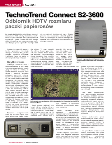 TEST REPORT Box USB TechnoTrend Connect S2-3600 Odbiornik HDTV rozmiaru paczki papierosów Po karcie do PC, którą opisaliśmy w poprzednim numerze TELE-satelity, TechnoTrend zaoferował na rynku odbiornik HDTV o miniaturowych wymiarach - model Connect S2-3600. Malutki odbiornik zasilany jest z zewnętrznego zasilacza i dlatego oprócz wejścia IF i interfejsu USB, Instalacyjny dysk CD zawiera bardzo przydatną instrukcję obsługi w formacie PDF, jak też wszelkie niezbędne sterowniki i aplikacje. Mamy tez ulotkę ze skróconą instrukcją instalacji. Użytkowanie Instalacja Connect S2-3600 i współpracującego z nim oprogramowania oparta jest o zasadę „plug-and-play”, co znaczy, że system Windows wykrywa nowy sprzęt i instaluje wszystkie potrzebne sterowniki automatycznie. Po zakończeniu instalacji, nie trzeba nawet restartować komputera– skrzyneczka nadaje się do użycia natychmiast. Jeśli chodzi o wymagania sprzętowe, TechnoTrend rekomenduje procesor Intel Pentium 3 z zegarem 1 GHz dla normalnego DVB-S. Jeżeli chcemy odbierać HDTV w DVB-S albo DVB-S2, potrzebny będzie Pentium 4 z zegarem 3,4 GHz albo AMD 3500/Dual Core w połączeniu z silną kartą graficzną (AGP lub PCI Express z minimum 64 MB RAM) i systemem Windows XP. Niestety przy Connect S2-3600 nie można wykorzystać żadnych modułów CAM, co oznacza brak możliwości odbioru płatnej TV. Dołączone oprogramowanie dzieli się na dwie części: aplikacji TechnoTrend Media Center nie ma żadnych dodatkowych złącz. Ścianka przednia ma wbudowany odbiornik podczerwieni współpracujący z pilotem zdalnego sterowania, który niestety nie jest najmocniejszą stroną urządzenia. dla odbioru TV oraz narzędzi dla odbioru danych typu Internet przez satelitę. Media Center ma wstępnie zaprogramowaną niemal kompletną listę kanałów popularnego w Europie satelity Astra 19,2° E. Lista jest wygodnie zorganizowana według nadawców, co sprawia, że odnalezienie poszukiwanych kanałów nie zajmuje dużo czasu. Ameryki. Nie wszystkie z nich mają w pełni aktualne dane transponderów, ale biorąc pod uwagę samą liczbę satelitów, łatwo Niewiele większy od paczki papierosów – możemy to wybaczyć. TechnoTrend Connect S2-3600 dla odbioru Dane transponderów HDTV. każdego satelity dają się łatwo rozszerzać i edytować, nie ma również żadzuje się już po dwóch sekundach. Czas przełączania jest krótki jeśli dwa kanały nadawane są z tego samego transpondera, trwa to jedynie sekundę. Pomiędzy różnymi transponderami czas ten wydłuża się do niemal dwóch sekund. Jeśli nadawca dostarcza informacji EPG, odbiornik wyświetla nazwy bieżącego i przyszłego programu w oknie informacyjnym u dołu ekranu. Wielkość tego okna można dowolnie wybierać. Zwierzęta to zawsze świetny obiekt do oglądania. Obrazek z kanału HDTV Promo na Astrze. nego problemu w ustawieniu Jeżeli chcemy odbierać inne dowolnych częstotliwości lokalkanały niż te z satelity Astra, w nego oscylatora. prosty sposób przeprowadzamy ich wyszukiwanie z innego sateOprócz ręcznego przelity. W sumie mamy tu 141 (!) szukiwania transpondera, wstępnie zaprogramowanych załączone oprogramowanie udosatelitów znad Europy, Azji i stępnia także tryb automatyczny, w którym to przeskanowanie 80 transponderów trwa nieco ponad 9 minut. Dostępny jest protokół DiSEqC 1.0 pozwalający przełączać sygnał z maksymalnie czterech konwerterów. Niestety DiSEqC 1.1 mogący obsługiwać do 16 LNB, nie jest dostępny. Dzięki wstępnie zaprogramowanej liście kanałów, oglądanie można rozpocząć natychmiast po instalacji, a pierwszy kanał poka- TELE-satellite International — www.TELE-satellite.com EPG wielu konwencjonalnych set-top-boxów pożółknie z zazdrości. S2-3600 przetwarza wszystkie dane już po kilku sekundach od wejścia na kanał i może wyświetlić nawet opis rozszerzony programu (jeśli jest nadawany) po naciśnięciu guzika. EPG wyświetla również zapisane dane z poprzednio odwiedzanych kanałów. Otrzymujemy więc wygodny dostęp do dużej ilości informacji. Tuner zastosowany przez TechnoTrend jest bardzo czuły i potrafi także przetwarzać wąskopasmowe sygnały SCPC. W czasie testów, poprawnie odbierał sygnał z transpondera o przepływności 1,6 MS/s. Po sprawdzeniu podstawowych funkcji, przeszliśmy rzecz jasna do testów odbioru HDTV. Szybko odszukaliśmy niekodowane kanały na Astrze 19,2° E i już po dwóch sekundach mogliśmy cieszyć oko pierwszym sygnałem o doskonałej jakości obrazu. Dopiero po zestawieniu obok siebie sygnałów HDTV z takim samym sygnałem SDTV, można w pełni docenić ogromną poprawę jaką niesie ze sobą nowa technologia. Choć odbiór SDTV nie nastręczał naszemu procesorowi P4 3,7 GHz żadnego problemu, sytuacja zmieniła się dla HDTV, kiedy to musiał on pracować niemal na granicy swoich możliwości. O ile nie uruchamialiśmy żadnego dodatkowego oprogramowania, mieliśmy doskonałą synchronizację obrazu i dźwięku. Ale, kiedy CPU musiał obsługiwać jeszcze inne aplikacje, albo przesyłał dane przez port USB, wizja HDTV wypadała z synchronizmu. Przy okazji, jeśli macie w PC własny system AC3 lub Dolby Digital z dołączonymi głośnikami, oprócz znakomitego obrazu, otrzymacie jeszcze znakomity dźwięk dookólny. W przeciwieństwie do niektórych set-top-boxów DVB-S2, Media Center TechnoTrend potrafi odbierać transpondery brytyjskiej płatnej TV – SKY Digital, jak też BBC na Astrze 28,2° E. Zatem, jeśli możecie odbierać sygnał z Astry 2 D, nic nie stoi na przeszkodzie, aby oglądać znakomite programy dokumentalne w najwyższej jakości HDTV. Oprócz odbioru TV, dołączone oprogramowanie „Media Center” umożliwia pokazywanie na PC różnego rodzaju wideo, a dzięki funkcji Picture-in-Picture, bieżący obraz TV może być wyświetlany w małym okienku, na przykład podczas przerw reklamowych. Jedna z opcji menu ekranowego słu