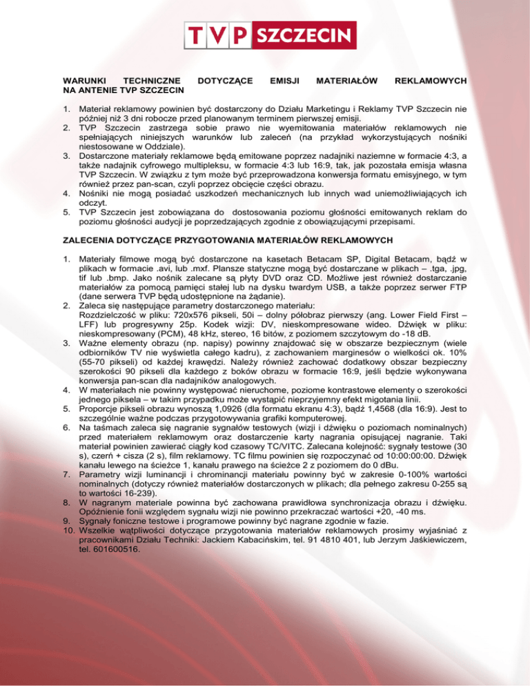 WARUNKI TECHNICZNE NA ANTENIE TVP SZCZECIN DOTYCZĄCE EMISJI MATERIAŁÓW REKLAMOWYCH 1. Materiał reklamowy powinien być dostarczony do Działu Marketingu i Reklamy TVP Szczecin nie później niż 3 dni robocze przed planowanym terminem pierwszej emisji. 2. TVP Szczecin zastrzega sobie prawo nie wyemitowania materiałów reklamowych nie spełniających niniejszych warunków lub zaleceń (na przykład wykorzystujących nośniki niestosowane w Oddziale). 3. Dostarczone materiały reklamowe będą emitowane poprzez nadajniki naziemne w formacie 4:3, a także nadajnik cyfrowego multipleksu, w formacie 4:3 lub 16:9, tak, jak pozostała emisja własna TVP Szczecin. W związku z tym może być przeprowadzona konwersja formatu emisyjnego, w tym również przez pan-scan, czyli poprzez obcięcie części obrazu. 4. Nośniki nie mogą posiadać uszkodzeń mechanicznych lub innych wad uniemożliwiających ich odczyt. 5. TVP Szczecin jest zobowiązana do dostosowania poziomu głośności emitowanych reklam do poziomu głośności audycji je poprzedzających zgodnie z obowiązującymi przepisami. ZALECENIA DOTYCZĄCE PRZYGOTOWANIA MATERIAŁÓW REKLAMOWYCH 1. Materiały filmowe mogą być dostarczone na kasetach Betacam SP, Digital Betacam, bądź w plikach w formacie .avi, lub .mxf. Plansze statyczne mogą być dostarczane w plikach – .tga, .jpg, tif lub .bmp. Jako nośnik zalecane są płyty DVD oraz CD. Możliwe jest również dostarczanie materiałów za pomocą pamięci stałej lub na dysku twardym USB, a także poprzez serwer FTP (dane serwera TVP będą udostępnione na żądanie). 2. Zaleca się następujące parametry dostarczonego materiału: Rozdzielczość w pliku: 720x576 pikseli, 50i – dolny półobraz pierwszy (ang. Lower Field First – LFF) lub progresywny 25p. Kodek wizji: DV, nieskompresowane wideo. Dźwięk w pliku: nieskompresowany (PCM), 48 kHz, stereo, 16 bitów, z poziomem szczytowym do -18 dB. 3. Ważne elementy obrazu (np. napisy) powinny znajdować się w obszarze bezpiecznym (wiele odbiorników TV nie wyświetla całego kadru), z zachowaniem marginesów o wielkości ok. 10% (55-70 pikseli) od każdej krawędzi. Należy również zachować dodatkowy obszar bezpieczny szerokości 90 pikseli dla każdego z boków obrazu w formacie 16:9, jeśli będzie wykonywana konwersja pan-scan dla nadajników analogowych. 4. W materiałach nie powinny występować nieruchome, poziome kontrastowe elementy o szerokości jednego piksela – w takim przypadku może wystąpić nieprzyjemny efekt migotania linii. 5. Proporcje pikseli obrazu wynoszą 1,0926 (dla formatu ekranu 4:3), bądź 1,4568 (dla 16:9). Jest to szczególnie ważne podczas przygotowywania grafiki komputerowej. 6. Na taśmach zaleca się nagranie sygnałów testowych (wizji i dźwięku o poziomach nominalnych) przed materiałem reklamowym oraz dostarczenie karty nagrania opisującej nagranie. Taki materiał powinien zawierać ciągły kod czasowy TC/VITC. Zalecana kolejność: sygnały testowe (30 s), czerń + cisza (2 s), film reklamowy. TC filmu powinien się rozpoczynać od 10:00:00:00. Dźwięk kanału lewego na ścieżce 1, kanału prawego na ścieżce 2 z poziomem do 0 dBu. 7. Parametry wizji luminancji i chrominancji materiału powinny być w zakresie 0-100% wartości nominalnych (dotyczy również materiałów dostarczonych w plikach; dla pełnego zakresu 0-255 są to wartości 16-239). 8. W nagranym materiale powinna być zachowana prawidłowa synchronizacja obrazu i dźwięku. Opóźnienie fonii względem sygnału wizji nie powinno przekraczać wartości +20, -40 ms. 9. Sygnały foniczne testowe i programowe powinny być nagrane zgodnie w fazie. 10. Wszelkie wątpliwości dotyczące przygotowania materiałów reklamowych prosimy wyjaśniać z pracownikami Działu Techniki: Jackiem Kabacińskim, tel. 91 4810 401, lub Jerzym Jaśkiewiczem, tel. 601600516.