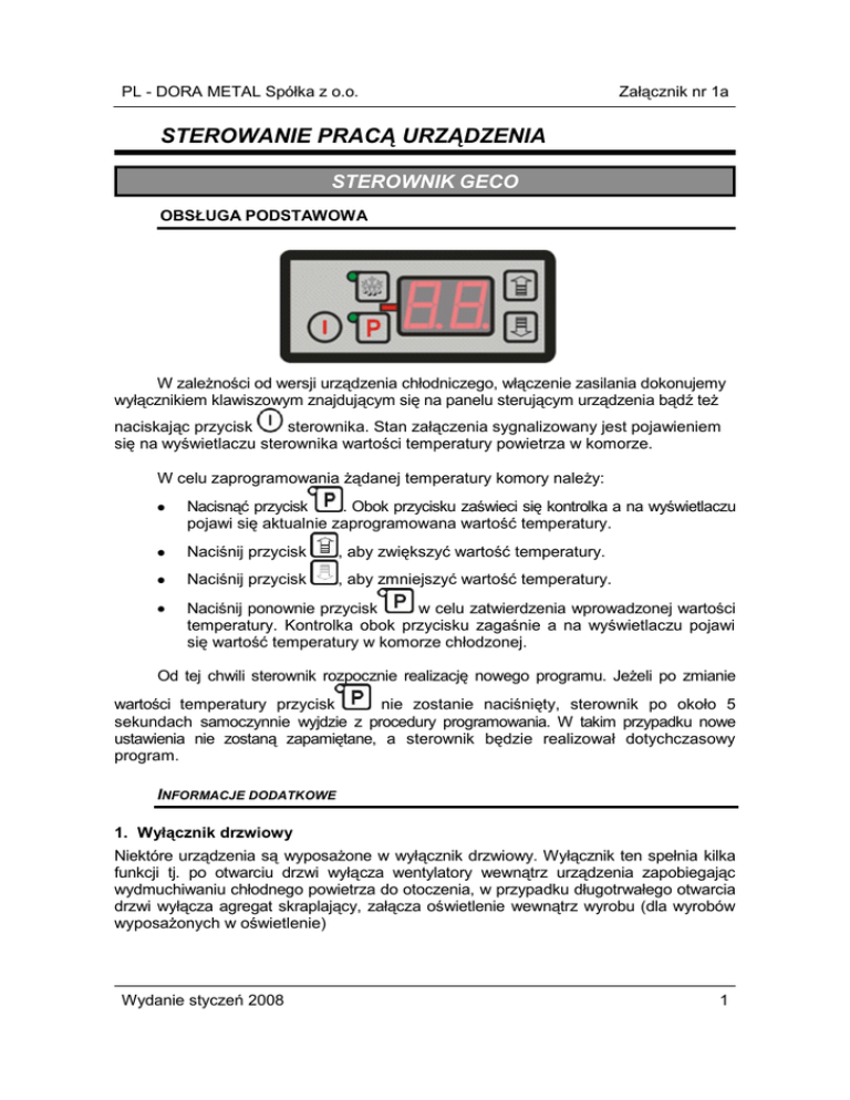 PL - DORA METAL Spółka z o.o. Załącznik nr 1a STEROWANIE PRACĄ URZĄDZENIA STEROWNIK GECO OBSŁUGA PODSTAWOWA W zależności od wersji urządzenia chłodniczego, włączenie zasilania dokonujemy wyłącznikiem klawiszowym znajdującym się na panelu sterującym urządzenia bądź też naciskając przycisk sterownika. Stan załączenia sygnalizowany jest pojawieniem się na wyświetlaczu sterownika wartości temperatury powietrza w komorze. W celu zaprogramowania żądanej temperatury komory należy: Nacisnąć przycisk . Obok przycisku zaświeci się kontrolka a na wyświetlaczu pojawi się aktualnie zaprogramowana wartość temperatury. Naciśnij przycisk , aby zwiększyć wartość temperatury. Naciśnij przycisk , aby zmniejszyć wartość temperatury. Naciśnij ponownie przycisk w celu zatwierdzenia wprowadzonej wartości temperatury. Kontrolka obok przycisku zagaśnie a na wyświetlaczu pojawi się wartość temperatury w komorze chłodzonej. Od tej chwili sterownik rozpocznie realizację nowego programu. Jeżeli po zmianie wartości temperatury przycisk nie zostanie naciśnięty, sterownik po około 5 sekundach samoczynnie wyjdzie z procedury programowania. W takim przypadku nowe ustawienia nie zostaną zapamiętane, a sterownik będzie realizował dotychczasowy program. INFORMACJE DODATKOWE 1. Wyłącznik drzwiowy Niektóre urządzenia są wyposażone w wyłącznik drzwiowy. Wyłącznik ten spełnia kilka funkcji tj. po otwarciu drzwi wyłącza wentylatory wewnątrz urządzenia zapobiegając wydmuchiwaniu chłodnego powietrza do otoczenia, w przypadku długotrwałego otwarcia drzwi wyłącza agregat skraplający, załącza oświetlenie wewnątrz wyrobu (dla wyrobów wyposażonych w oświetlenie) Wydanie styczeń 2008 1 Załącznik nr 1a PL - DORA METAL Spółka. z o.o. Jeżeli w ciągu 30 sekund od momentu otwarcia drzwi nie zostaną one zamknięte, sterownik zasygnalizuje ten fakt krótkim sygnałem dźwiękowym oraz pojawieniem się na wyświetlaczu napisu dr. Sygnał dźwiękowy powtarzany jest, co kolejne 30 sekund. Jeśli po upływie 2 minut (parametr ten programuje producent lub serwis urządzenia) drzwi nadal pozostają otwarte, następuje włączenie alarmu, sygnalizowane miganiem napisu dr oraz ciągłym sygnałem dźwiękowym. W tym momencie także zostaje zatrzymana praca agregatu skraplającego. Wyłączenie alarmu oraz podjęcie pracy przez urządzenie, następuje automatycznie po zamknięciu drzwi. Alarm dźwiękowy można wyciszyć naciskając dowolny klawisz sterownika. 2. Włącznik oświetlenia: W przypadku urządzeń wyposażonych w oświetlenie, włączenie oświetlenia może być dokonane na kilka sposobów (w zależności od wersji urządzenia) tzn. samoczynnie (po otwarciu drzwi), naciskając przycisk lub na oba te sposoby. 3. Rozmrażanie (odszranianie): Podczas pracy urządzenia w regularnych odstępach czasu na wyświetlaczu pojawia się napis dF oznacza to, że urządzenie pracuje w trybie rozmrażania chłodnicy. Cykl rozmrażania oraz czas jego trwania, określa producent urządzenia i użytkownik nie ma wpływu na ten parametr. Jeśli zachodzi potrzeba dodatkowego rozmrożenia chłodnicy, spowodowana trudnymi warunkami pracy urządzenia, należy nacisnąć przycisk . Na wyświetlaczu pojawi się napis dF a obok przycisku zaświeci się kontrolka. Rozmrażanie zostanie zakończone automatycznie po czasie lub osiągnięciu temperatury zaprogramowanej przez producenta. 4. Alarmy: Znaczenie napisów mogących pojawić się na wyświetlaczu: A1 – Uszkodzenie komorowego czujnika temperatury. Sterownik będzie załączał urządzenie w cyklu czasowym, według czasów zaprogramowanych przez producenta. Rozmrażanie będzie funkcjonowało normalnie. W celu usunięcia usterki wezwać serwis. A2 – Uszkodzenie parownikowego czujnika temperatury. Sterownik nie będzie realizował cyklu automatycznego oraz ręcznego rozmrażania. W takim przypadku jedyną możliwością rozmrożenia chłodnicy jest wyłączenie urządzenia i poczekanie na naturalne roztopienie się lodu na chłodnicy. W celu usunięcia usterki wezwać serwis. dF – załączony cykl rozmrażania (patrz punkt ROZMRAŻANIE) dr – otwarte drzwi (patrz punkt WYŁĄCZNIK DRZWIOWY) 2 Wydanie kwiecień 2013 PL - DORA METAL Spółka z o.o. Załącznik nr 1a SCHEMAT INSTALACJI ELEKTRYCZNEJ (SEGMENTY CHŁODNICZE DORJAN, GUSTAW, WIKTOR) Legenda Kolorystyka przewodów: 1. Wyłącznik 2. Wyłącznik oświetlenia 3. Sterownik 4. Czujnik parownikowy 5. Czujnik komorowy 6. Grzałka rozmrażania 7. Chłodnica 8. Agregat skraplający 9. Transformator 10. Oświetlenie BN BU GNYE GY RD WH Wydanie styczeń 2008 - brązowy niebieski żółto-zielony szary (stalowy) czerwony biały 3 Załącznik nr 1a PL - DORA METAL Spółka. z o.o. SCHEMAT INSTALACJI ELEKTRYCZNEJ (WITRYNY CHŁODNICZE, STÓŁ CHŁODNICZY EKSPOZYCYJNY) Legenda: 1. 2. 3. 4. 5. 6. 7. 4 Wyłącznik Sterownik Czujnik parownikowy Czujnik komorowy Grzałka rozmrażania Chłodnica Agregat skraplający Kolorystyka przewodów: BN BU GNYE GY RD WH - brązowy niebieski żółto-zielony szary (stalowy) czerwony biały Wydanie kwiecień 2013