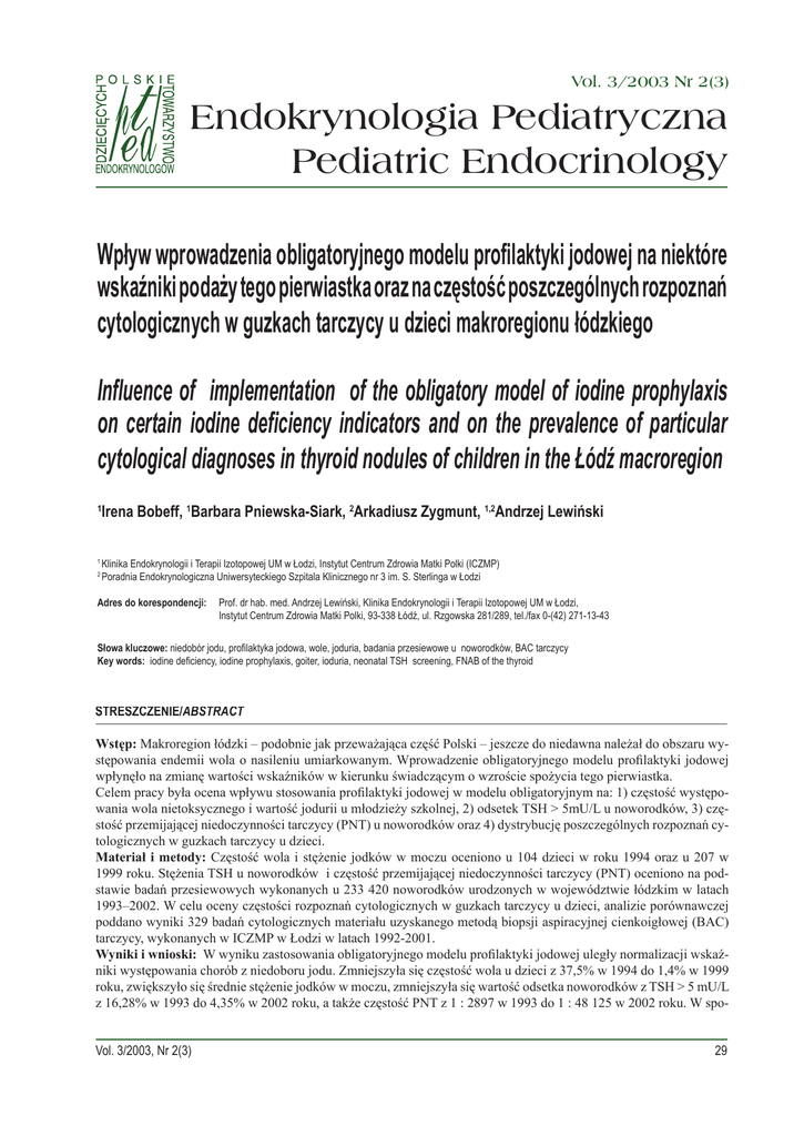 Vol. 3/2003 Nr 2(3) Endokrynologia Pediatryczna Pediatric Endocrinology Wpływ wprowadzenia obligatoryjnego modelu profilaktyki jodowej na niektóre wskaźniki podaży tego pierwiastka oraz na częstość poszczególnych rozpoznań cytologicznych w guzkach tarczycy u dzieci makroregionu łódzkiego Influence of implementation of the obligatory model of iodine prophylaxis on certain iodine deficiency indicators and on the prevalence of particular cytological diagnoses in thyroid nodules of children in the Łódź macroregion 1 Irena Bobeff, 1Barbara Pniewska-Siark, 2Arkadiusz Zygmunt, 1,2Andrzej Lewiński 1 Klinika Endokrynologii i Terapii Izotopowej UM w Łodzi, Instytut Centrum Zdrowia Matki Polki (ICZMP) Poradnia Endokrynologiczna Uniwersyteckiego Szpitala Klinicznego nr 3 im. S. Sterlinga w Łodzi 2 Adres do korespondencji: Prof. dr hab. med. Andrzej Lewiński, Klinika Endokrynologii i Terapii Izotopowej UM w Łodzi, Instytut Centrum Zdrowia Matki Polki, 93-338 Łódź, ul. Rzgowska 281/289, tel./fax 0-(42) 271-13-43 Słowa kluczowe: niedobór jodu, profilaktyka jodowa, wole, joduria, badania przesiewowe u noworodków, BAC tarczycy Key words: iodine deficiency, iodine prophylaxis, goiter, ioduria, neonatal TSH screening, FNAB of the thyroid STRESZCZENIE/ STRESZCZENIE/ABSTRACT Wstęp: Makroregion łódzki – podobnie jak przeważająca część Polski – jeszcze do niedawna należał do obszaru występowania endemii wola o nasileniu umiarkowanym. Wprowadzenie obligatoryjnego modelu profilaktyki jodowej wpłynęło na zmianę wartości wskaźników w kierunku świadczącym o wzroście spożycia tego pierwiastka. Celem pracy była ocena wpływu stosowania profilaktyki jodowej w modelu obligatoryjnym na: 1) częstość występowania wola nietoksycznego i wartość jodurii u młodzieży szkolnej, 2) odsetek TSH > 5mU/L u noworodków, 3) częstość przemijającej niedoczynności tarczycy (PNT) u noworodków oraz 4) dystrybucję poszczególnych rozpoznań cytologicznych w guzkach tarczycy u dzieci. Materiał i metody: Częstość wola i stężenie jodków w moczu oceniono u 104 dzieci w roku 1994 oraz u 207 w 1999 roku. Stężenia TSH u noworodków i częstość przemijającej niedoczynności tarczycy (PNT) oceniono na podstawie badań przesiewowych wykonanych u 233 420 noworodków urodzonych w województwie łódzkim w latach 1993–2002. W celu oceny częstości rozpoznań cytologicznych w guzkach tarczycy u dzieci, analizie porównawczej poddano wyniki 329 badań cytologicznych materiału uzyskanego metodą biopsji aspiracyjnej cienkoigłowej (BAC) tarczycy, wykonanych w ICZMP w Łodzi w latach 1992-2001. Wyniki i wnioski: W wyniku zastosowania obligatoryjnego modelu profilaktyki jodowej uległy normalizacji wskaźniki występowania chorób z niedoboru jodu. Zmniejszyła się częstość wola u dzieci z 37,5% w 1994 do 1,4% w 1999 roku, zwiększyło się średnie stężenie jodków w moczu, zmniejszyła się wartość odsetka noworodków z TSH > 5 mU/L z 16,28% w 1993 do 4,35% w 2002 roku, a także częstość PNT z 1 : 2897 w 1993 do 1 : 48 125 w 2002 roku. W spoVol. 3/2003, Nr 2(3) 29 Praca oryginalna Endokrynol. Ped., 3/2003;2(3):29-35 sób istotny zmienił się rozkład poszczególnych rozpoznań cytologicznych chorób tarczycy: zaobserwowano wzrost częstości występowania przewlekłego zapalenia tarczycy i obniżenie częstości rozpoznań gruczolaków pęcherzykowych. Introduction: Not long ago, the Łódź macroregion, similarly as the prevailing part of the territory of Poland, was an area of goitre endemia of moderate degree. The introduction of the obligatory model of iodine prophylaxis significantly improved the indices of iodine intake. The aim of the study was an evaluation of the influence of the obligatory iodine prophylaxis application on 1) the prevalence of non-toxic goitre and ioduria in schoolchildren aged 7–15 years, 2) the percentage of TSH > 5 mU/L in newborns, 3) the prevalence of transient hypothyroidism (TH) in newborns, and 4) the distribution of particular cytological diagnoses of thyroid nodules in children. Material and methods: Goitre prevalence and urine iodine concentrations were assessed in 104 children in 1994 and in 207 children in 1999. TSH concentrations in newborns and the prevalence of TH were determined on the basis of screening of 233,420 newborns from the Łódź macroregion during the years 1993–2002. In order to evaluate the distribution of cytological diagnoses of thyroid nodules in children, a comparative analysis was done of the results of 329 fine-needle aspiration biopsies (FNAB) of the thyroid, performed at the Polish Mother’s Memorial Hospital in Łódź during 1992–2001. Results and conclusions: The application of household salt iodization normalized the prevalence of disorders caused by iodine deficiency. The prevalence of goitre in children decreased from 37.5 % in 1994 to 1.4 % in 1999, the mean urine iodide concentration increased, the percentage of newborns with TSH > 5 mU/L decreased from 16.28 % in 1993 to 4.35 % in 2002, as well as the prevalence of TH from 1:2,897 in 1993 to 1:48,125 in 2002. The distribution of particular cytological diagnoses of thyroid diseases changed significantly: an increased prevalence of chronic thyroiditis and decreased frequency of follicular adenoma were observed. between leptin level and BMI (r = 0.75 p < 0.01) was stated. In AN no relationships were found between serum leptin and LH, FSH, E2 and PRL. After 2–3 months of therapy (diet, psychotherapy) the mean serum leptin level in AN (group II) had increased significantly (p < 0.05) to 6.02 ± 5.06 ng/ml, BMI to 18.08 ± 1.6 kg/m2 and FSH from 3.266 ± 2.51 to 8.51 ± 4.8 mIU/ml. Conclusions. Low serum leptin concentration and lack of its correlation with BMI gives an evidence of disturbed regulation of leptin secretion in patients with AN and extremely low body mass. Short-term treatment of patients with AN increased serum leptin co