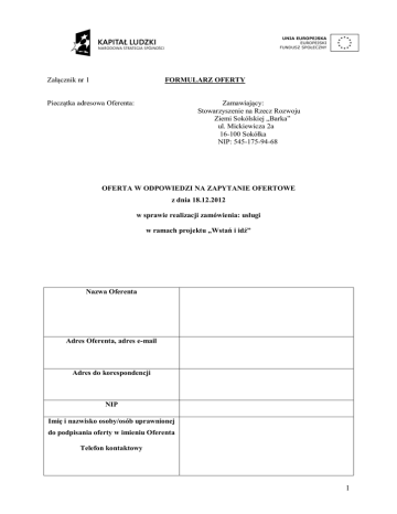 Załącznik nr 1 FORMULARZ OFERTY Pieczątka adresowa Oferenta: Zamawiający: Stowarzyszenie na Rzecz Rozwoju Ziemi Sokólskiej „Barka” ul. Mickiewicza 2a 16-100 Sokółka NIP: 545-175-94-68 OFERTA W ODPOWIEDZI NA ZAPYTANIE OFERTOWE z dnia 18.12.2012 w sprawie realizacji zamówienia: usługi w ramach projektu „Wstań i idź” Nazwa Oferenta Adres Oferenta, adres e-mail Adres do korespondencji NIP Imię i nazwisko osoby/osób uprawnionej do podpisania oferty w imieniu Oferenta Telefon kontaktowy 1 Przedmiot zamówienia: CENA ŁĄCZNA BRUTTO Wynajem pomieszczenia na ………………………………………………… szkolenie: Indywidualne Plany Działania - psycholog 150 godz. Słownie: ………………………………………………………… ……………………………………………….. Przedmiot zamówienia: CENA ŁĄCZNA BRUTTO Wynajem pomieszczenia na ………………………………………………… szkolenie: Indywidualne Plany Działania – doradca zawodowy 150 Słownie godz. ………………………………………………………… ……………………………………………….. Przedmiot zamówienia: CENA ŁĄCZNA BRUTTO Wynajem pomieszczenia na ………………………………………………… szkolenie: Poradnictwo psychologiczne i psychospołeczne Słownie 395 godz. ………………………………………………………… ……………………………………………….. Przedmiot zamówienia: CENA ŁĄCZNA BRUTTO Wynajem pomieszczenia na ………………………………………………… szkolenie: Poradnictwo zawodowe 395 godz. Słownie ………………………………………………………… ……………………………………………….. Przedmiot zamówienia: CENA ŁĄCZNA BRUTTO Wynajem pomieszczenia na ………………………………………………… szkolenie: z przedsiębiorczości 48 godz. Słownie: ………………………………………………………… ……………………………………………….. Przedmiot zamówienia: CENA ŁĄCZNA BRUTTO Wynajem pomieszczenia na ………………………………………………… szkolenie: komputerowe 48 godz. Słownie: ………………………………………………………… ……………………………………………….. 2 CENA ŁĄCZNA BRUTTO Przedmiot zamówienia: Wynajem pomieszczenia na ………………………………………………… szkolenie: „Opiekunka dziecięca” 50 godz. Słownie: ………………………………………………………… ……………………………………………….. CENA ŁĄCZNA BRUTTO Przedmiot zamówienia: Wynajem pomieszczenia szkolenie: „Opiekunka starszych” 64 godz. na ………………………………………………… osób Słownie: ………………………………………………………… ……………………………………………….. CENA ŁĄCZNA BRUTTO Przedmiot zamówienia: Wynajem pomieszczenia szkolenie: z florystyki 228 godz. na ………………………………………………… Słownie: ………………………………………………………… ……………………………………………….. Przedmiot zamówienia: CENA ŁĄCZNA BRUTTO Wynajem pomieszczenia na ………………………………………………… szkolenie: z rękodzieła ludowego 156 godz. Słownie: ………………………………………………………… ……………………………………………….. Przedmiot zamówienia: CENA ŁĄCZNA BRUTTO Wynajem pomieszczenia na ………………………………………………… szkolenie: z ogrodnictwa 168 godz. Słownie: ………………………………………………………… ……………………………………………….. Przedmiot zamówienia: CENA ŁĄCZNA BRUTTO Wynajem pomieszczenia na ………………………………………………… szkolenie: Warsztaty komunikacji społecznej 80 godz. Słownie: ………………………………………………………… ……………………………………………….. …………………………… Miejscowość, data …………………………………... Pieczątka i podpis osoby/osób uprawnionej do podpisania oferty w imieniu Oferenta 3