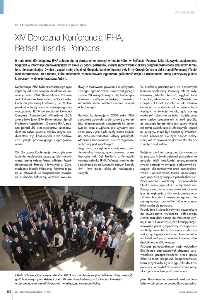 WYDARZENIA IPHA International Prestressed Hollowcore Association XIV Doroczna Konferencja IPHA, Belfast, Irlandia Północna 9 maja około 50 delegatów IPHA zebrało się na dorocznej konferencji w hotelu Hilton w Belfaście. Podczas kilku niezwykle przyjemnych, bogatych w informacje dni towarzyszyło im około 25 gości i partnerów, którym zaoferowano ciekawy program poświęcony aktualnym tematom, nie zapominając również o części mniej oficjalnej. Gospodarzami konferencji były firmy Creagh Concrete Ltd z Irlandii Północnej i Techmart International Ltd z Irlandii, które znakomicie zaprezentowały legendarną gościnność kraju i z uzasadnioną dumą pokazywały piękne krajobrazy i wybrzeże hrabstwa Antrim. Konferencja IPHA była czternastą tego typu imprezą od rozpoczęcia działalności stowarzyszenia IPHA (International Prestressed Hollowcore Association) w 1993 roku, kiedy na pierwszej konferencji na Malcie przekształciło się ono z wcześniejszego stowarzyszenia IECA (International Extruded Concrete Association). Wcześniej IECA znane było jako ISPA (International Spiroll Producers Association). Obecnie IPHA zrzesza ponad 50 przedsiębiorstw członkowskich na całym świecie, między innymi producentów płyt kanałowych oraz dostawców sprzętu produkcyjnego i oprogramowania. XIV Doroczną Konferencję otworzyło wystąpienie wygłoszone przez gościa honorowego, panią Arlene Foster, Minister Przedsiębiorczości, Handlu i Inwestycji w Zgromadzeniu Irlandii Północnej. Pomimo tego, że jej obowiązki są bezpośrednio związane z Irlandią Północną, wyraziła swój za- chwyt z możliwości powitania międzynarodowego zgromadzenia reprezentującego prawie 20 różnych krajów. Jej trafne spostrzeżenia polityka wysokiego szczebla wzbudziły duże zainteresowanie wszystkich obecnych. Planując konferencję w 2009 roku IPHA doskonale zdawało sobie sprawę z warunków ekonomicznych panujących na całym świecie oraz z wpływu, jaki wywarły one do tej pory i jaki będą miały przez najbliższy czas na wszystkie sektory przemysłu włącznie z budowlanym, a w szczególności na branżę płyt kanałowych. Program rozpoczął się w sobotę wieczorem nieformalną kolacją, sponsorowaną przez Fapricela Ind. Del Trefilaria z Portugalii, nowego członka IPHA. Wieczór stał się idealną okazją do odświeżenia starych kontaktów i być może także do nawiązania nowych. Około 50 delegatów wzięło udział w XIV Dorocznej Konferencji w Belfaście, którą otworzył gość honorowy - pani Arlene Foster, Minister Przedsiębiorczości, Handlu i Inwestycji w Zgromadzeniu Irlandii Północnej - wygłaszając mowę powitalną. 152 ZBI – Zakłady Betonowe International – 4 | 2009 W niedzielę przystąpiono do poważnych tematów konferencji. Pierwszy referat, zatytułowany „Idealna burza”, wygłosił John Compton, ekonomista z Price Waterhouse Coopers. Opisał sposób, w jaki idealna burza może podobnie jak w meteorologii wystąpić w świecie handlu, gdy szereg wydarzeń splata się ze sobą i każde potęguje wpływ pozostałych w taki sposób, że powstaje burza, która jest czymś więcej niż sumą swoich części składowych i przez to jej wpływ może być niszczący. Przedstawiona koncepcja nie była nowym odkryciem, ale zapewniła adekwatne tło dla pozostałych wykładów. Kolejnym punktem programu były warsztaty, podczas których delegaci podzieleni na zespoły mieli możliwość sprecyzowania swoich strategii w związku z obecnymi nastrojami ekonomicznymi oraz przedyskutowania i opracowania metod umożliwiających poprawę sytuacji ich przedsiębiorstw. Profesjonalne warsztaty poprowadziła Nuala Forsey, specjalistka w tej dziedzinie. Rosnący entuzjazm uczestników świadczył o tym, że większość z nich wyciągnęła z warsztatów korzyści i zapewne zgromadziła szereg nowych pomysłów, które w przyszłości okażą się pomocne. Popołudnie i wieczór upłynęły uczestnikom na zwiedzaniu wybrzeża północnego Antrim oraz dały okazję do obejrzenia słynnej Giant’s Causeway przed kolacją zorganizowaną przez gospodarzy w miejscowości Ballycastle. Ku zaskoczeniu chyba nawet samych gospodarzy bezchmurne niebo rozświetlone było promieniami słońca, które dodatkowo umiliło wieczór. Podczas poniedziałkowej sesji wykładów Erik Remels zaprezentował obszerne sprawozdanie przeprowadzone przez grupę Echo na temat ich polityki bezpieczeństwa, która przyczyniła się w ciągu roku do 48% poprawy i wzbudziła zainteresowanie wszystkich producentów płyt kanałowych. Julien Boucheseche, kierownik zakładu firmy Echo w Luksemburgu szczegółowo przedstawww.cpi-worldwide.com WYDARZENIA wił wpływ nowych europejskich przepisów transportowych na sposób przewożenia płyt kanałowych oraz metody wyliczania i wdrażania zabezpieczeń ładunków. Zwrócono uwagę na fakt, że przepisy europejskie mogą w najbliższym czasie wpłynąć także na inne branże. Aad Van Paassen zaprezentował najnowsze informacje na temat badań i dyskusji związanych z ognioodpornością płyt kanałowych – kluczową wiedzę dla wszystkich projektantów. IPHA z radością powitała dwóch nowych członków na ich pierwszej konferencji. Każdy z nich dokonał perfekcyjnej autoprezentacji z naciskiem na zakres oferowanych produktów i usług. John Potter z PreCAD zaprezentował siebie i swoją firmę przedstawiając oprogramowanie dopasowane do indywidualnych potrzeb producentów płyt kanałowych, a Alberto Piret z SP Steel przybliżył działalność swojego przedsiębiorstwa jako dostawcy drutów i cięgien sprężających. Fapricela i Precast Concrete PTY Ltd z Australii, które wzięły udział w konferencji jako goście, potwierdziły swoje wnioski o wstąpienie do IPHA i już zostały powitane jak nowi członkowie. Co roku przyznawana jest nagroda TT za najlepszy przykład innowacji w produkcji lub zastosowaniu prefabrykowanych płyt kanałowych