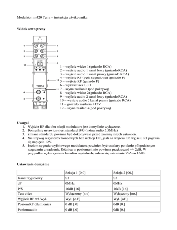 Modulator mt420 Terra – instrukcja użytkownika Widok zewnętrzny 1 – wejście wideo 1 (gniazdo RCA) 2 – wejście audio 1 kanał lewy (gniazdo RCA) 3 – wejście audio 1 kanał prawy (gniazdo RCA) 4 – wejście RF (pętla sygnałowa) (gniazdo F) 5 – wyjście RF (gniazdo F) 6 – wyświetlacz LED 7 – szyna zasilania (pod pokrywą) 8 – wejście wideo 2 (gniazdo RCA) 9 – wejście audio 2 kanał lewy (gniazdo RCA) 10 – wejście audio 2 kanał prawy (gniazdo RCA) 11 – gniazdo zasilania +12V 12 – szyna zasilania (pod pokrywą) Uwaga! 1. Wyjście RF dla obu sekcji modulatora jest domyślnie wyłączone. 2. Domyślnie ustawiony jest standard B/G (nośna audio 5.5MHz) 3. Zmiana standardu powinna być dokonywana przed zmianą innych ustawień. 4. Nie używaj rezystorów końcowych bez izolacji DC, jeśli na wejściu lub wyjściu RF pojawia się napięcie 12V. 5. Poziom sygnału wyjściowego modulatora powinien być ustalany po około półgodzinnym rozgrzaniu urządzenia. Różnica w poziomach nie powinna przekraczać +/- 2dB. W przypadku wykorzystania kanałów sąsiednich, zaleca się ustawienie V/A na 16dB. Ustawienia domyślne Sekcja 1 [0.0] Sekcja 2 [00.] Kanał wyjściowy S3 S3 dF 0MHz 0MHz P/S 16dB [16] 16dB [16] Test video Wyłączony [n.o] Wyłączony [no.] Wyjście RF wł./wył. Wył. [o.F] Wył. [oF.] Poziom RF (tłumienie) 0 dB [.0] 0dB [0.] Poziom audio 0 dB [.0] 0dB [0.] Tryb audio (mt420C) Mono [A.-] Mono [A-.] Standard TV B/G [b3] B/G [b3] Blokada panelu Aby zablokować (symbol L0) lub odblokować panel (UL) należy wcisnąć jednocześnie, dwukrotnie w ciągu 0,5 sekundy przyciski UP (góra) oraz DOWN (dół). Konfiguracja: Wzmacniacz pracuje w dwóch trybach: 1. Tryb normalny (po włączeniu) numer kanał wyjściowego może być wybrany poprzez przyciski góra/dół (zakres 21-69) 2. Tryb ustawień Aby wejść do trybu ustawień należy należy wcisnąć i przytrzymać oba przycisku przez 1 sekundę. Aby wyjść z trybu ustawień należy powtórzyć tę czynność. Menu dla każdej sekcji wybierane jest przy pomocy przycisku Enter. Przykład: '6.5' – sekcja 1, kanał 65; 69. - sekcja 2, kanał 69 położenie kropki identyfikuje sekcję Przycisk „w dół” służy do wyboru odpowiedniego parametru, natomiast przycisk „w górę” służy do nadania mu odpowiedniej wartości. Wybór standardu TV