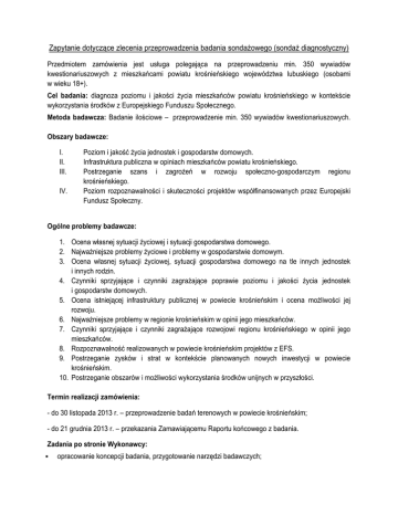 Zapytanie dotyczące zlecenia przeprowadzenia badania sondażowego (sondaż diagnostyczny) Przedmiotem zamówienia jest usługa polegająca na przeprowadzeniu min. 350 wywiadów kwestionariuszowych z mieszkańcami powiatu krośnieńskiego województwa lubuskiego (osobami w wieku 18+). Cel badania: diagnoza poziomu i jakości życia mieszkańców powiatu krośnieńskiego w kontekście wykorzystania środków z Europejskiego Funduszu Społecznego. Metoda badawcza: Badanie ilościowe – przeprowadzenie min. 350 wywiadów kwestionariuszowych. Obszary badawcze: I. II. III. IV. Poziom i jakość życia jednostek i gospodarstw domowych. Infrastruktura publiczna w opiniach mieszkańców powiatu krośnieńskiego. Postrzeganie szans i zagrożeń w rozwoju społeczno-gospodarczym regionu krośnieńskiego. Poziom rozpoznawalności i skuteczności projektów współfinansowanych przez Europejski Fundusz Społeczny. Ogólne problemy badawcze: 1. Ocena własnej sytuacji życiowej i sytuacji gospodarstwa domowego. 2. Najważniejsze problemy życiowe i problemy w gospodarstwie domowym. 3. Ocena własnej sytuacji życiowej, sytuacji gospodarstwa domowego na tle innych jednostek i innych rodzin. 4. Czynniki sprzyjające i czynniki zagrażające poprawie poziomu i jakości życia jednostek i gospodarstw domowych. 5. Ocena istniejącej infrastruktury publicznej w powiecie krośnieńskim i ocena możliwości jej rozwoju. 6. Najważniejsze problemy w regionie krośnieńskim w opinii jego mieszkańców. 7. Czynniki sprzyjające i czynniki zagrażające rozwojowi regionu krośnieńskiego w opinii jego mieszkańców. 8. Rozpoznawalność realizowanych w powiecie krośnieńskim projektów z EFS. 9. Postrzeganie zysków i strat w kontekście planowanych nowych inwestycji w powiecie krośnieńskim. 10. Postrzeganie obszarów i możliwości wykorzystania środków unijnych w przyszłości. Termin realizacji zamówienia: - do 30 listopada 2013 r. – przeprowadzenie badań terenowych w powiecie krośnieńskim; - do 21 grudnia 2013 r. – przekazania Zamawiającemu Raportu końcowego z badania. Zadania po stronie Wykonawcy: opracowanie koncepcji badania, przygotowanie narzędzi badawczych; wyłonienie jednostek do próby badawczej zgodnie z ustaloną strukturą (próba kwotowo-losowa z uwzględnieniem struktury demograficznej w powiecie krośnieńskim – płci, wieku, miejsca zamieszkania), szkolenie ankieterów koordynacja i kontrola pracy ankieterów druk ankiet, materiałów pomocniczych, instrukcji, kart respondenta oraz dwóch egzemplarzy raportu (w wersji czarno-białej) przeprowadzenie min. 350 wywiadów kwestionariuszowych, przygotowanie Raportu końcowego przekazanie Zamawiającemu wypełnionych kwestionariuszy. Wymagania wobec Oferentów: Podmiot realizujący badanie winien dysponować zapleczem technicznym umożliwiającym wykonanie zadania, w tym m.in. specjalistycznym oprogramowaniem oraz posiadać odpowiednią wiedzę i doświadczenie w zakresie badań socjologicznych. Zamawiający wymaga, aby Oferent posiadał doświadczenie w realizacji badań socjologicznych, a koordynator realizacji całości badania posiadał wykształcenie wyższe oraz co najmniej stopień naukowy w zakresie/specjalności odpowiadającej przedmiotowi realizowanego badania i/lub był autorem lub współautorem minimum 5 publikacji z zakresu badań społecznych. Spełnienie wyżej wymienionych kryteriów należy poprzeć stosownymi informacjami w CV. Oferent w odpowiedzi na niniejsze zapytanie: a) dołączy CV; b) zaproponuje łączną kwotę (brutto), za którą dokona usługi polegającej na przeprowadzeniu min. 350 wywiadów kwestionariuszowych z mieszkańcami powiatu krośnieńskiego województwa lubuskiego oraz przedstawi stosowny kosztorys szczegółowy (uwzględniający wykonanie wszystkich prac i czynności oraz zawierający wszelkie koszty związane z realizacją zamówienia, np. wszelkie koszty związane z przeprowadzeniem ankiet, koszt koordynacji badania, wynagrodzenie dla ankieterów, koszty dojazdów itp.). Kryterium oceny ofert: 100 % cena (wartość brutto dla całości przedmiotu zamówienia). Odpowiedź na niniejsze zapytanie proszę przesłać drogą elektroniczną, na adres e-mail: [email protected], bądź do sekretariatu Departamentu Europejskiego Funduszu Społecznego, ul. Braci Gierymskich 99A, do dnia 22.11.2013 r. Jednocześnie informuję, iż jest to badanie rynku, które nie zobowiązuje do zawarcia umowy. Wszelkich dodatkowych informacji w zakresie przedmiotowego zapytania udziela Pani Magdalena Witkiewicz (nr tel. 068-456 53 15, adres e-mail: [email protected]).