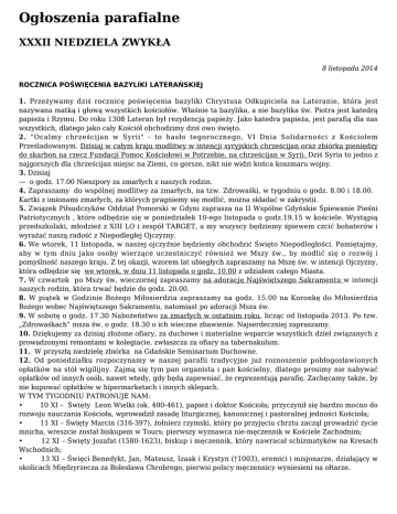 Ogłoszenia parafialne XXXII NIEDZIELA ZWYKŁA 8 listopada 2014 ROCZNICA POŚWIĘCENIA BAZYLIKI LATERAŃSKIEJ 1. Przeżywamy dziś rocznicę poświęcenia bazyliki Chrystusa Odkupiciela na Lateranie, która jest nazywana matką i głową wszystkich kościołów. Właśnie ta bazylika, a nie bazylika św. Piotra jest katedrą papieża i Rzymu. Do roku 1308 Lateran był rezydencją papieży. Jako katedra papieża, jest parafią dla nas wszystkich, dlatego jako cały Kościół obchodzimy dziś owo święto. 2. "Ocalmy chrześcijan w Syrii" - to hasło tegorocznego, VI Dnia Solidarności z Kościołem Prześladowanym. Dzisiaj w całym kraju modlitwy w intencji syryjskich chrześcijan oraz zbiórka pieniędzy do skarbon na rzecz Fundacji Pomoc Kościołowi w Potrzebie, na chrześcijan w Syrii. Dziś Syria to jedno z najgorszych dla chrześcijan miejsc na Ziemi, co gorsze, nikt nie widzi końca koszmaru wojny. 3. Dzisiaj — o godz. 17.00 Nieszpory za zmarłych z naszych rodzin. 4. Zapraszamy do wspólnej modlitwy za zmarłych, na tzw. Zdrowaśki, w tygodniu o godz. 8.00 i 18.00. Kartki z imionami zmarłych, za których pragniemy się modlić, można składać w zakrystii. 5. Związek Piłsudczyków Oddział Pomorski w Gdyni zaprasza na II Wspólne Gdyńskie Śpiewanie Pieśni Patriotycznych , które odbędzie się w poniedziałek 10-ego listopada o godz.19.15 w kościele. Wystąpią przedszkolaki, młodzież z XIII LO i zespół TARGET, a my wszyscy będziemy śpiewem czcić bohaterów i wyrażać naszą radość z Niepodległej Ojczyzny. 6. We wtorek, 11 listopada, w naszej ojczyźnie będziemy obchodzić Święto Niepodległości. Pamiętajmy, aby w tym dniu jako osoby wierzące uczestniczyć również we Mszy św., by modlić się o rozwój i pomyślność naszego kraju. Z tej okazji, wzorem lat ubiegłych zapraszamy na Mszę św. w intencji Ojczyzny, która odbędzie się we wtorek, w dniu 11 listopada o godz. 10.00 z udziałem całego Miasta. 7. W czwartek po Mszy św. wieczornej zapraszamy na adorację Najświętszego Sakramentu w intencji naszych rodzin, która trwać będzie do godz. 20.00. 8. W piątek w Godzinie Bożego Miłosierdzia zapraszamy na godz. 15.00 na Koronkę do Miłosierdzia Bożego wobec Najświętszego Sakramentu, natomiast po adoracji Msza św. 9. W sobotę o godz. 17.30 Nabożeństwo za zmarłych w ostatnim roku, licząc od listopada 2013. Po tzw. „Zdrowaśkach” msza św. o godz. 18.30 o ich wieczne zbawienie. Najserdeczniej zapraszamy. 10. Dziękujemy za dzisiaj złożone ofiary, za duchowe i materialne wsparcie wszystkich dzieł związanych z prowadzonymi remontami w kolegiacie, zwłaszcza za ofiary na tabernakulum. 11. W przyszłą niedzielę zbiórka na Gdańskie Seminarium Duchowne. 12. Od poniedziałku rozpoczynamy w naszej parafii tradycyjne już roznoszenie pobłogosławionych opłatków na stół wigilijny. Zajmą się tym pan organista i pan kościelny, dlatego prosimy nie nabywać opłatków od innych osób, nawet wtedy, gdy będą zapewniać, że reprezentują parafię. Zachęcamy także, by nie kupować opłatków w hipermarketach i innych sklepach. W TYM TYGODNIU PATRONUJE NAM: • 10 XI – Święty Leon Wielki (ok. 400-461), papież i doktor Kościoła; przyczynił się bardzo mocno do rozwoju nauczania Kościoła, wprowadził zasadę liturgicznej, kanonicznej i pastoralnej jedności Kościoła; • 11 XI – Święty Marcin (316-397), żołnierz rzymski, który po przyjęciu chrztu zaczął prowadzić życie mnicha, wreszcie został biskupem w Tours; pierwszy wyznawca nie-męczennik w Kościele Zachodnim; • 12 XI – Święty Jozafat (1580-1623), biskup i męczennik, który nawracał schizmatyków na Kresach Wschodnich; • 13 XI – Święci Benedykt, Jan, Mateusz, Izaak i Krystyn (†1003), eremici i misjonarze, działający w okolicach Międzyrzecza za Bolesława Chrobrego, pierwsi polscy męczennicy wyniesieni na ołtarze.