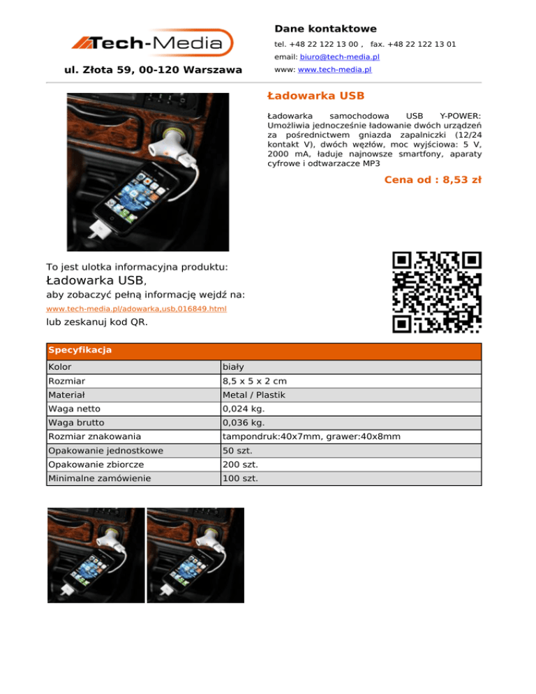 Dane kontaktowe tel. +48 22 122 13 00 , fax. +48 22 122 13 01 email: [email protected] ul. Złota 59, 00-120 Warszawa www: www.tech-media.pl Ładowarka USB Ładowarka samochodowa USB Y-POWER: Umożliwia jednocześnie ładowanie dwóch urządzeń za pośrednictwem gniazda zapalniczki (12/24 kontakt V), dwóch węzłów, moc wyjściowa: 5 V, 2000 mA, ładuje najnowsze smartfony, aparaty cyfrowe i odtwarzacze MP3 Cena od : 8,53 zł To jest ulotka informacyjna produktu: Ładowarka USB, aby zobaczyć pełną informację wejdź na: www.tech-media.pl/adowarka,usb,016849.html lub zeskanuj kod QR. Specyfikacja Kolor biały Rozmiar 8,5 x 5 x 2 cm Materiał Metal / Plastik Waga netto 0,024 kg. Waga brutto 0,036 kg. Rozmiar znakowania tampondruk:40x7mm, grawer:40x8mm Opakowanie jednostkowe 50 szt. Opakowanie zbiorcze 200 szt. Minimalne zamówienie 100 szt.