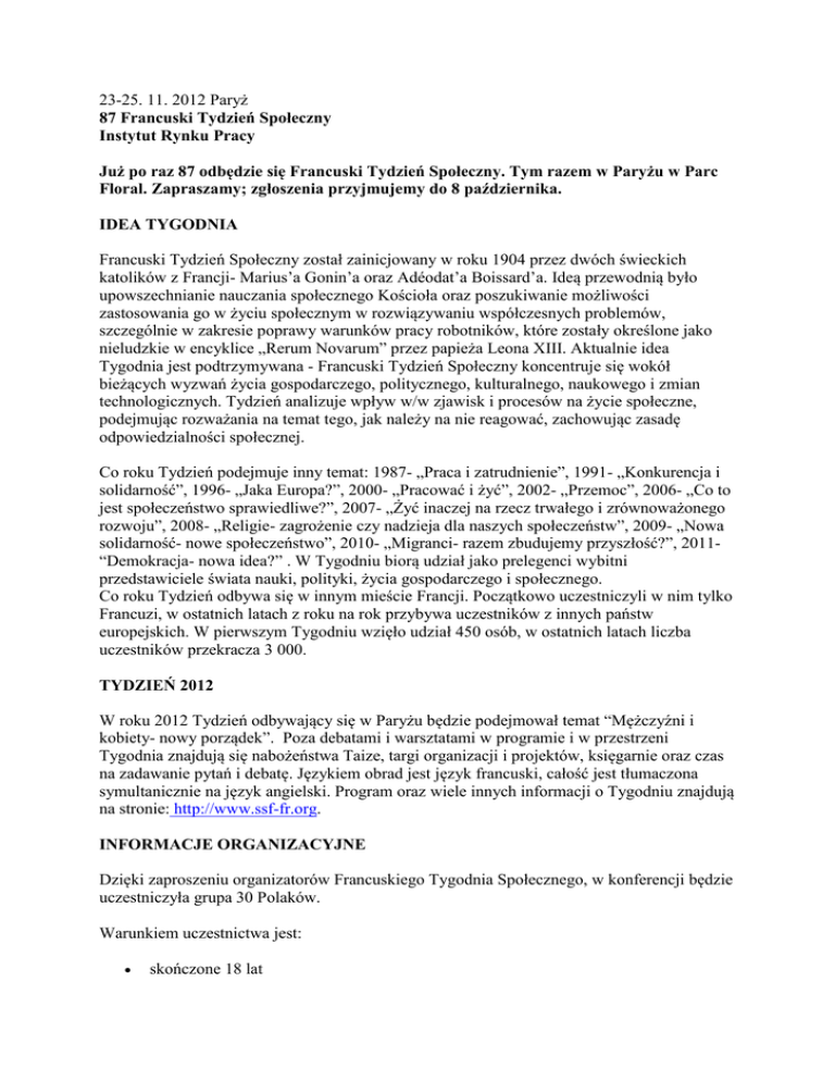 23-25. 11. 2012 Paryż 87 Francuski Tydzień Społeczny Instytut Rynku Pracy Już po raz 87 odbędzie się Francuski Tydzień Społeczny. Tym razem w Paryżu w Parc Floral. Zapraszamy; zgłoszenia przyjmujemy do 8 października. IDEA TYGODNIA Francuski Tydzień Społeczny został zainicjowany w roku 1904 przez dwóch świeckich katolików z Francji- Marius’a Gonin’a oraz Adéodat’a Boissard’a. Ideą przewodnią było upowszechnianie nauczania społecznego Kościoła oraz poszukiwanie możliwości zastosowania go w życiu społecznym w rozwiązywaniu współczesnych problemów, szczególnie w zakresie poprawy warunków pracy robotników, które zostały określone jako nieludzkie w encyklice „Rerum Novarum” przez papieża Leona XIII. Aktualnie idea Tygodnia jest podtrzymywana - Francuski Tydzień Społeczny koncentruje się wokół bieżących wyzwań życia gospodarczego, politycznego, kulturalnego, naukowego i zmian technologicznych. Tydzień analizuje wpływ w/w zjawisk i procesów na życie społeczne, podejmując rozważania na temat tego, jak należy na nie reagować, zachowując zasadę odpowiedzialności społecznej. Co roku Tydzień podejmuje inny temat: 1987- „Praca i zatrudnienie”, 1991- „Konkurencja i solidarność”, 1996- „Jaka Europa?”, 2000- „Pracować i żyć”, 2002- „Przemoc”, 2006- „Co to jest społeczeństwo sprawiedliwe?”, 2007- „Żyć inaczej na rzecz trwałego i zrównoważonego rozwoju”, 2008- „Religie- zagrożenie czy nadzieja dla naszych społeczeństw”, 2009- „Nowa solidarność- nowe społeczeństwo”, 2010- „Migranci- razem zbudujemy przyszłość?”, 2011“Demokracja- nowa idea?” . W Tygodniu biorą udział jako prelegenci wybitni przedstawiciele świata nauki, polityki, życia gospodarczego i społecznego. Co roku Tydzień odbywa się w innym mieście Francji. Początkowo uczestniczyli w nim tylko Francuzi, w ostatnich latach z roku na rok przybywa uczestników z innych państw europejskich. W pierwszym Tygodniu wzięło udział 450 osób, w ostatnich latach liczba uczestników przekracza 3 000. TYDZIEŃ 2012 W roku 2012 Tydzień odbywający się w Paryżu będzie podejmował temat “Mężczyźni i kobiety- nowy porządek”. Poza debatami i warsztatami w programie i w przestrzeni Tygodnia znajdują się nabożeństwa Taize, targi organizacji i projektów, księgarnie oraz czas na zadawanie pytań i debatę. Językiem obrad jest język francuski, całość jest tłumaczona symultanicznie na język angielski. Program oraz wiele innych informacji o Tygodniu znajdują na stronie: http://www.ssf-fr.org. INFORMACJE ORGANIZACYJNE Dzięki zaproszeniu organizatorów Francuskiego Tygodnia Społecznego, w konferencji będzie uczestniczyła grupa 30 Polaków. Warunkiem uczestnictwa jest: skończone 18 lat gotowość do udziału w całości Sesji 22-25 listopada 2012 dobry stan zdrowia pozwalający na podróż autokarem i udział w trzydniowych obradach zainteresowanie tematyką Tygodnia znajomość języka francuskiego lub angielskiego pozwalająca uczestniczyć w obradach wniesienie opłaty w wysokości 250 PLN Organizatorzy zapewniają: bezpłatny transport w obie strony, wyjazd: Lublin w dniu 21.11.2012, powrót w dniu 26.11.2012, udział w sesji Francuskiego Tygodnia Społecznego, zakwaterowanie u rodzin w Paryżu, ubezpieczenie NNW. Uczestnicy zobowiązani są do zapewnienia sobie Europejskiej Karty Ubezpieczenia Zdrowotnego na czas pobytu we Francji (Karta taka jest bezpłatna i można ją otrzymać w lokalnym oddziale Narodowego Funduszu Zdrowia). Chętni mogą zamówić obiad w postaci lunch pakietu (2 kanapki, jogurt, woda) w cenie 39,00 PLN w dniach 23- 25. 11. 2012. Nie jesteśmy w stanie zagwarantować, że rodziny zapewnią śniadania i kolacje, będzie to kwestia indywidualna, należy więc liczyć się z koniecznością pokrycia tego kosztu. Wyjazd w dniu 21 listopada 2012 w godzinach południowych, powrót dnia 26 listopada 2011 późnym wieczorem/nocą. Podróż odbędzie się dobrej jakości autokarem. ZGŁOSZENIA Zgłoszenia na załączonych formularzach przyjmowane są wyłącznie drogą elektroniczną do dnia 8 października 2012 roku. Decyduje kolejność zgłoszeń. Potwierdzenie udziału otrzymają Państwo w dniu 9. 10. 2011 drogą mailową do północy. Wpłaty za uczestnictwo przyjmowane będą do dnia 11. 10. 2011 (data wpłynięcia na konto). Telefon kontaktowy: Anna Moskwa 22 622 27 02 lub 727400873 E-mail: [email protected]