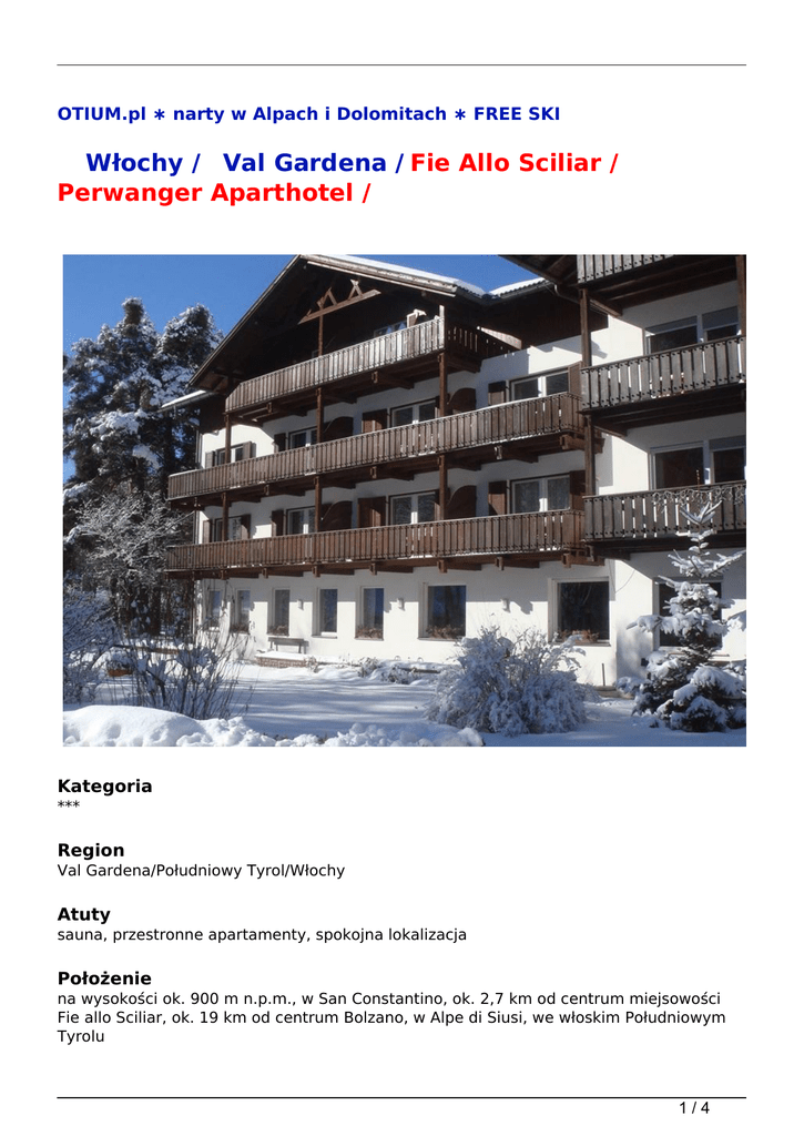 OTIUM.pl ∗ narty w Alpach i Dolomitach ∗ FREE SKI Włochy / Val Gardena / Fie Allo Sciliar / Perwanger Aparthotel / Kategoria *** Region Val Gardena/Południowy Tyrol/Włochy Atuty sauna, przestronne apartamenty, spokojna lokalizacja Położenie na wysokości ok. 900 m n.p.m., w San Constantino, ok. 2,7 km od centrum miejsowości Fie allo Sciliar, ok. 19 km od centrum Bolzano, w Alpe di Siusi, we włoskim Południowym Tyrolu 1/4 Wyciągi narciarskie do najbliższych wyciągów Alpe di Siusi w Siusi (Seis) - Seiser Alm ok. 4,2 km (połączenie trasami i wyciągami z Ortisei i karuzelą narciarską Sella Ronda - Val Gardena-Val di FassaAlta Badia-Arabba), do wyciągu Fumes-Ortistei ok. 19 km. Przystanek skibusa ok. 200 m od obiektu (kursuje do wyciągów w Seis) Wyposażenie recepcja, bar, sala TV, przechowalnia sprzętu narciarskiego, parking (gratis). Obiekt posiada 3 piętra, dysponuje 38 apartamentami Internet tak (Wi-Fi, za opłatą - ok. 1 euro/3 godz.) Karty kredytowe tak (Visa, Mastercard) Sport i relaks sauna, tenis stołowy, pokój zabaw dla dzieci Apartamenty Bilo dla 2-4-os. (ok. 40 m<sup>2</sup>), składa się z sypialni z łóżkiem małżeńskim oraz pokoju dziennego z podwójną rozkładaną sofą, aneksu kuchennego w pełni wyposażonego (naczynia, sztućce, kuchenka, lodówka). Łazienka z WC; TV-sat, telefon, balkon Pieski tak (za opłatą, 8 euro/dzień) Kategoria lokalna *** Świadczenia 7 noclegów, ubezpieczenie Signal Iduna - Bezpieczne Podróże (w tym rekreacyjne uprawianie narciarstwa zjazdowego, biegowego lub snowboardu na oznakowanych trasach zjazdowych) - KL, KR, NNW, i bagażu, opieka włoskiego kontrahenta lub hotelu Uwaga Zalecamy dodatkowe ubezpieczenie OC/SS (w tym sprzęt sportowy) Signal Iduna ok. 35 zł/os./pobyt Dopłaty Dopłata za ubezpieczenie od kosztów rezygnacji 2,4% W cenie prąd, woda, ogrzewanie, bielizna pościelowa i ręczniki 2/4 Obowiązkowe opłaty na miejscu Taksa klimatyczna ok. 1-2,5 euro os./dzień. Sprzątanie końcowe 40 euro/apt. (aneks kuchenny należy posprzątać we własnym zakresie, śmieci należy wyrzucić) Zakwaterowanie przyjazd - od godz. 15.00 wyjazd - do godz. 11.00 Autokar nie Oferta Free Ski nie Promocje Niezmienność ceny - dla rezerwacji potwierdzonych do 30.11.2016. Oferta Early Booking zniżka 3% dla rezerwacji potwierdzonych do 29.11.2016. Oferta 7=6 w terminie 07-21.01.2017. Ceny w systemie uwzględniają promocję data skąd pobyt opis cena / os 11.03.2017 nie dotyczy 7 dni Pokój: Apartament BILO 4 Wyżywienie: bez wyżywienia 651 zł / os 11.03.2017 nie dotyczy 7 dni Pokój: Apartament BILO 3 os. Wyżywienie: bez wyżywienia 840 zł / os 11.03.2017 nie dotyczy 7 dni Pokój: Apartament BILO 2 os. Wyżywienie: bez wyżywienia 1215 zł / os OTIUM POLSKA SP. Z O.O. 30-150 KRAKÓW UL. ARMII KRAJOWEJ 12 lok. 11 tel./fax +48-12.4469214, 12.4469215, 12.4469216, 12.4469217 Zapraszamy poniedziałek-piątek w godzinach 10.00-18.00 (soboty 10.00-14.00 od połowy listopada do połowy kwietnia) E-mail: [email protected] 3/4 Strona Internetowa: www.otium.pl 4/4 Powered by TCPDF (www.tcpdf.org)